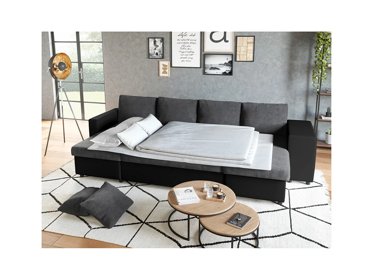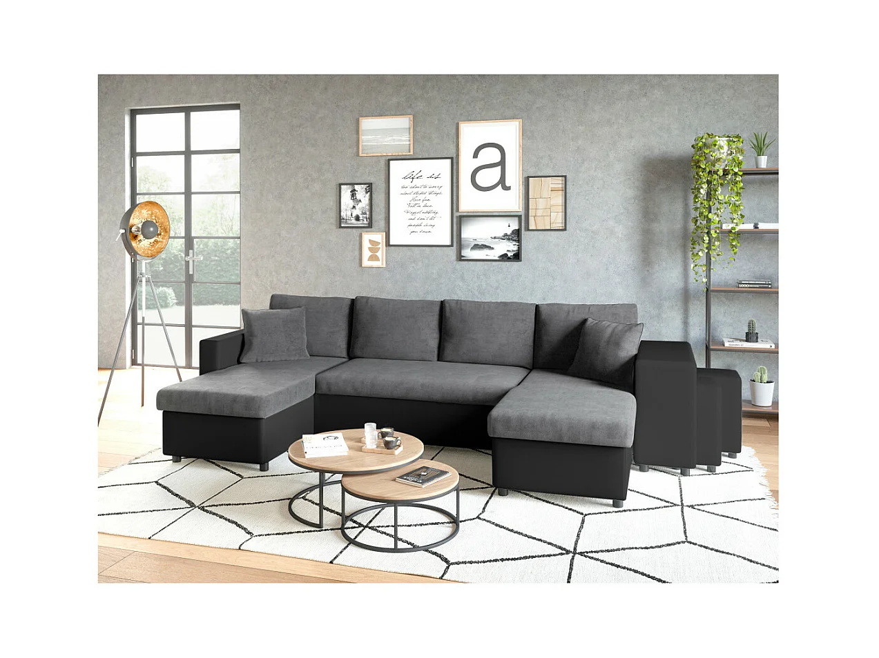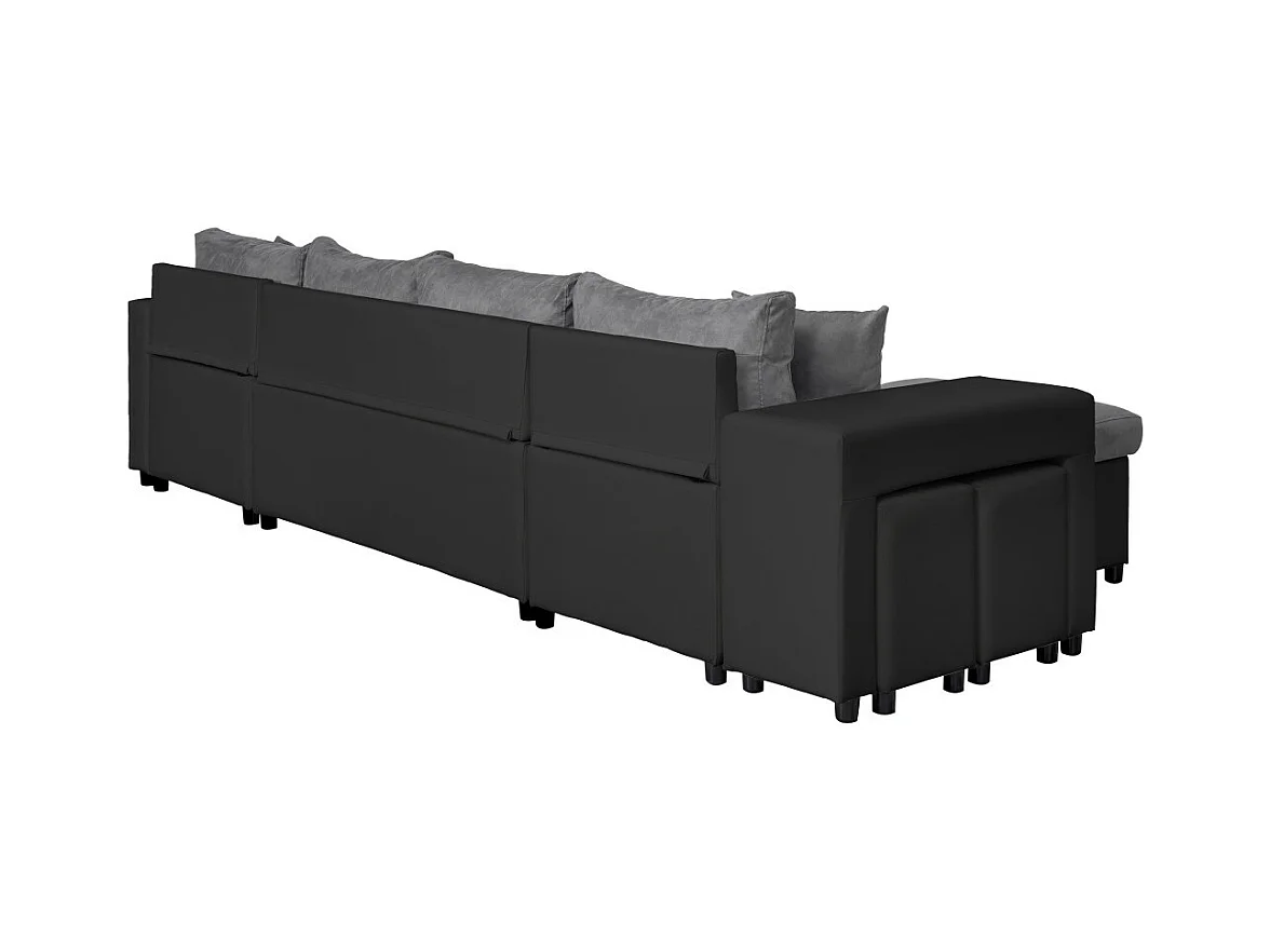 Canapé panoramique Oslo convertible avec coffres, poufs à gauche - Simili/Microfibre - Noir/Gris - L311 x P146 x H81cm - Loungitude
