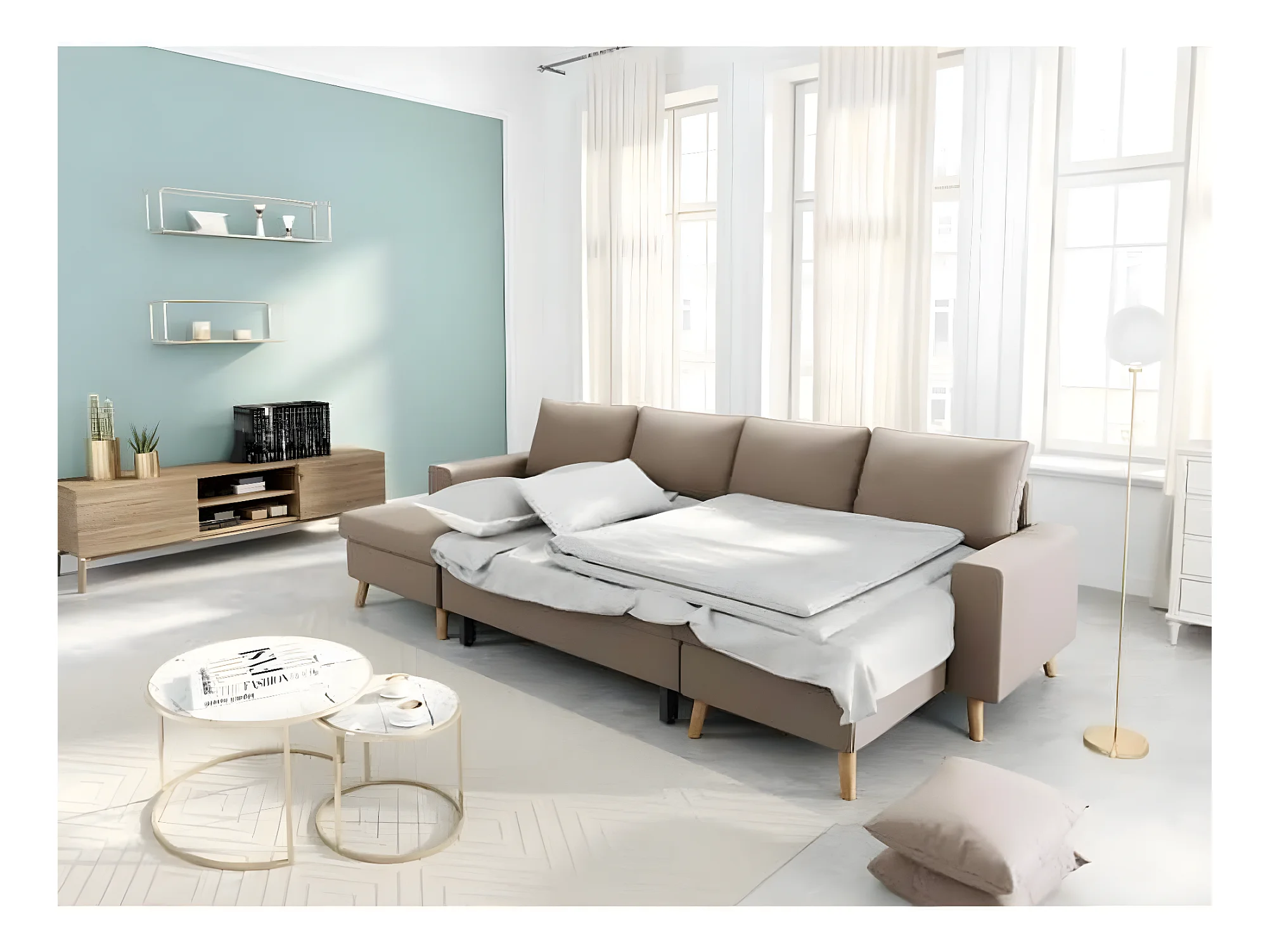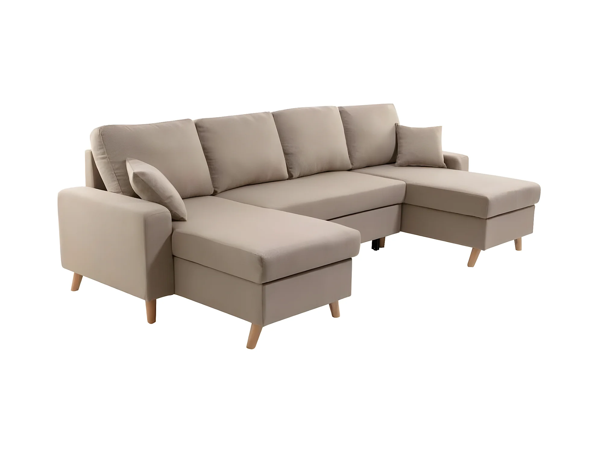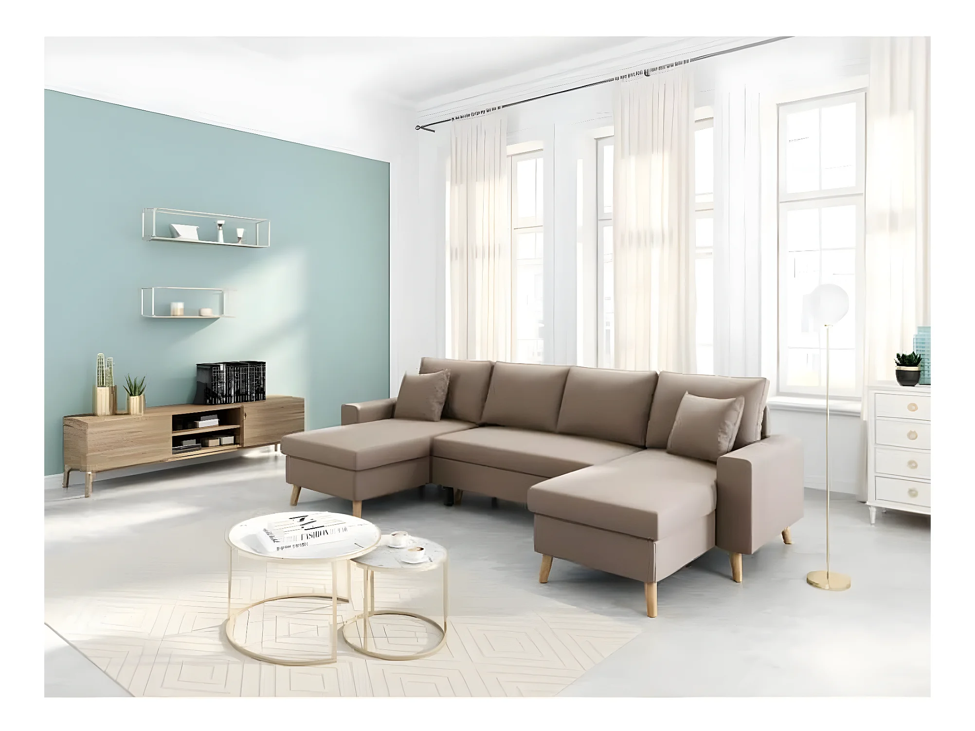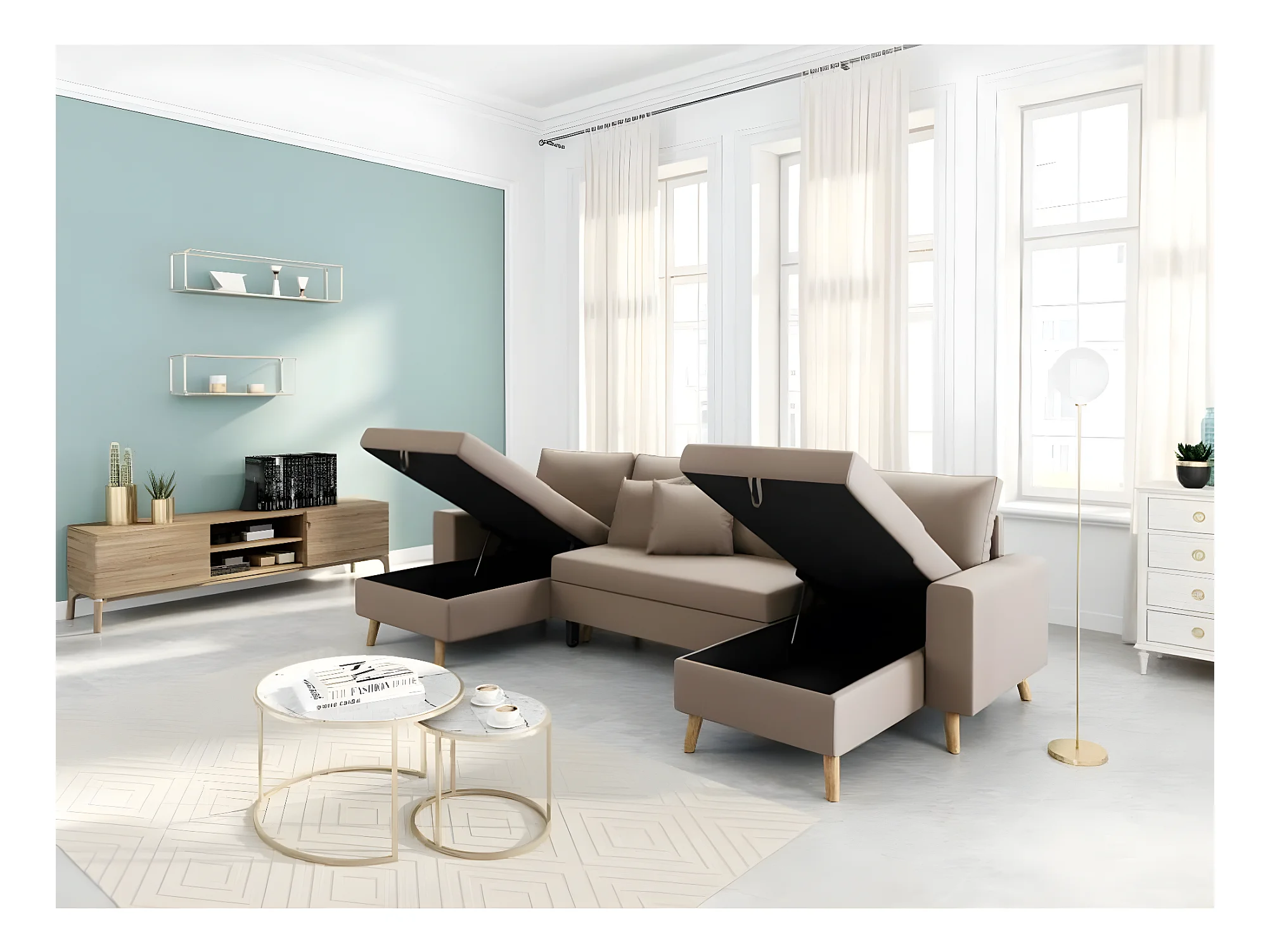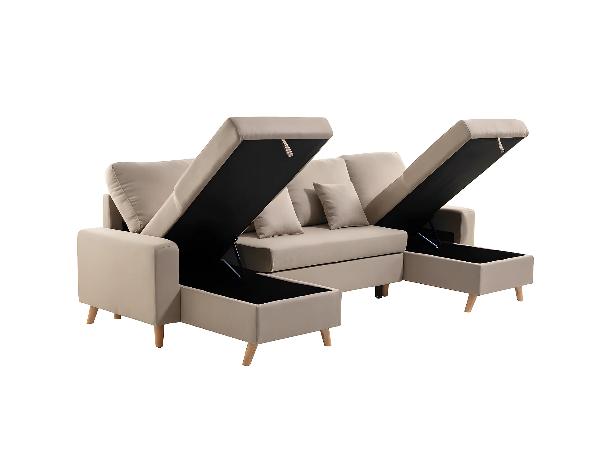 Canapé Panoramique Scandinave Convertible 2 Coffres en Tissu Déperlant