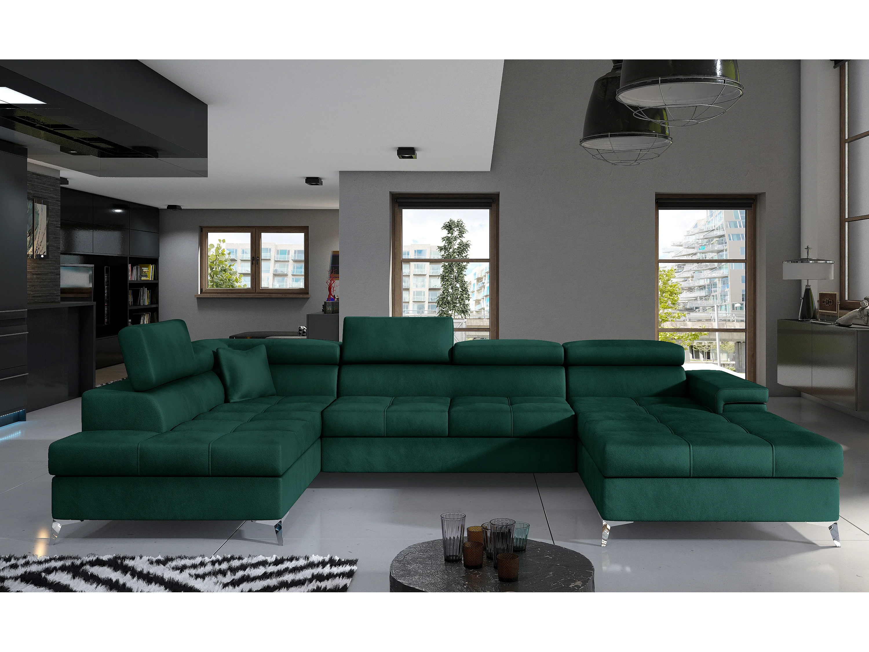 Canapé panoramique convertible KUTTY velours - Rangement et têtières réglables-Vert foncé-Coffre à gauche