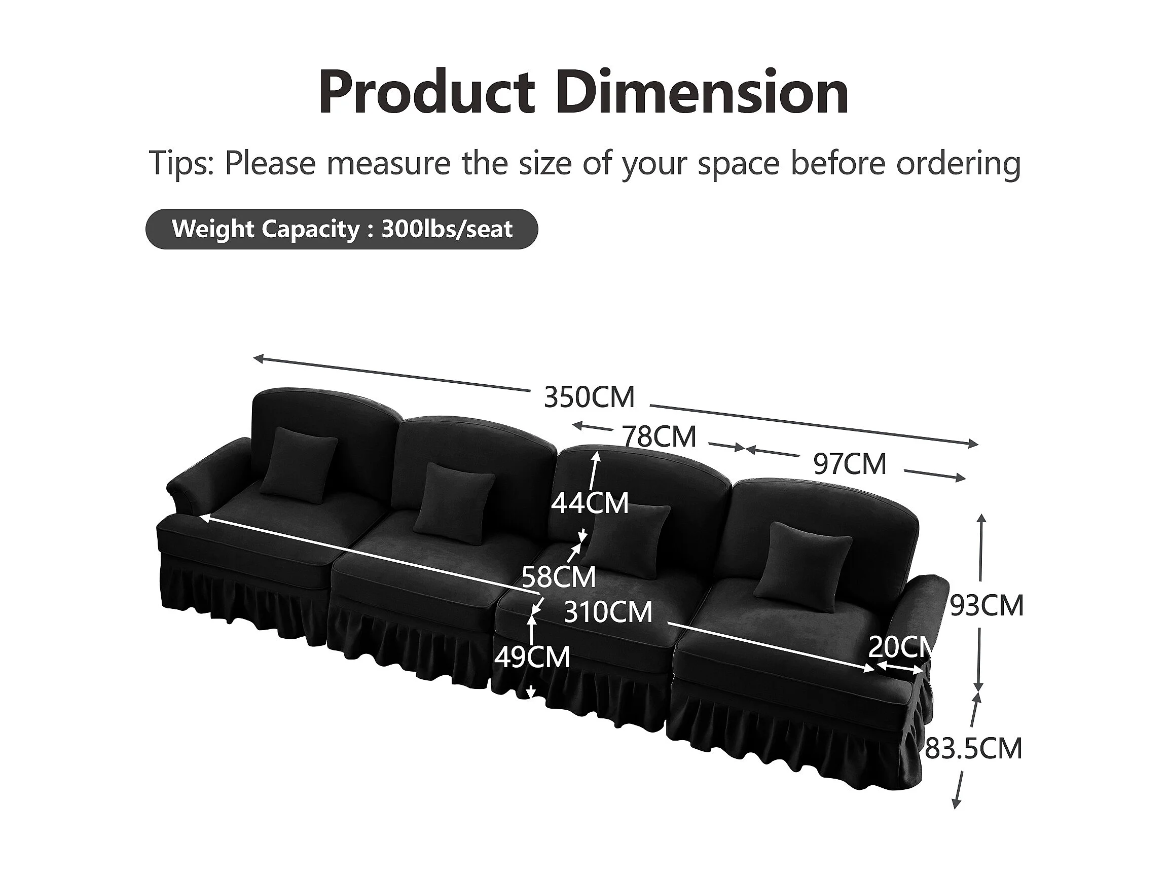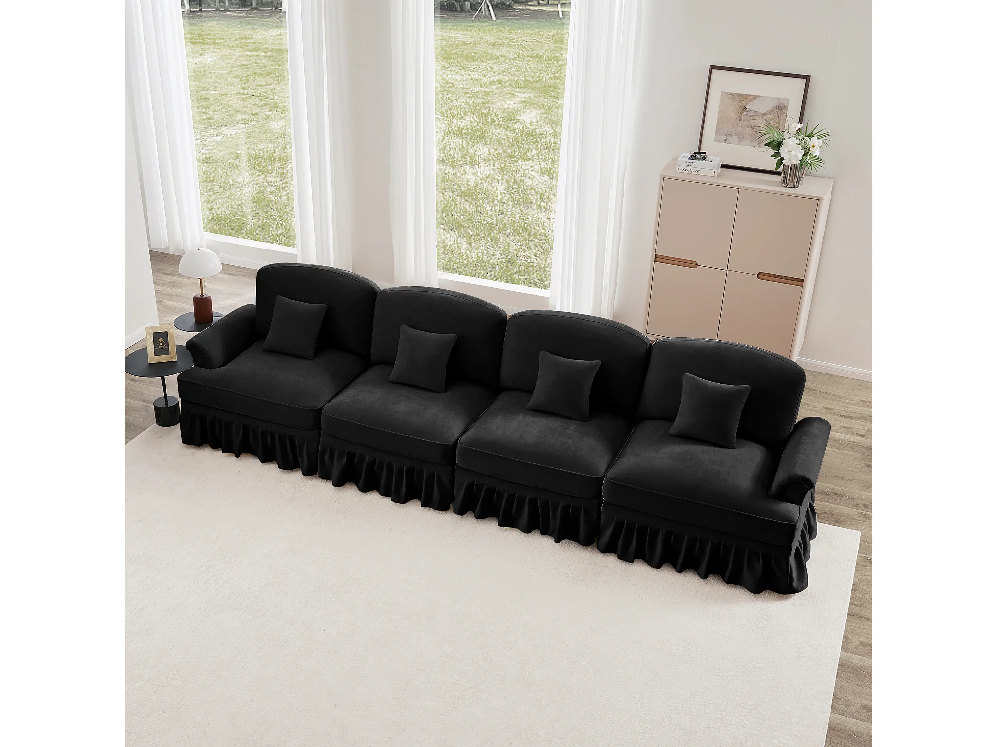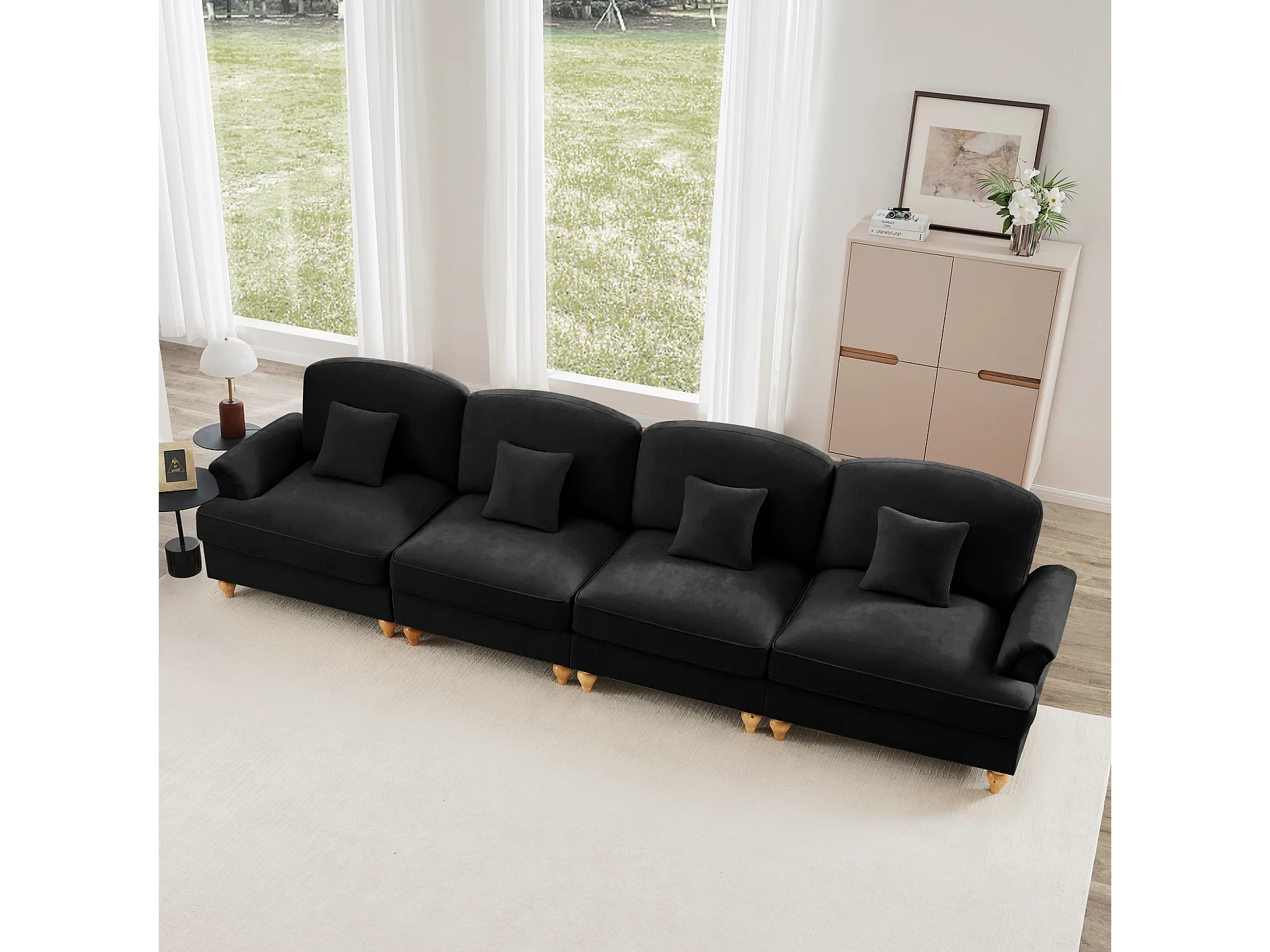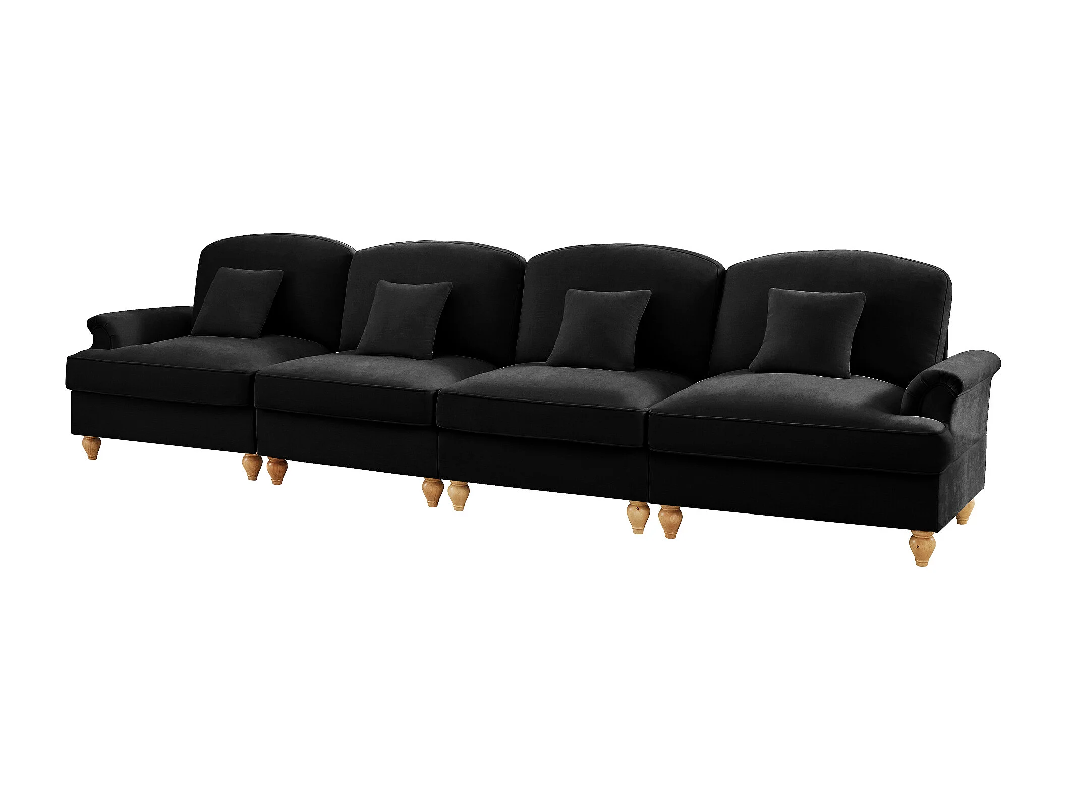 Canapé quatre places Dossier segmenté Mousse haute densité Pieds fuselés Chenille Noir