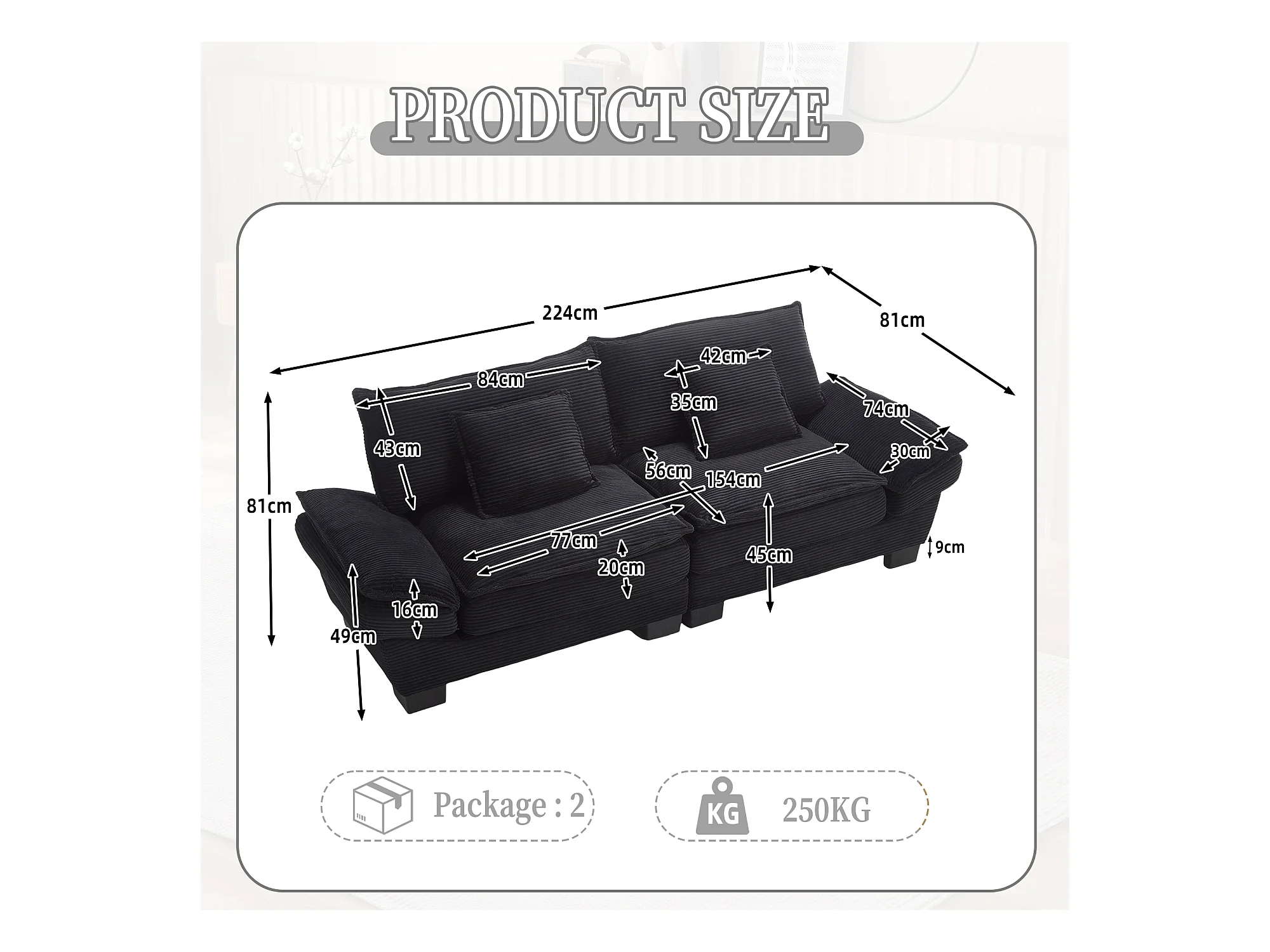 Canapé 2 places en velours noir – dossier inclinable et convertible en lit - 2 coussins inclus - idéal pour salon ou bureau