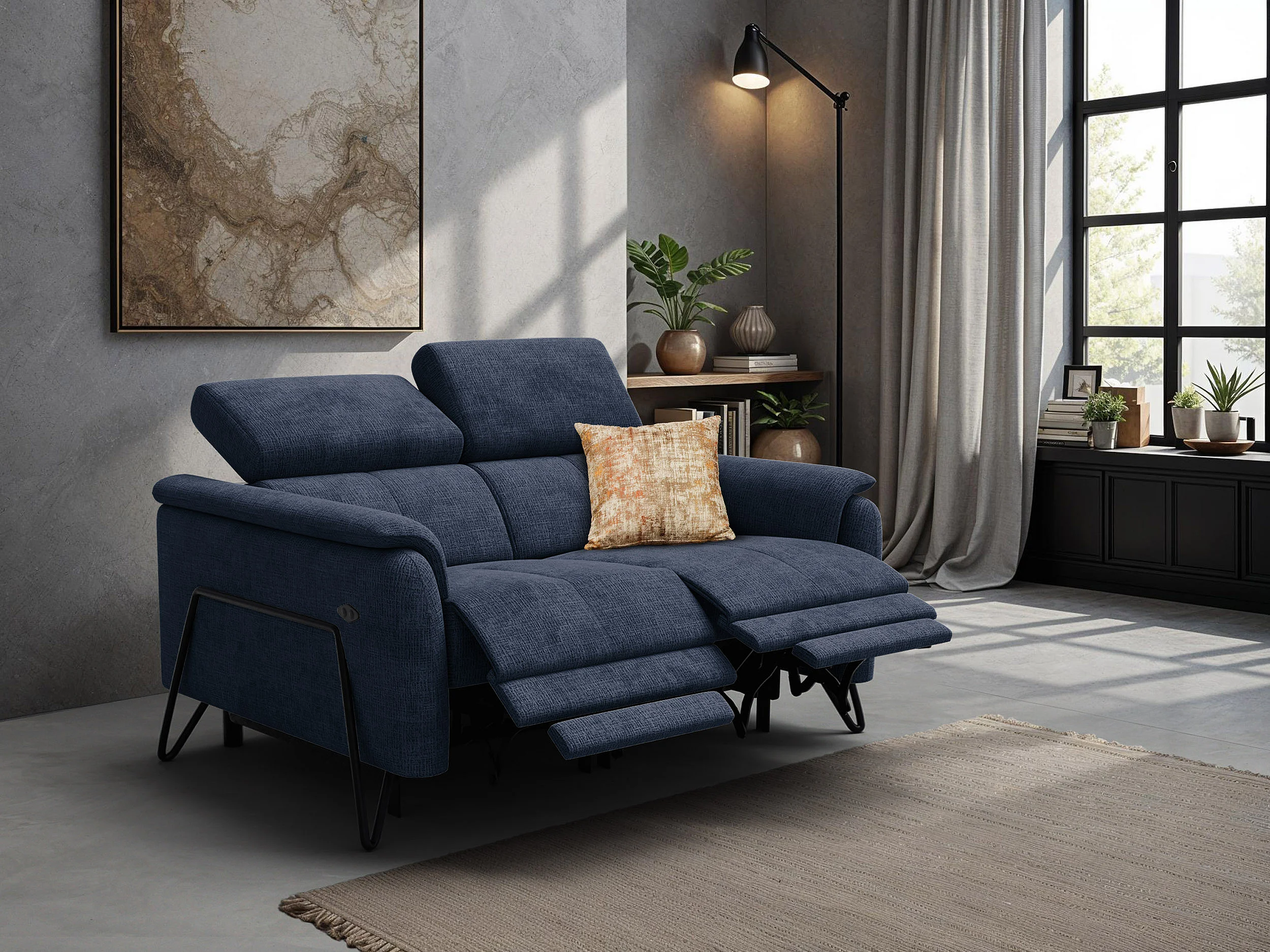 Canapé RODEN 2 places avec 2 Relax, tissu bleu marine