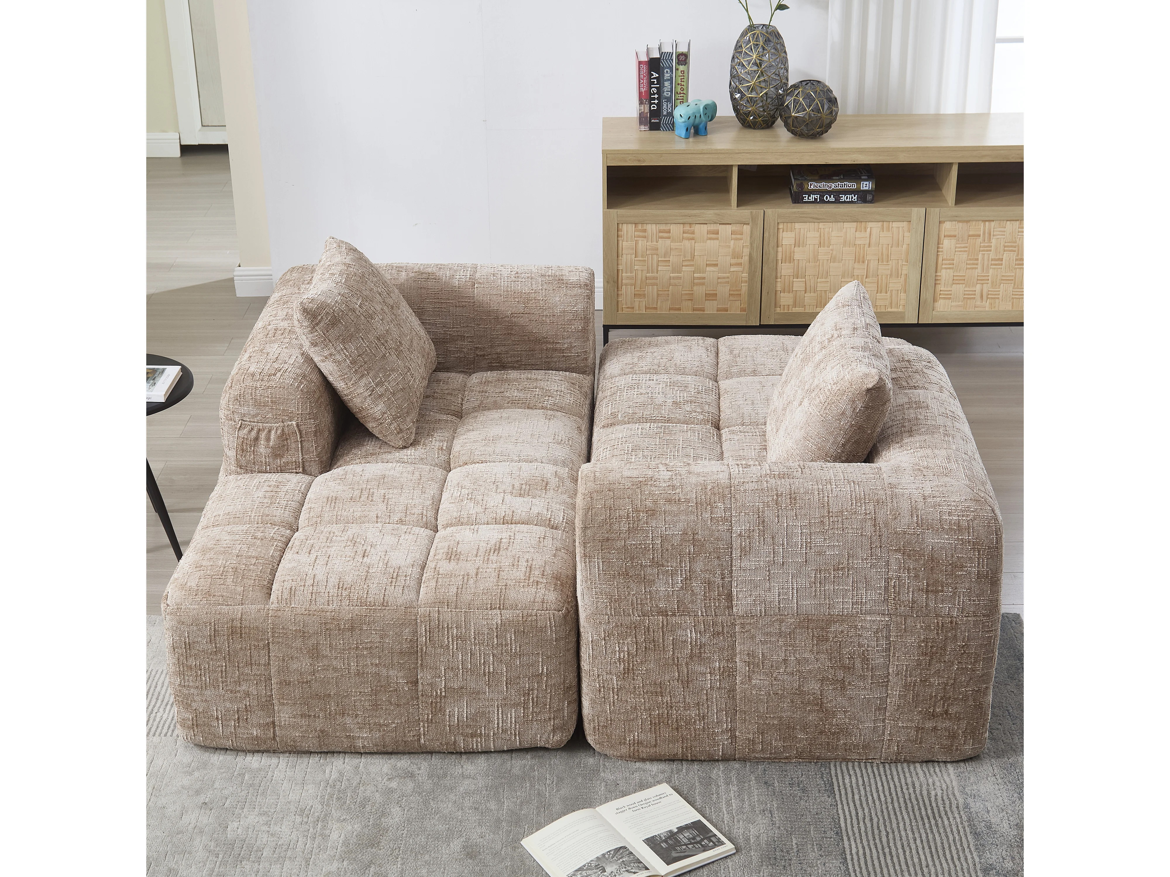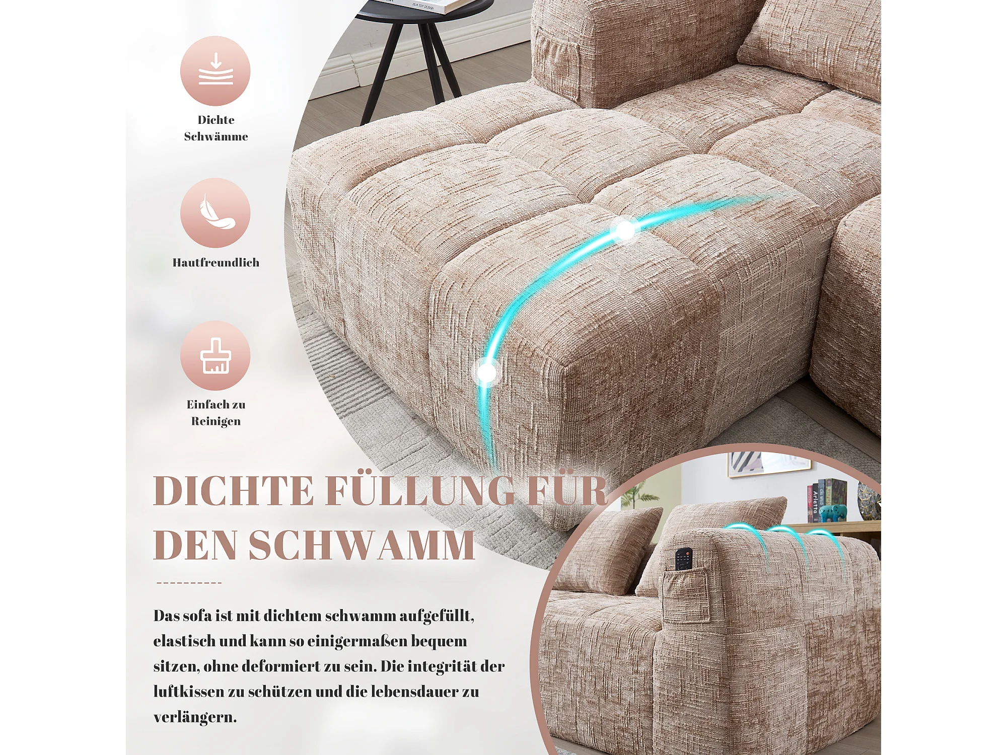 Canapé Sectionnel Moderne avec Chaiselongue, 3 places, design en velours, beige