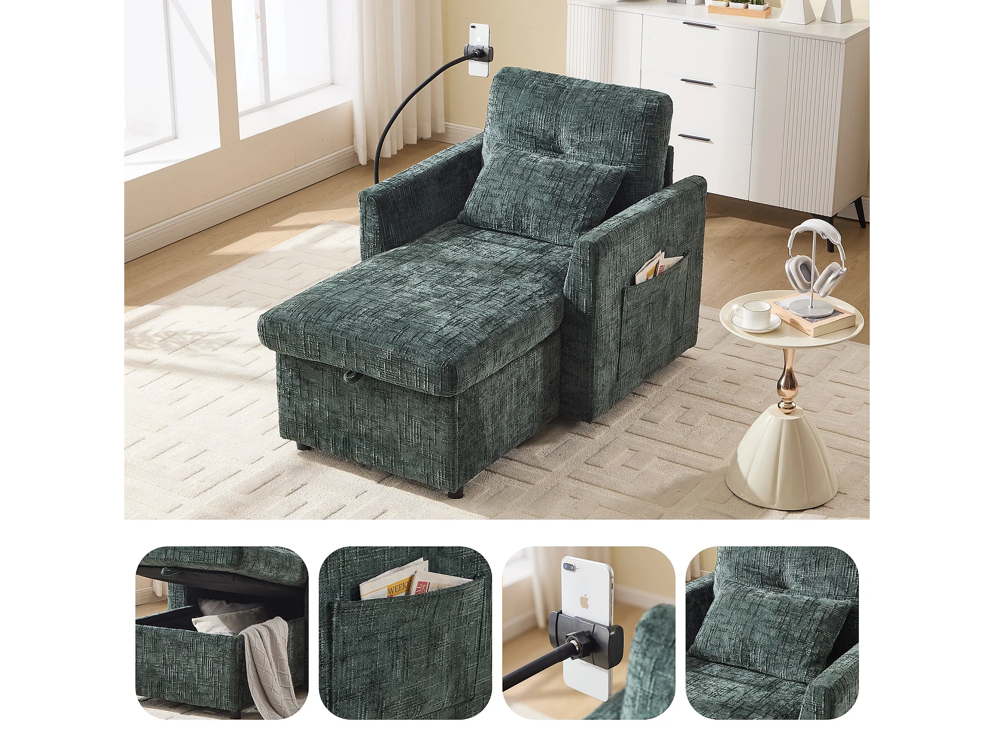 Canapé simple fauteuil lounge chenille émeraude vert avec support téléphone, rangement, coussin & poches latérales