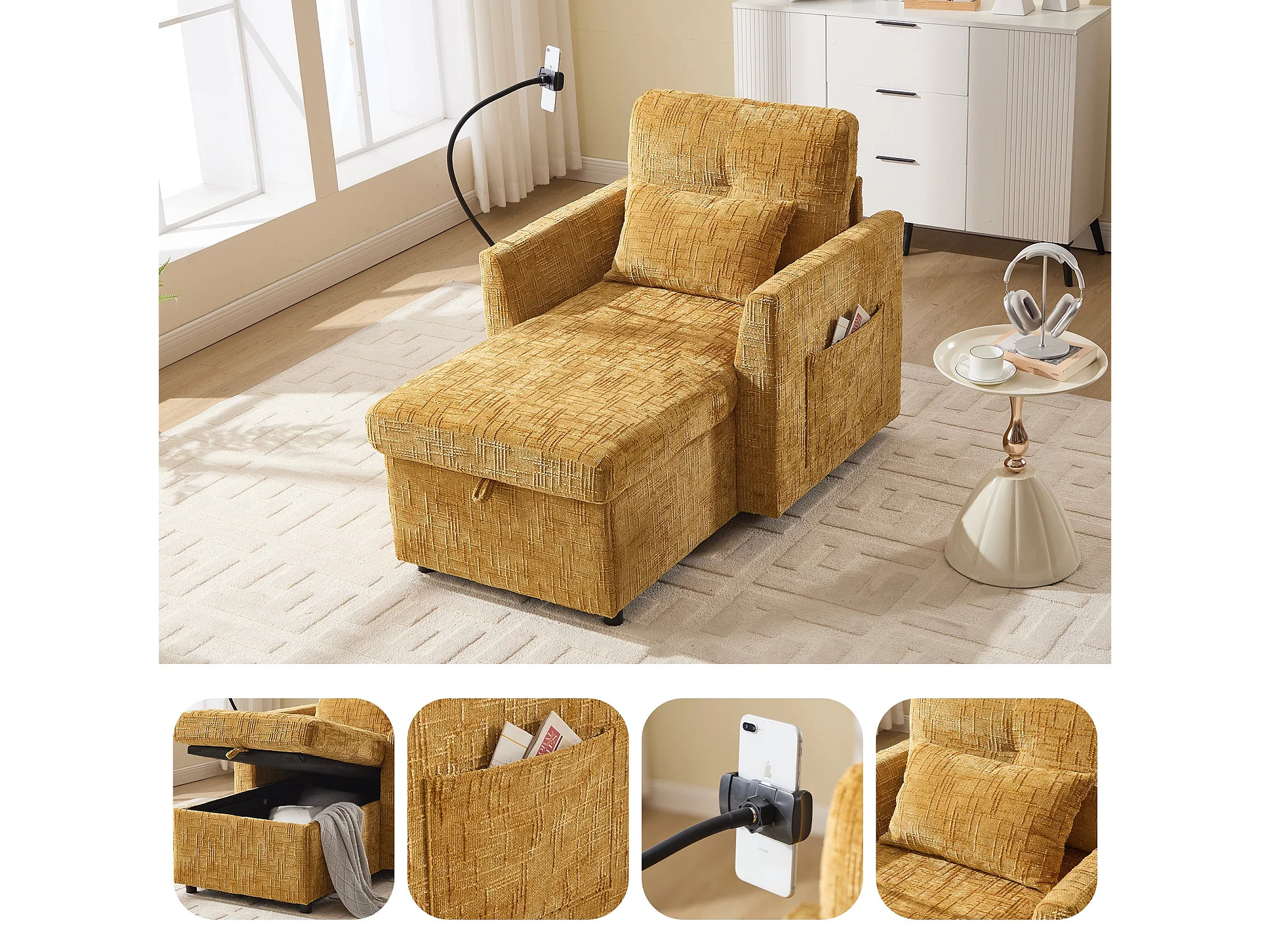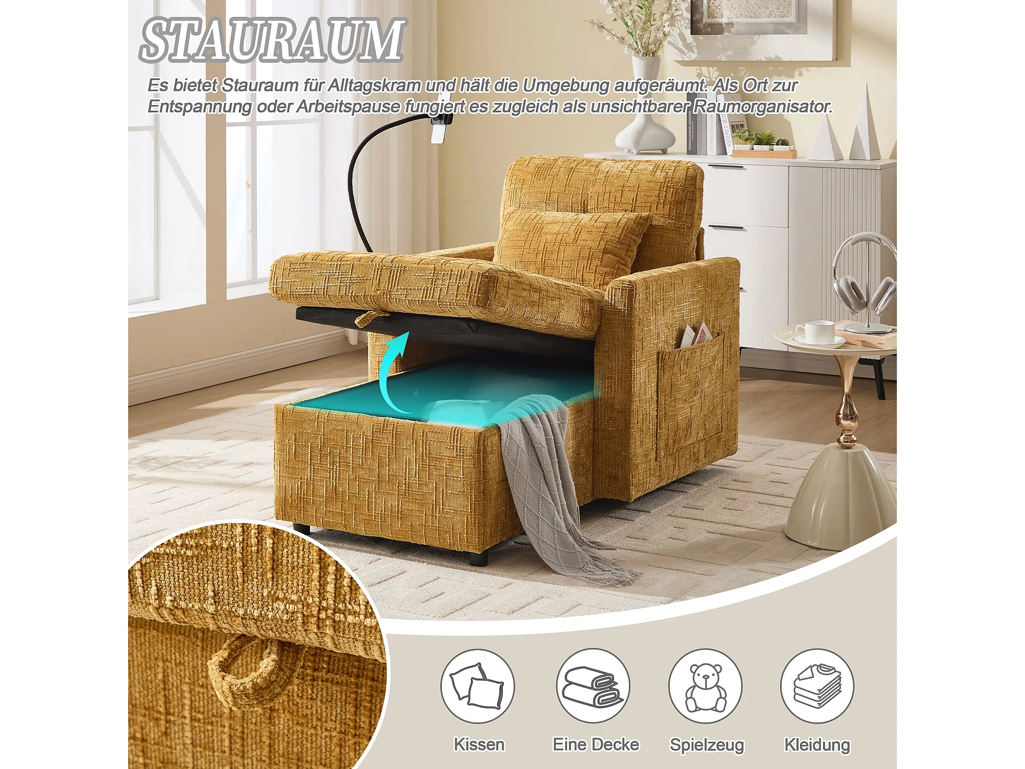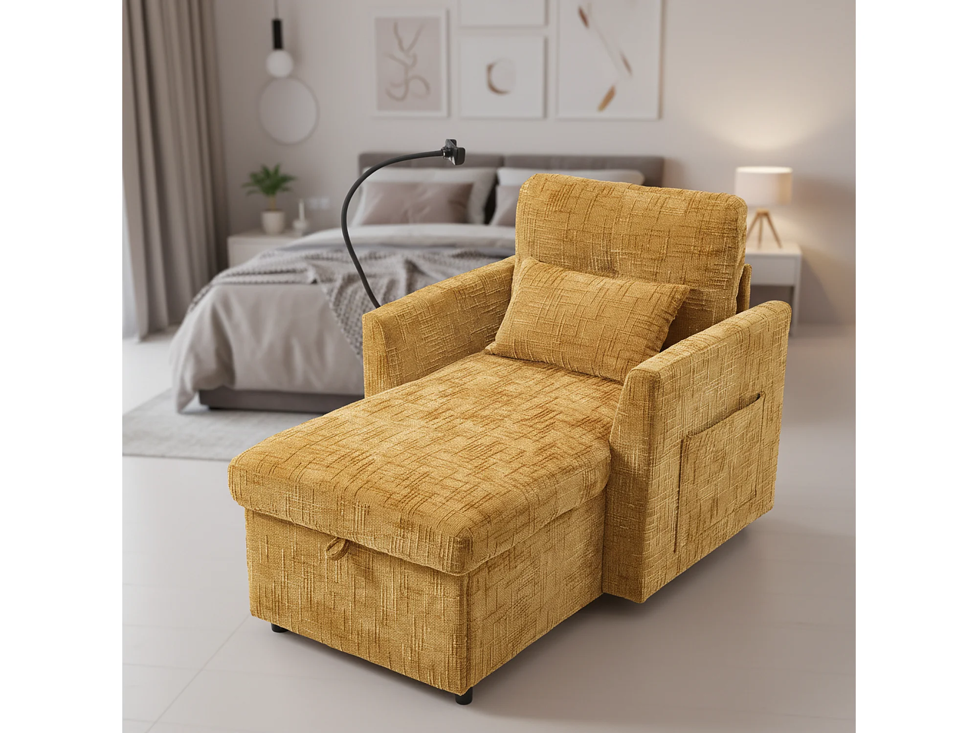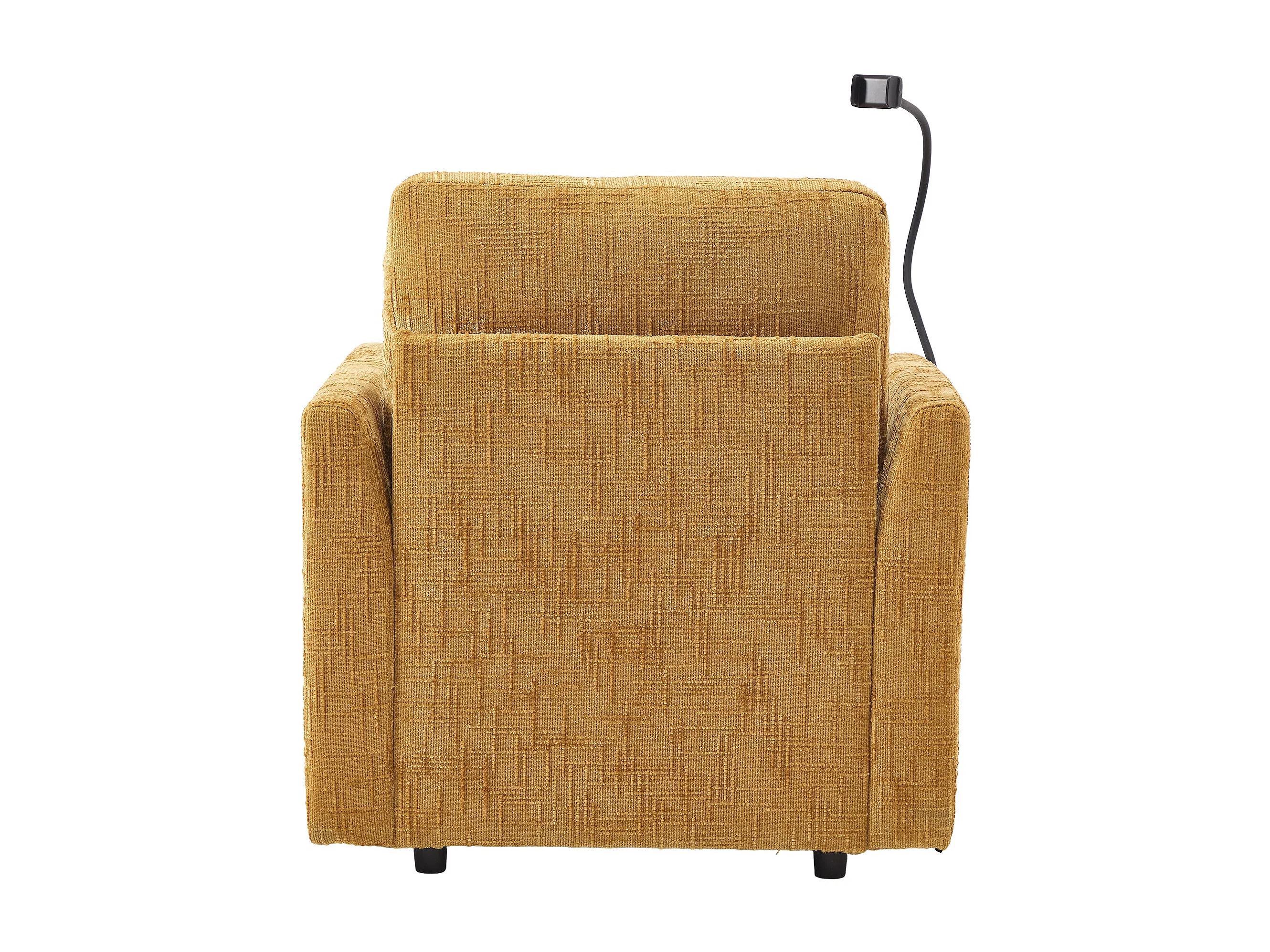 Canapé simple fauteuil lounge chenille jaune moutarde avec support téléphone, rangement, coussin & poches latérales