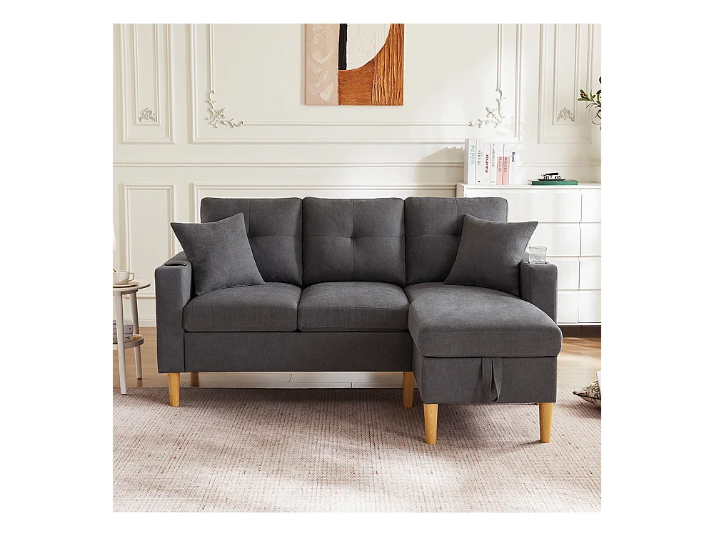 Canapé trois places en L avec méridienne, compartiment de rangement, porte-gobelets intégrés et deux coussins inclus,Gris foncé.
