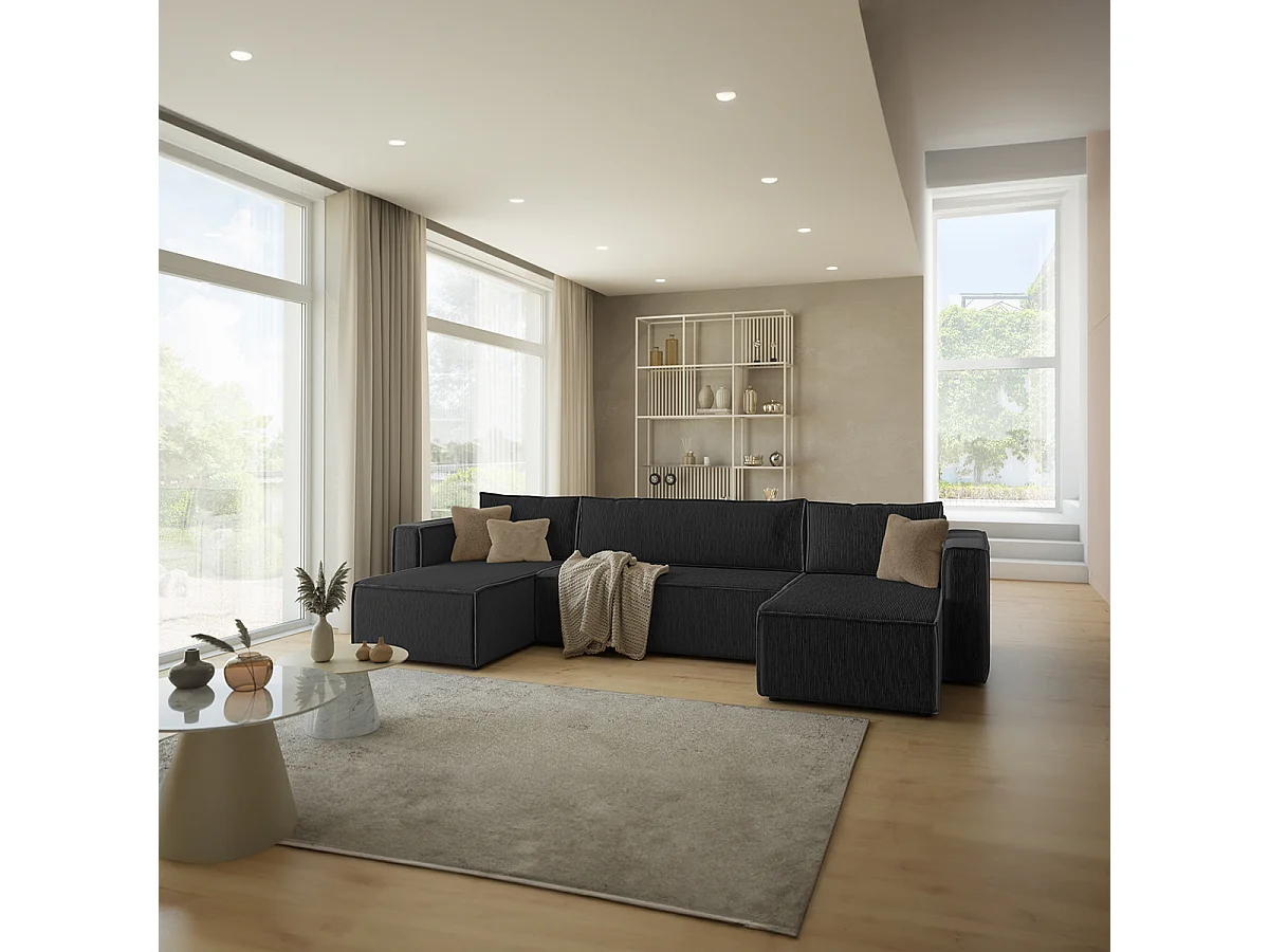 Canapé U 5 places convertible coffre Ezekiel velours côtelé Noir