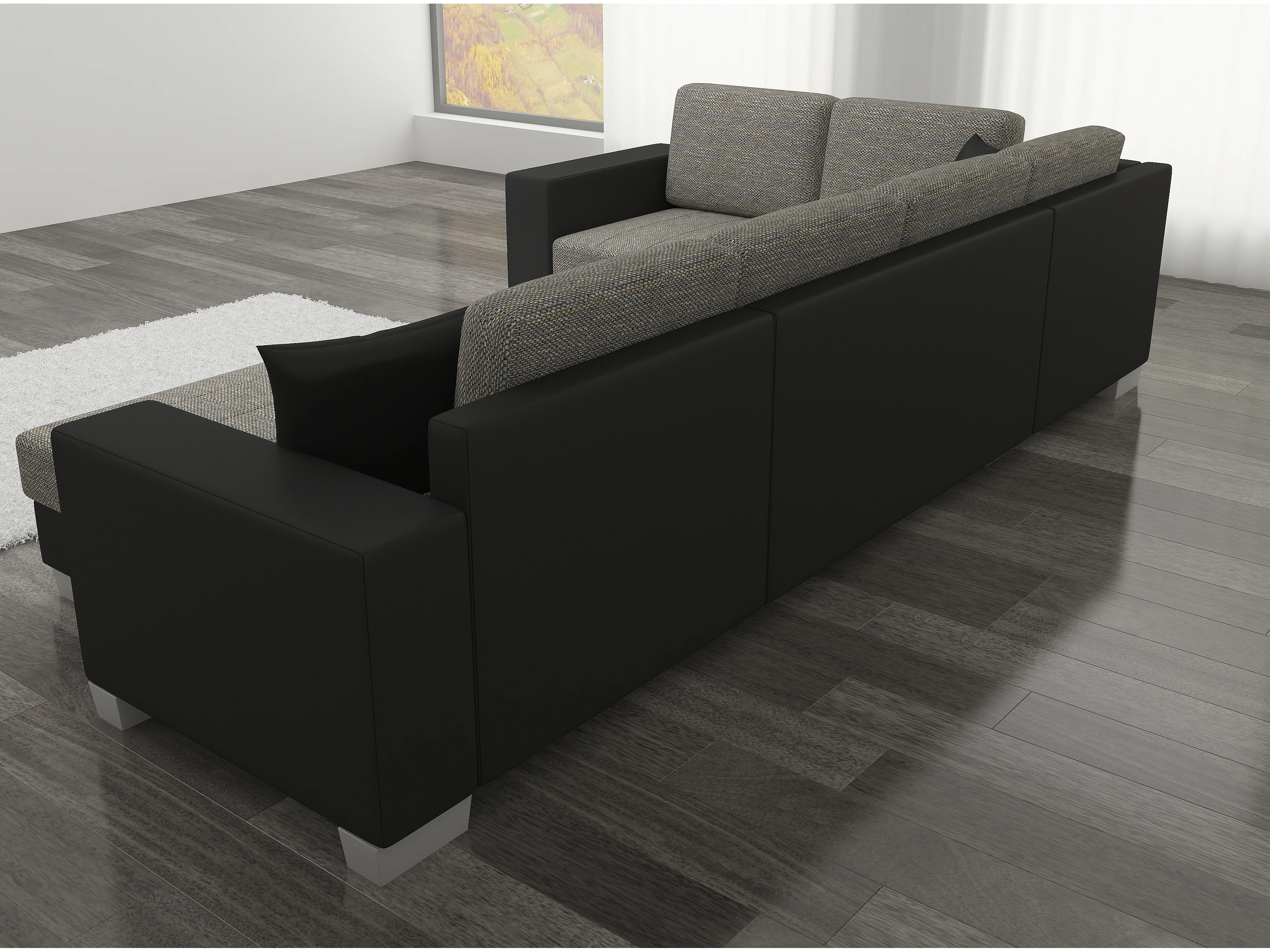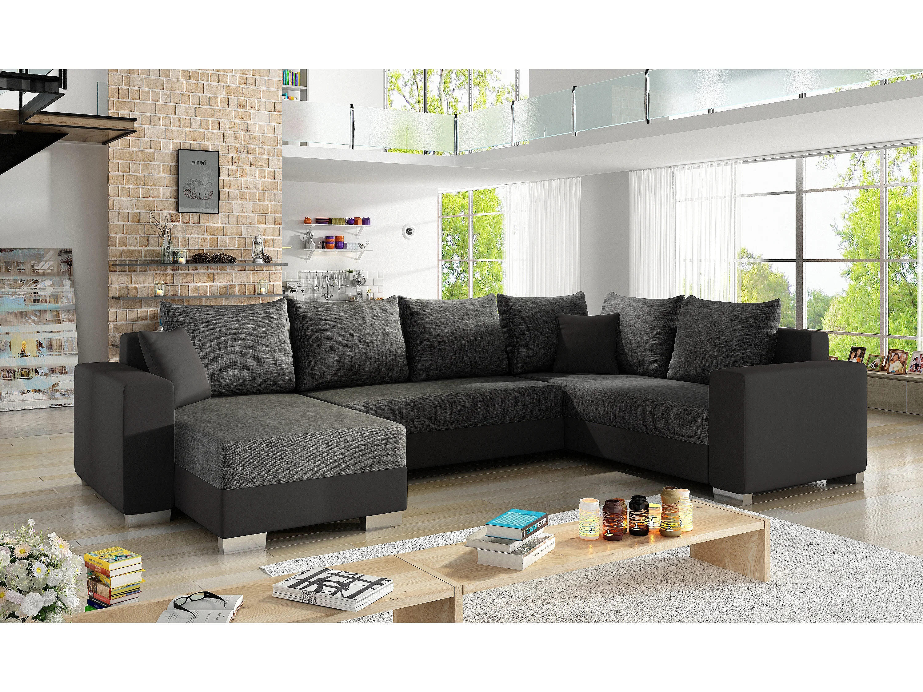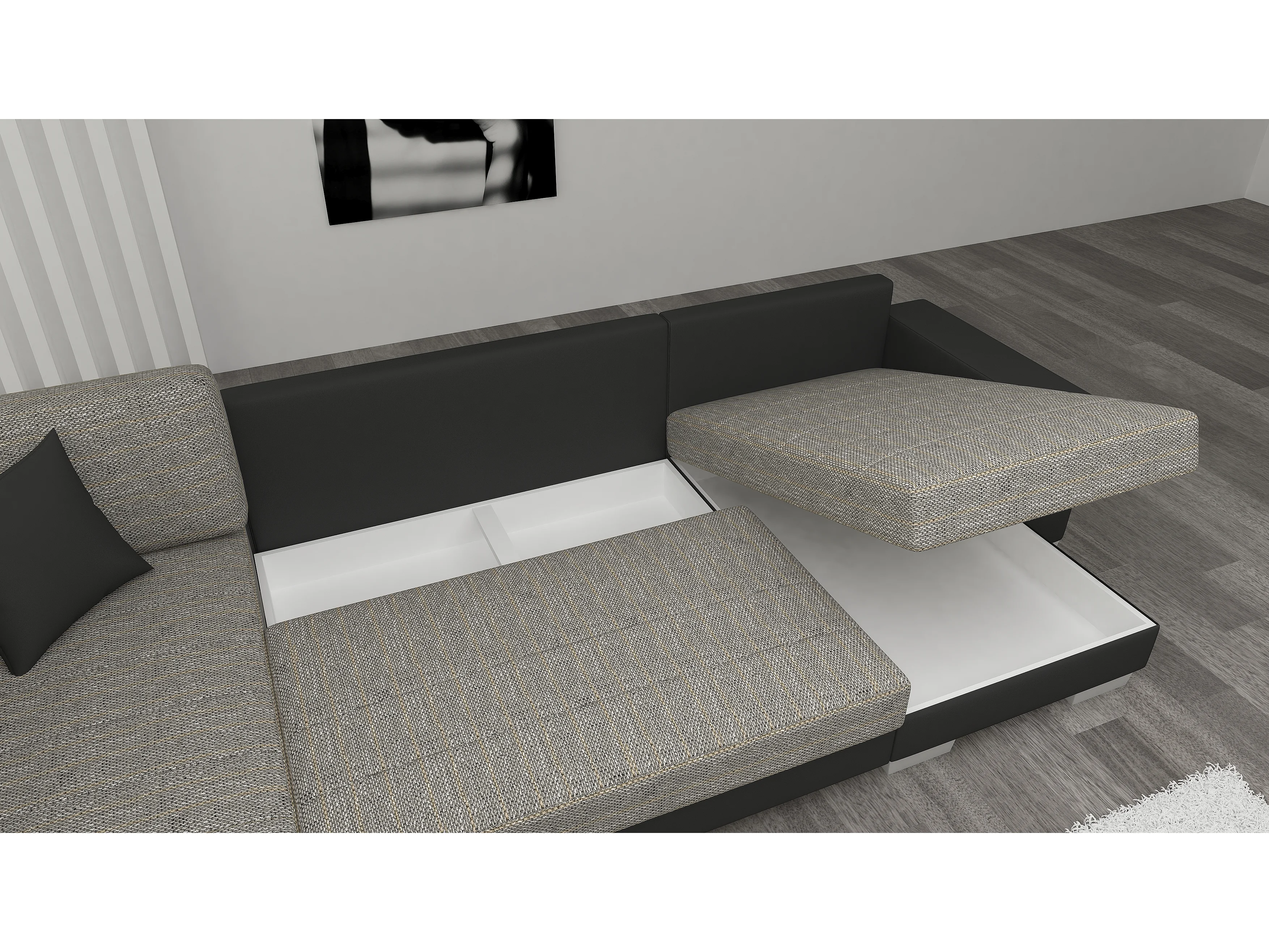 Canapé U convertible tissu gris foncé et simili noir coffre de rangement à gauche Marry 321cm