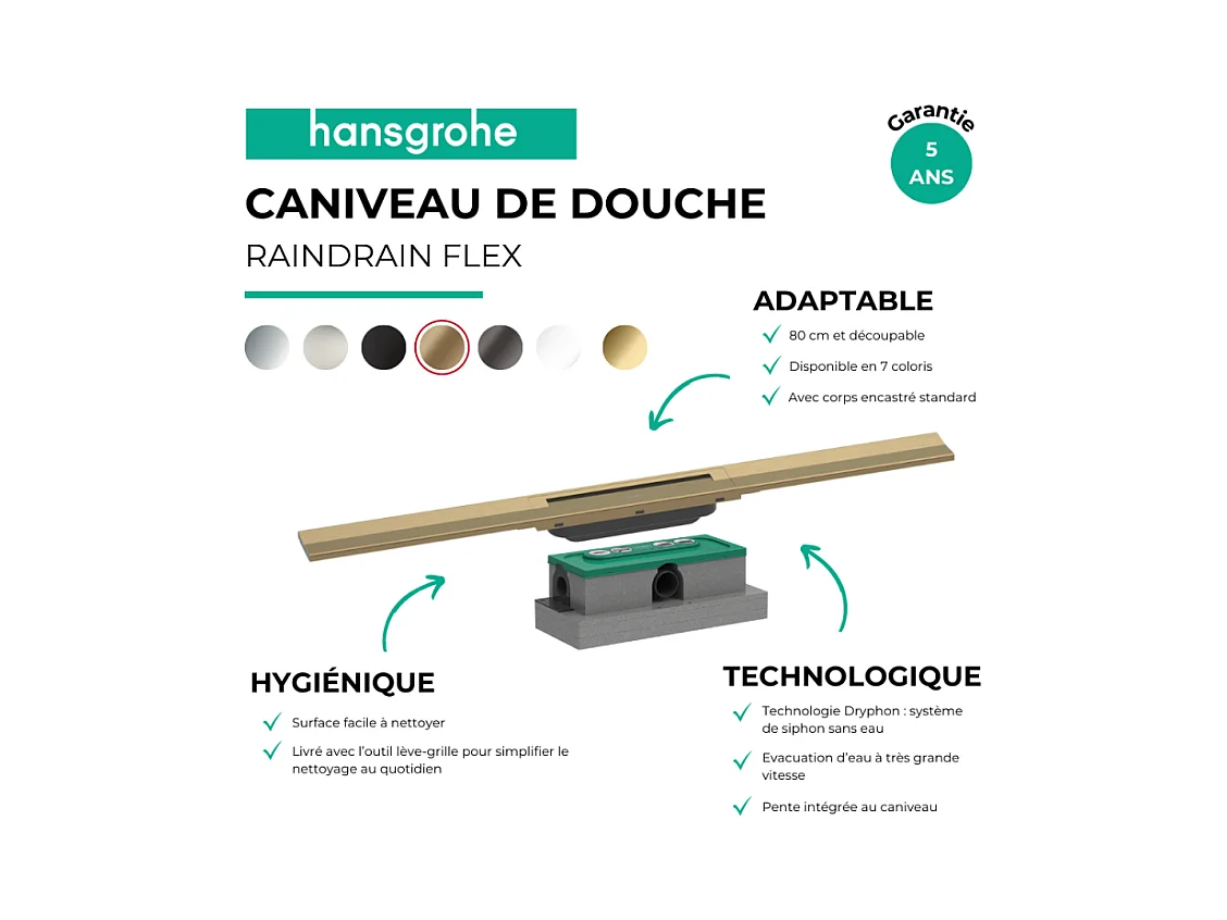 Caniveau de douche HANSGROHE RainDrain Flex 80 Bronze brossé + Corps encastré standard