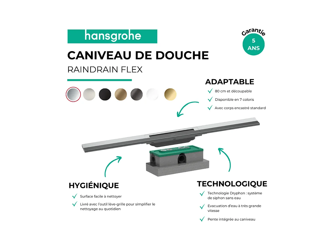 Caniveau de douche HANSGROHE RainDrain Flex 80 Chromé + Corps encastré standard
