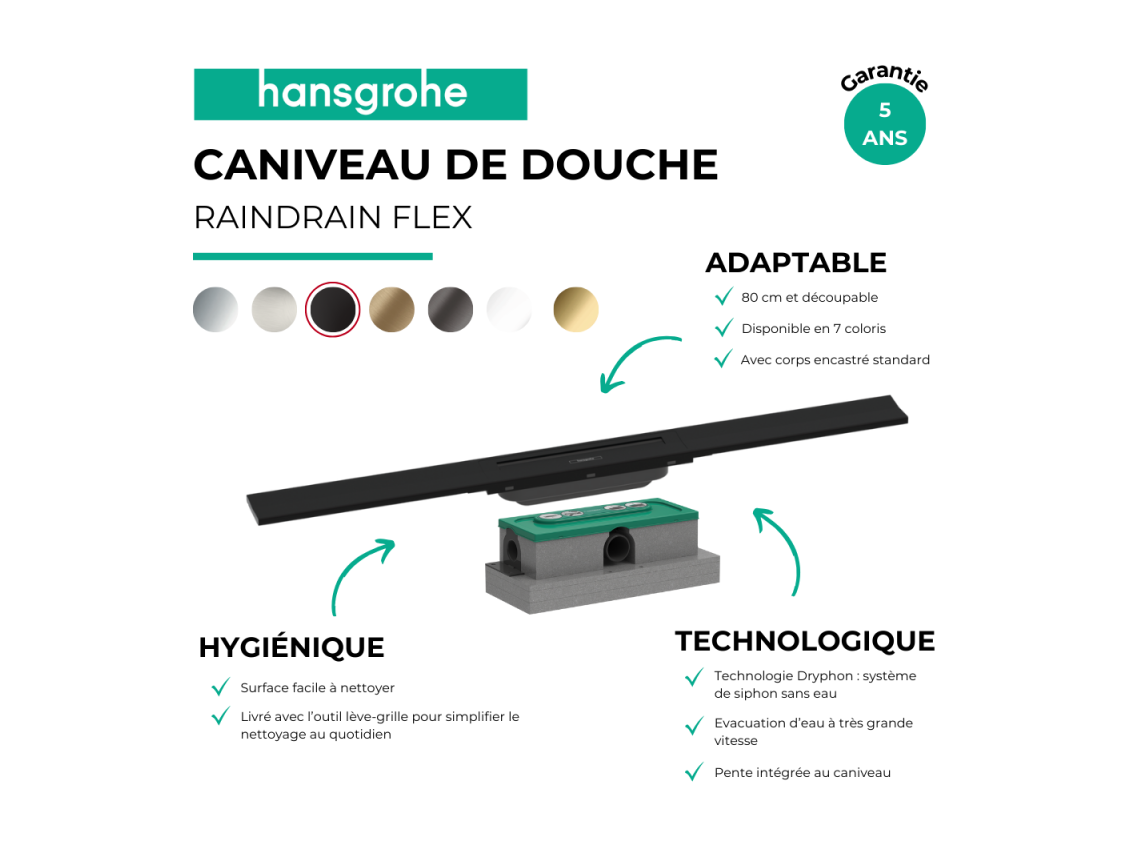Caniveau de douche HANSGROHE RainDrain Flex 80 Noir mat + Corps encastré standard