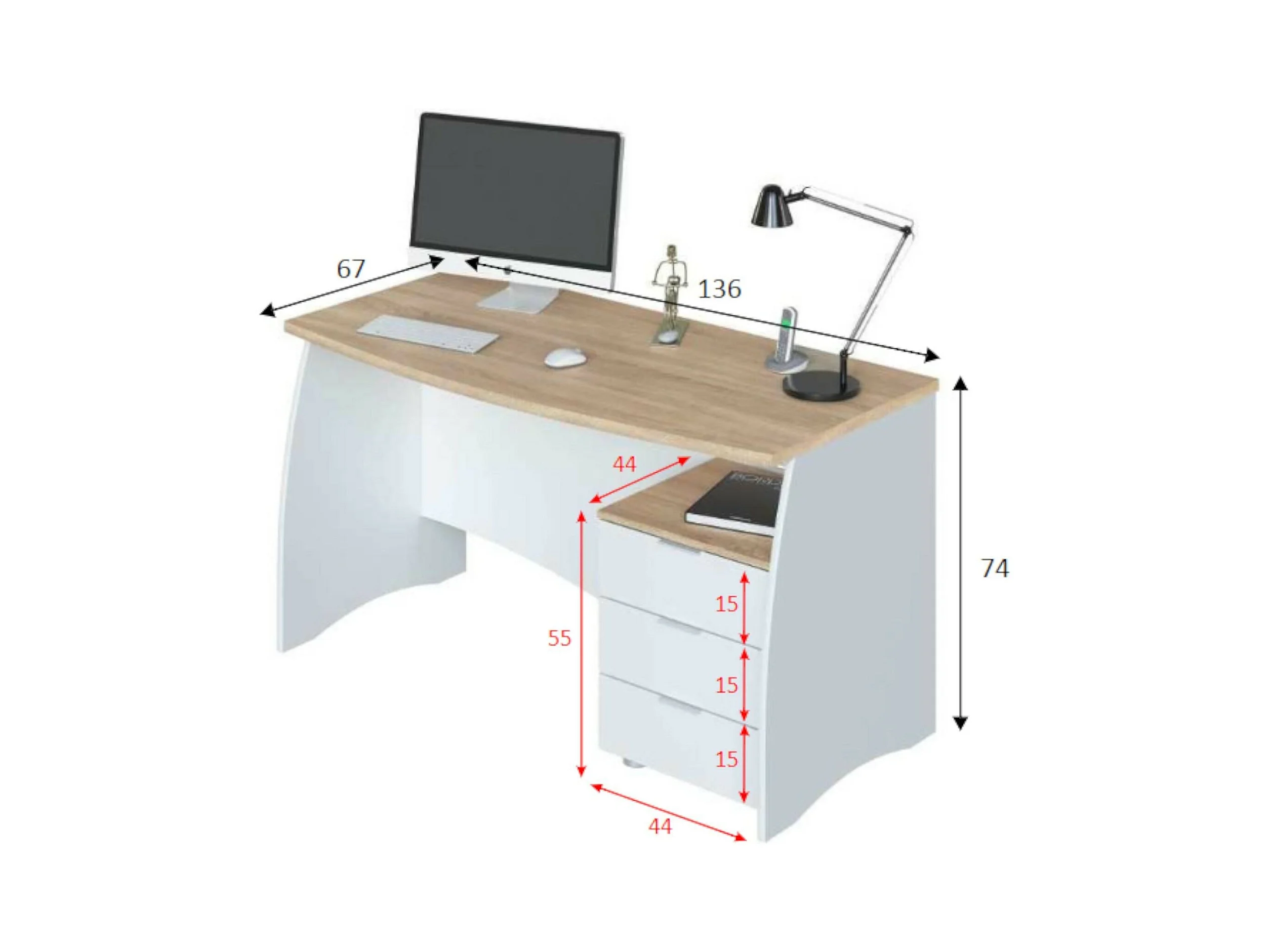 Carrollton Desk, Bureau, Table d'étude PC avec 3 tiroirs, 136x67h74 cm, Blanc et Chêne