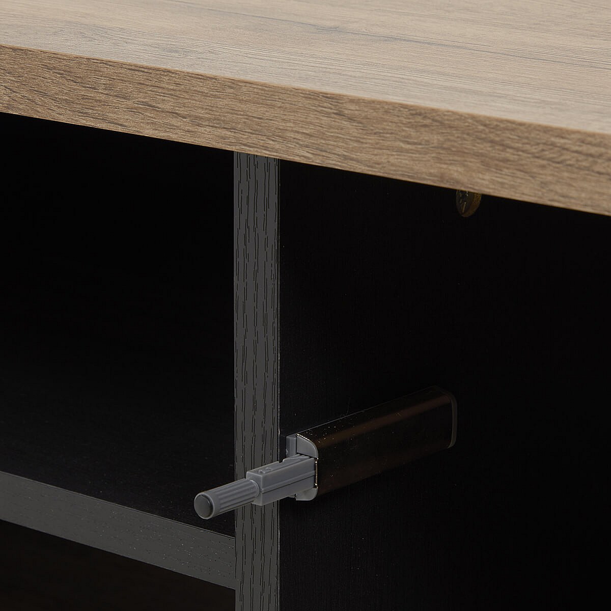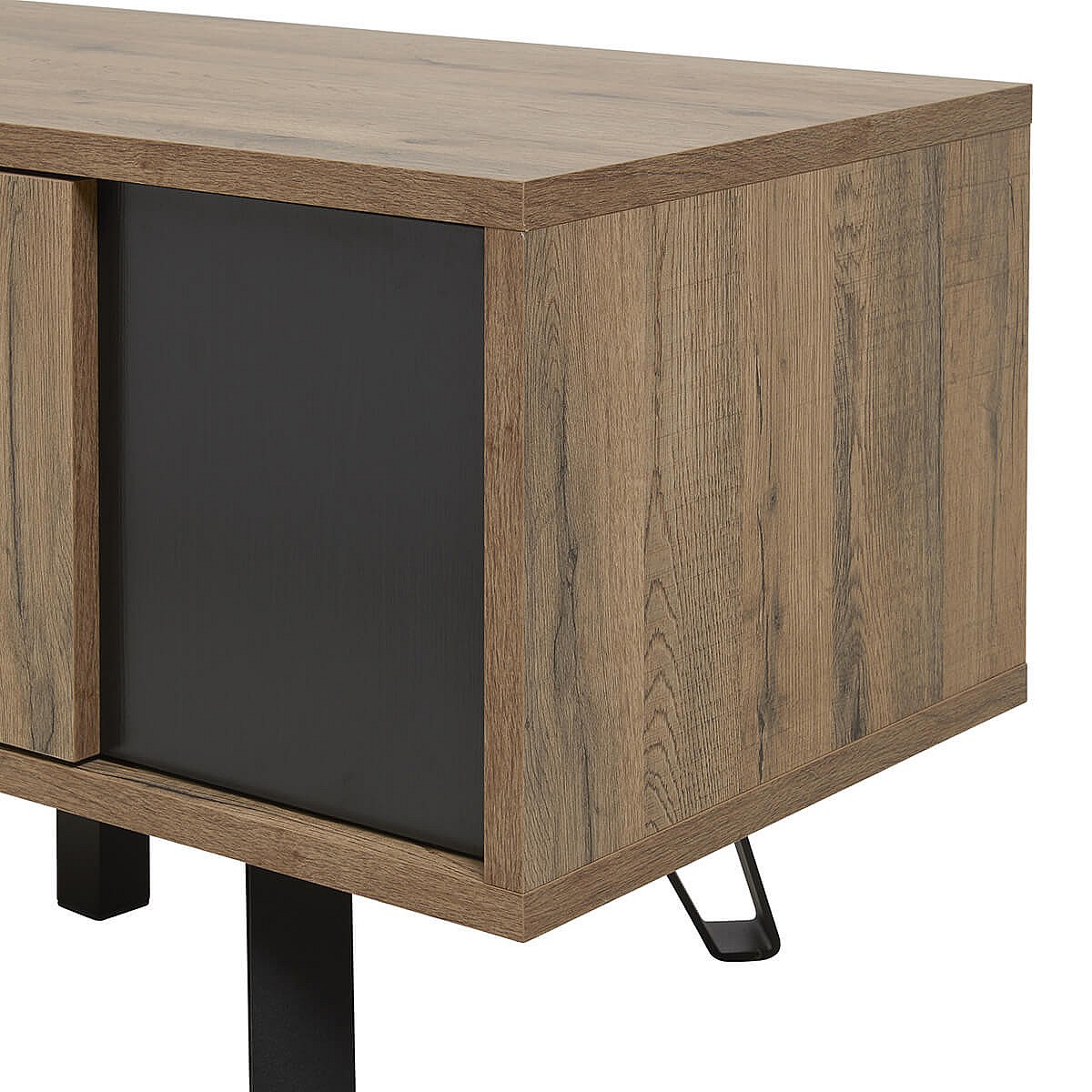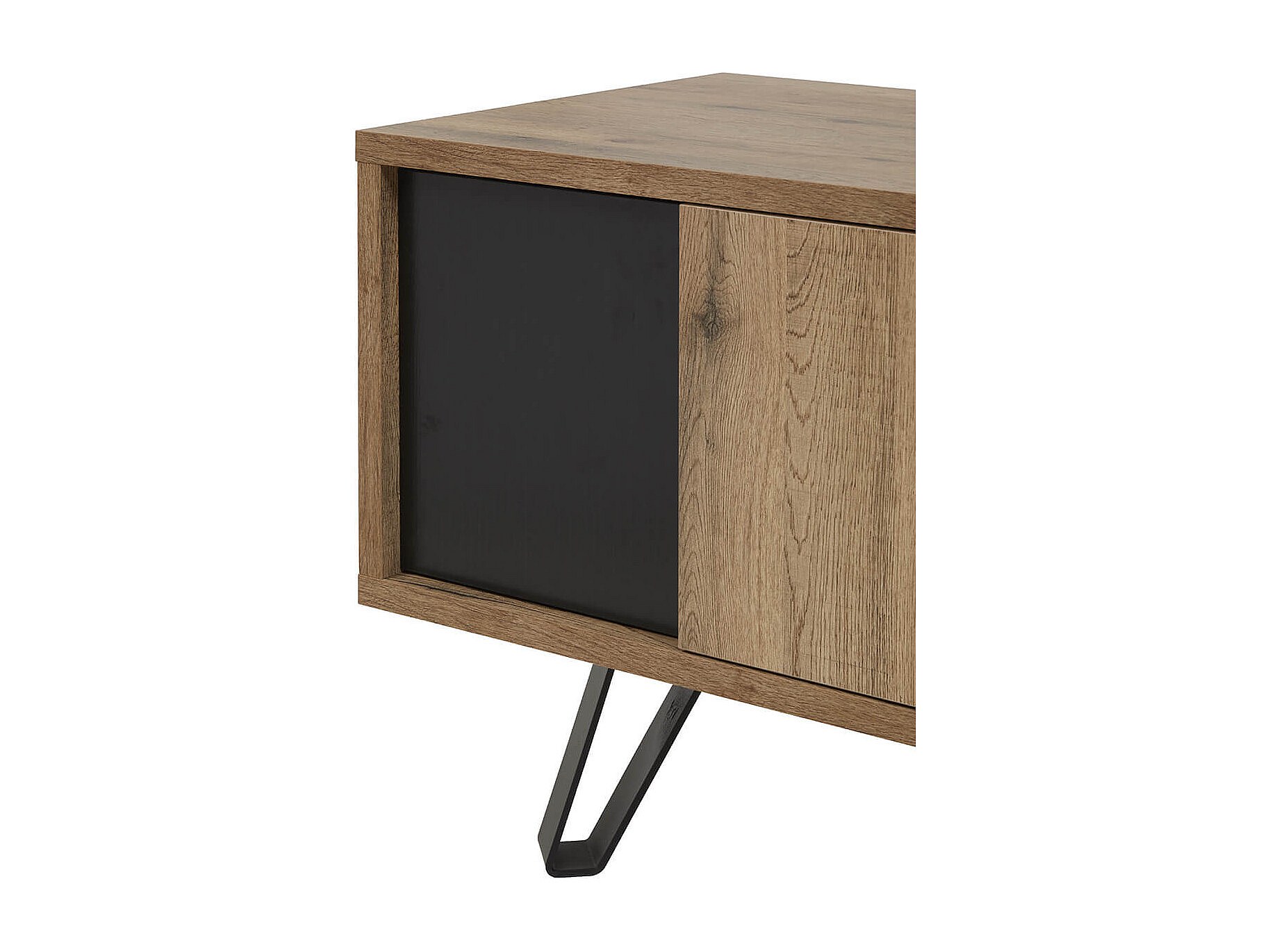 Structure en panneaux de particules. Revêtement papier décor bois naturel et bois noir. Piètement métallique noir. Dispose de 2 portes et 2 niches de rangement.