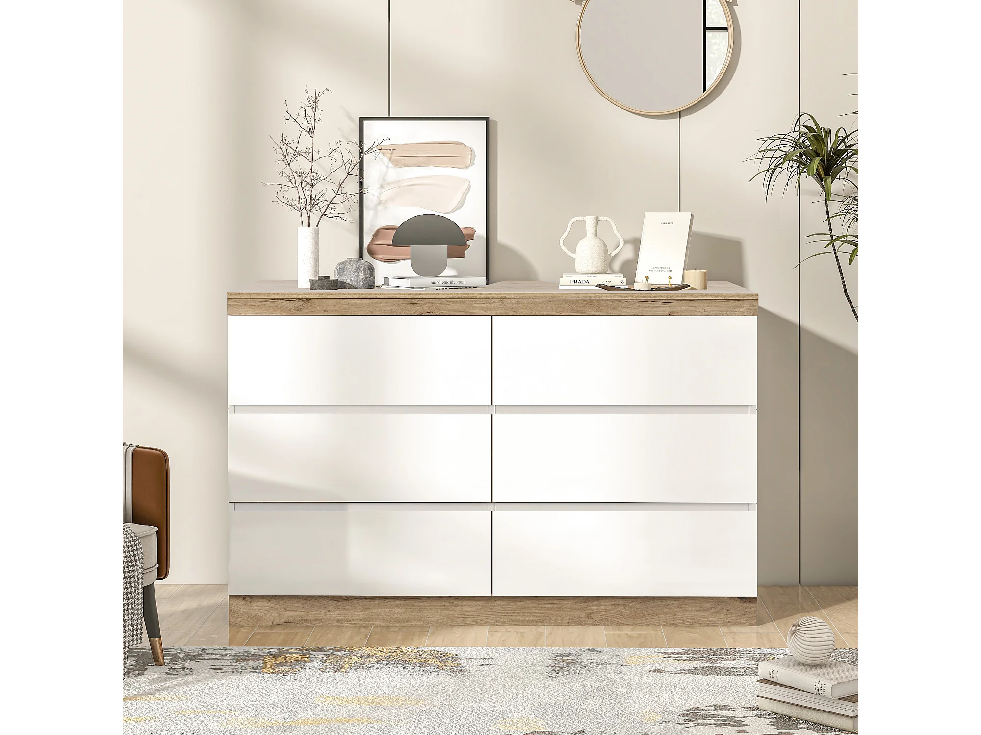 Casier avec 6 tiroirs avec fonction de rangement pour chambre et salon E1 panneau de particules blanc + chêne