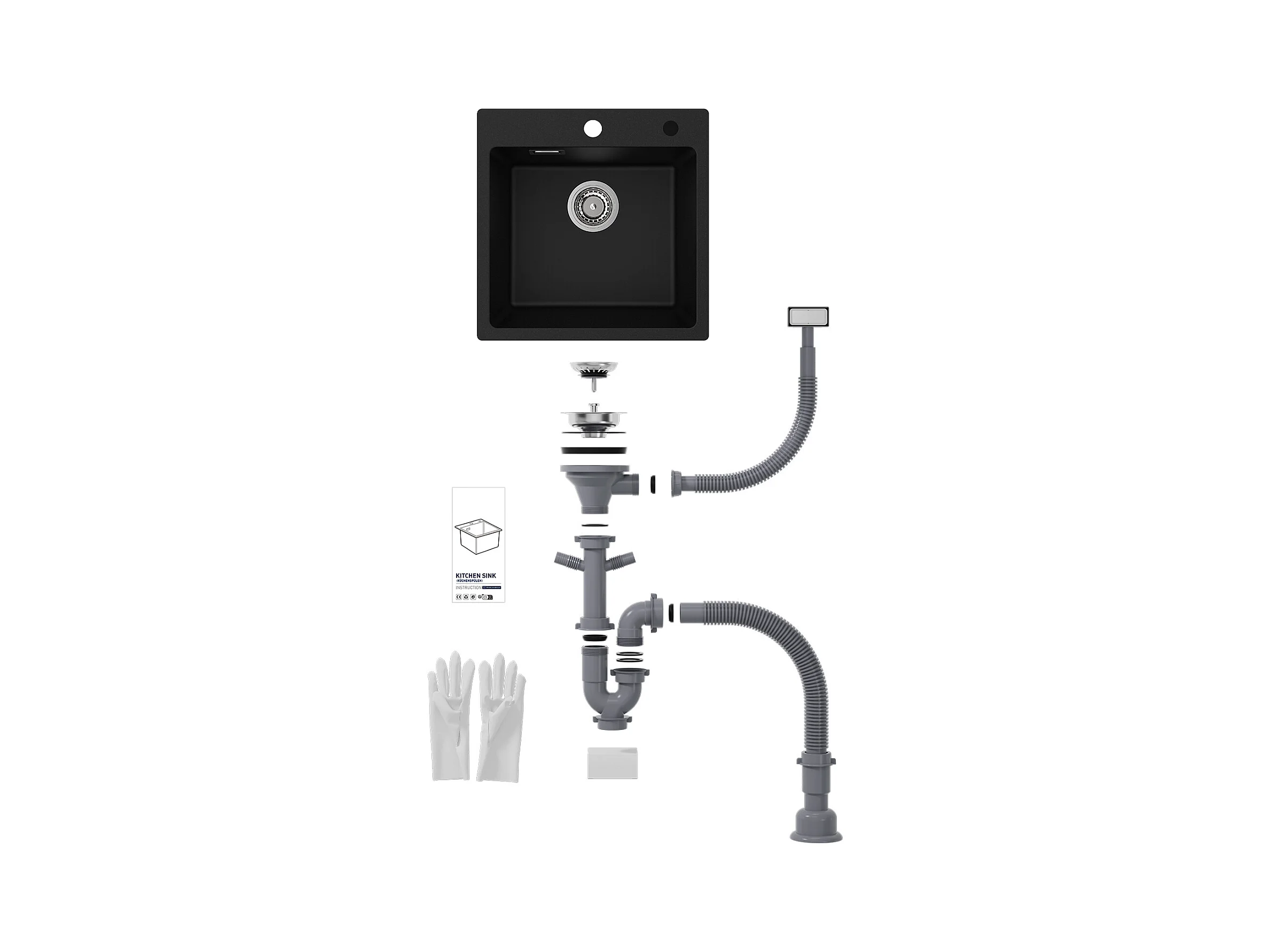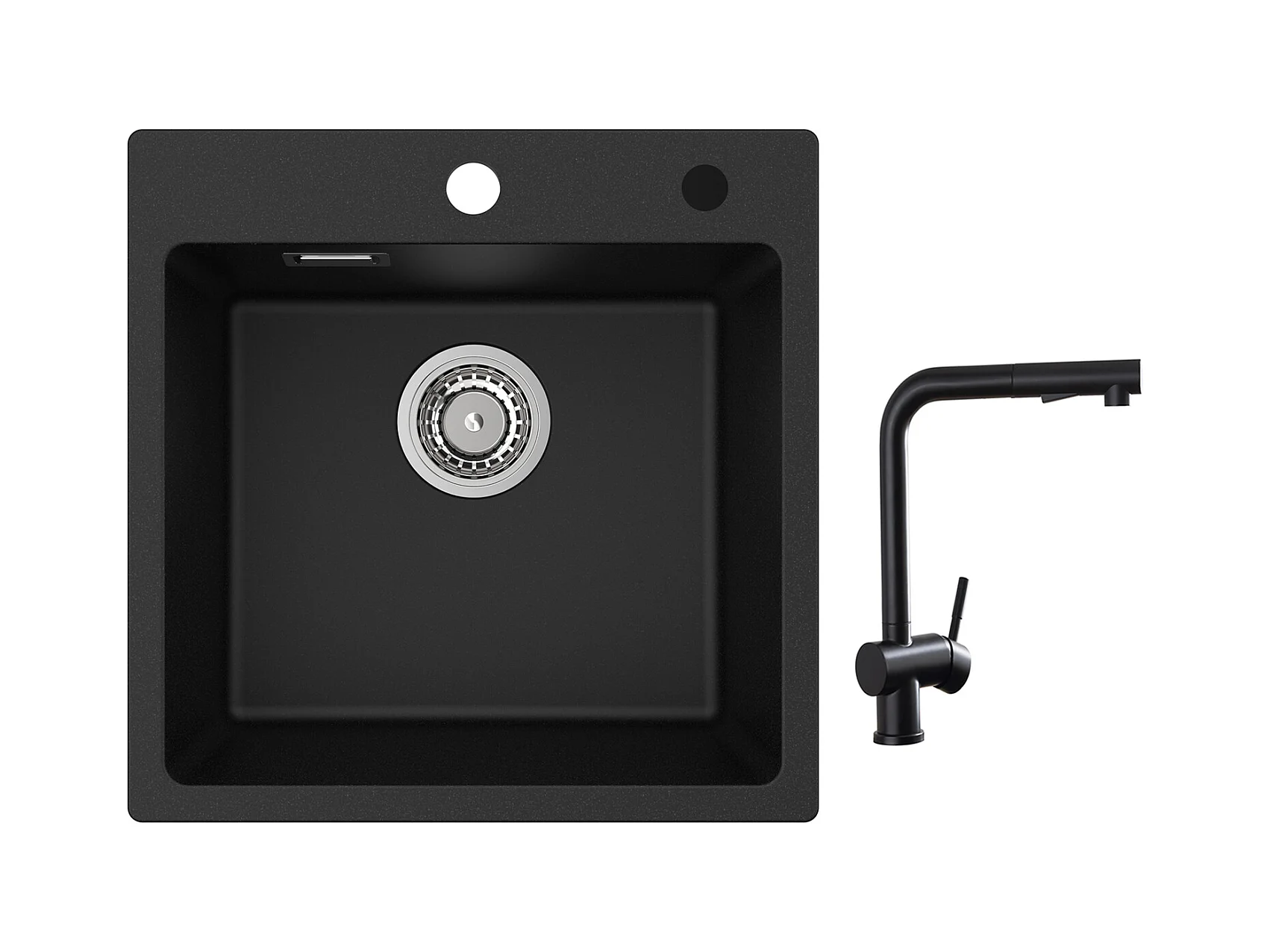 Cecipa max 45x45cm Evier Quartz Noir Evier 1 Bac en Quartz et Résine Evier de Cuisine + Robinets avec Douchette Extractible, Mitigeur d'évier Noir