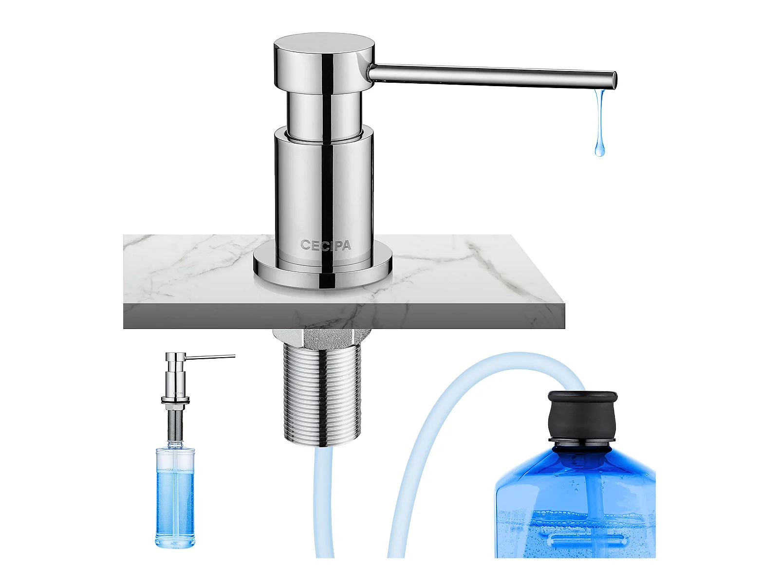 Cecipa MAX Distributeur de Savon de Cuisine Chromé, Distributeur de Savon pour Evier avec Récipient de 300ML + Tuyau d'extension en Silicone de 1,25M