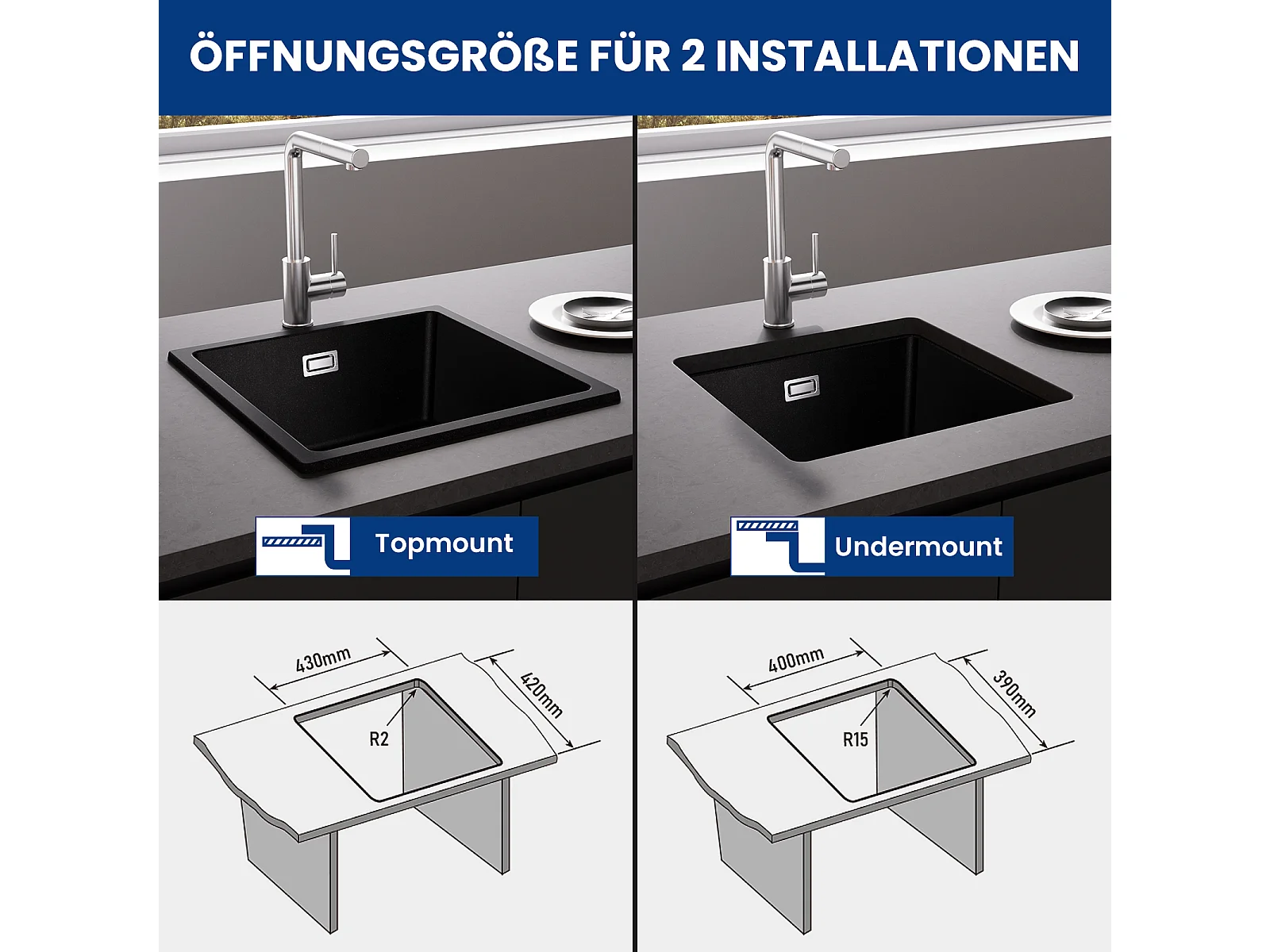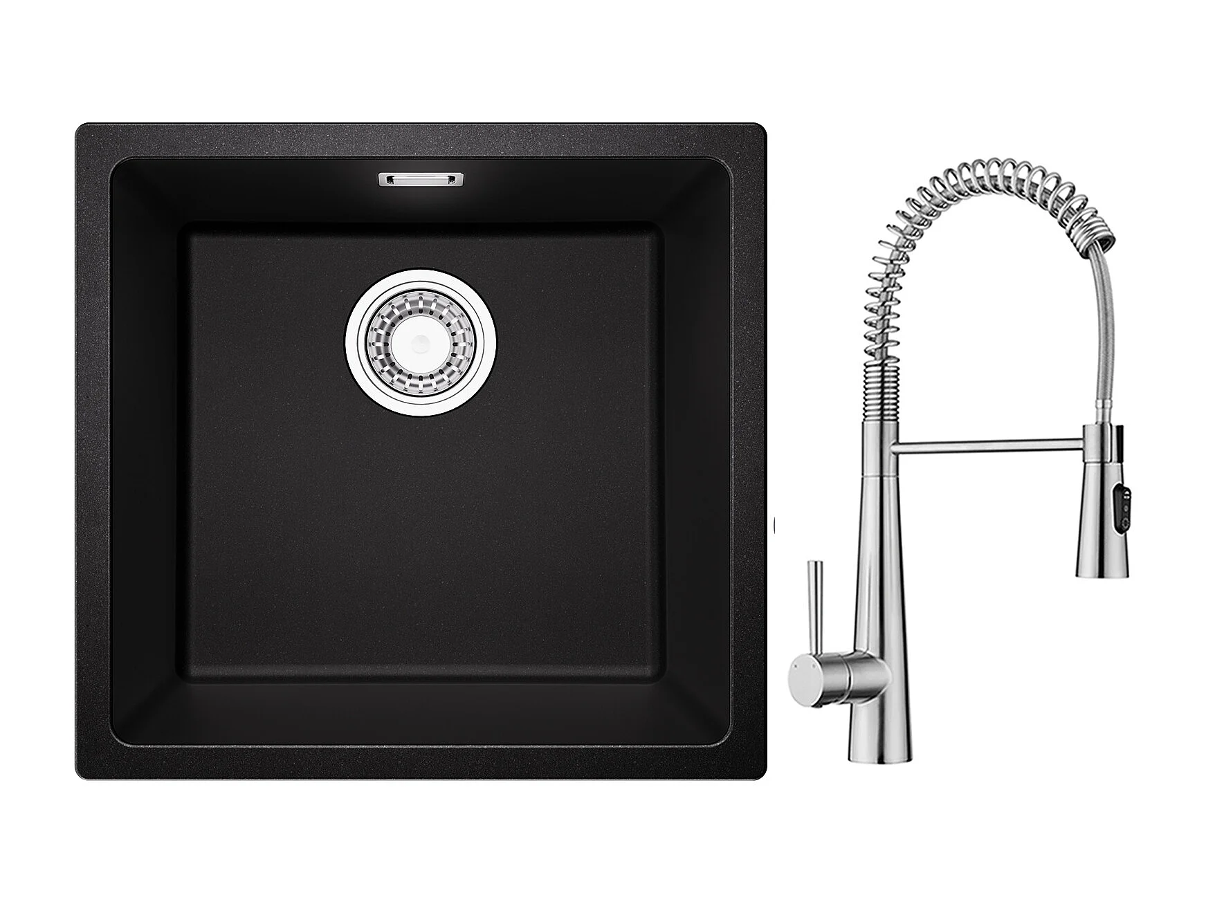 CECIPA MAX Evier 1 Bac en Quartz et Résine Noir Gris 45*44*20cm + Mitigeur de Cuisine à Ressort avec 3 Modes de Sortie D'eau, Brossé