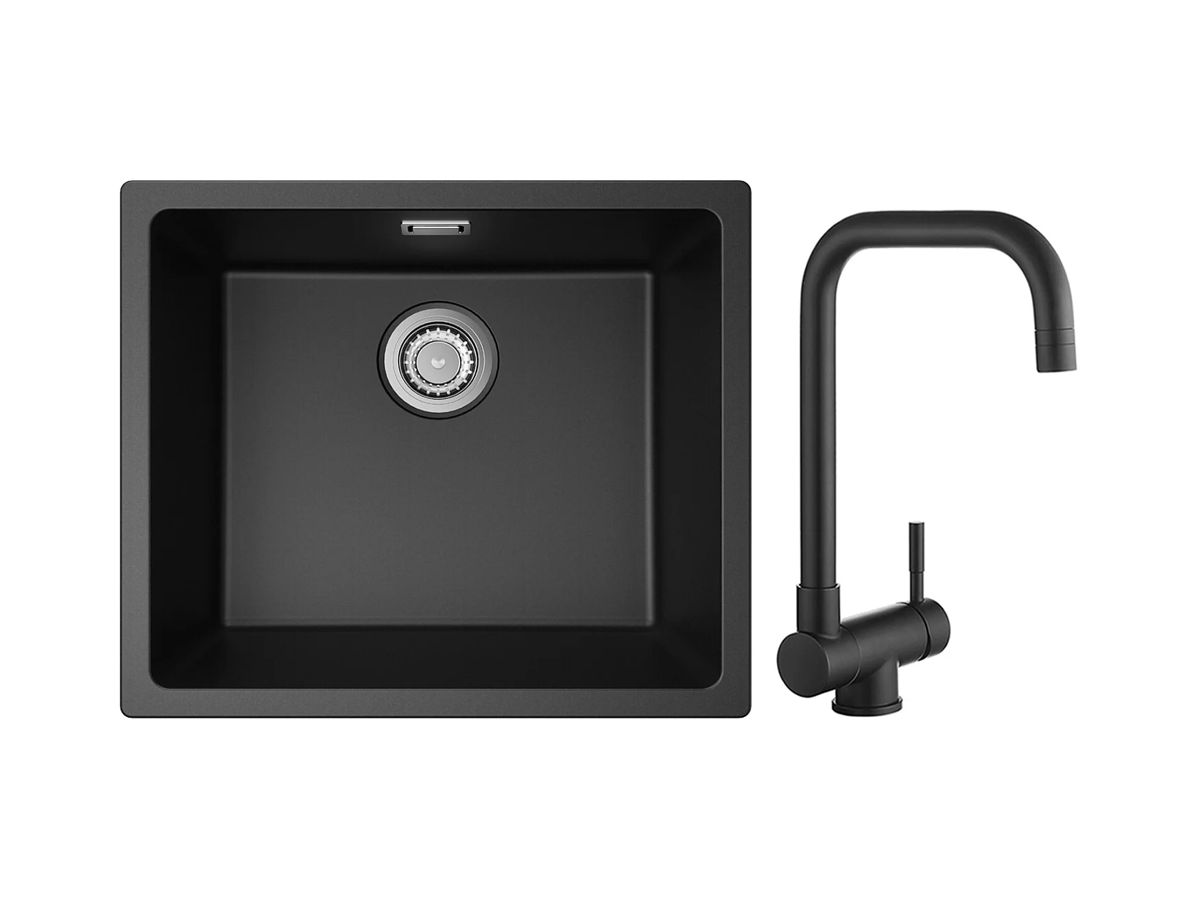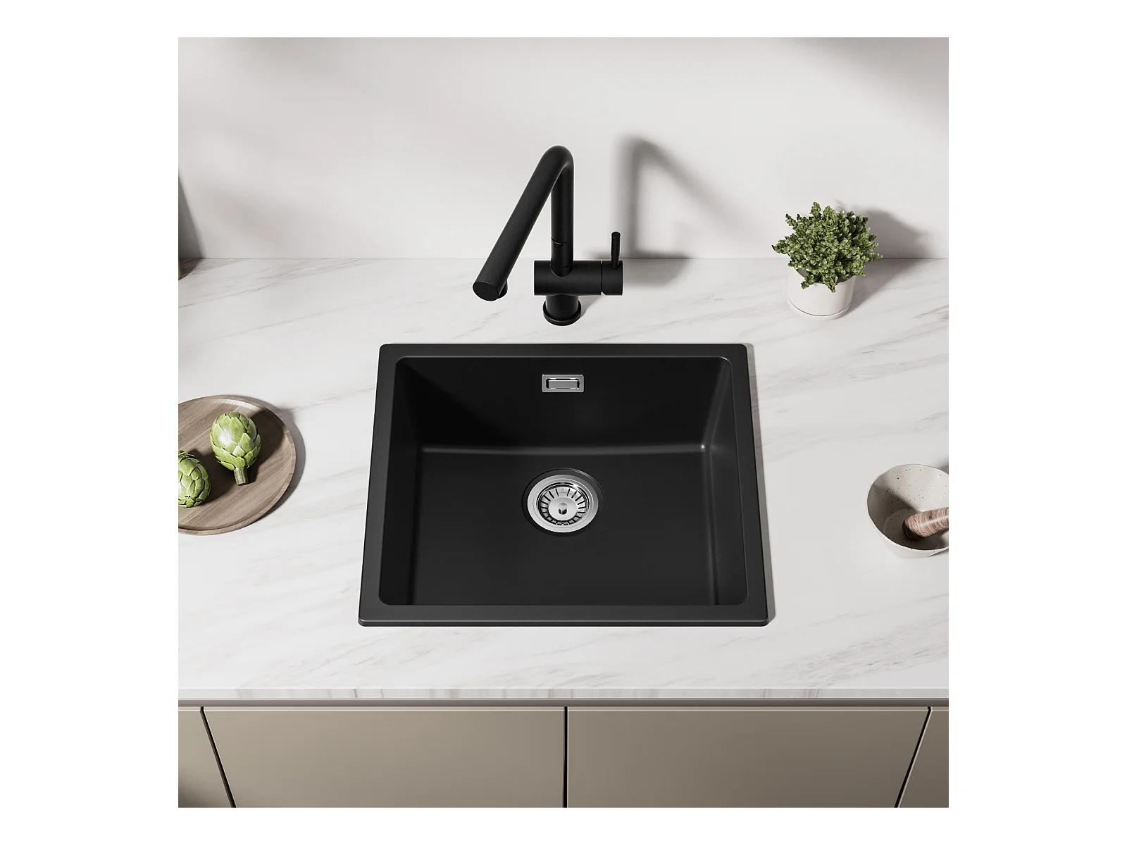CECIPA MAX Evier 1 Bac en Quartz et Résine Noir Gris 50*44*20cm + Mitigeur Rabattable Noir Robinet Pliable Mitigeur Sous Fenêtre