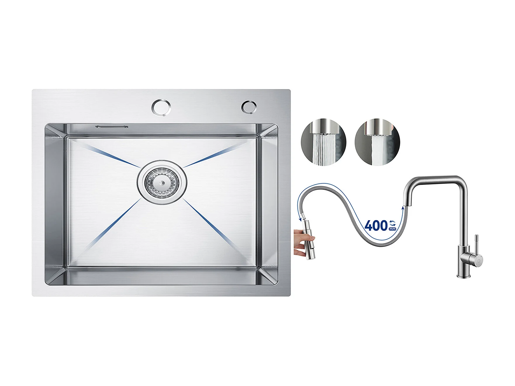 Cecipa max Évier Inox Évier Cuisine 1 Bac 50 × 45 cm Évier de Cuisine Brossé + Mitigeur avec Douchette Extractible, 3 Modes de Sortie D'eau, Brossé