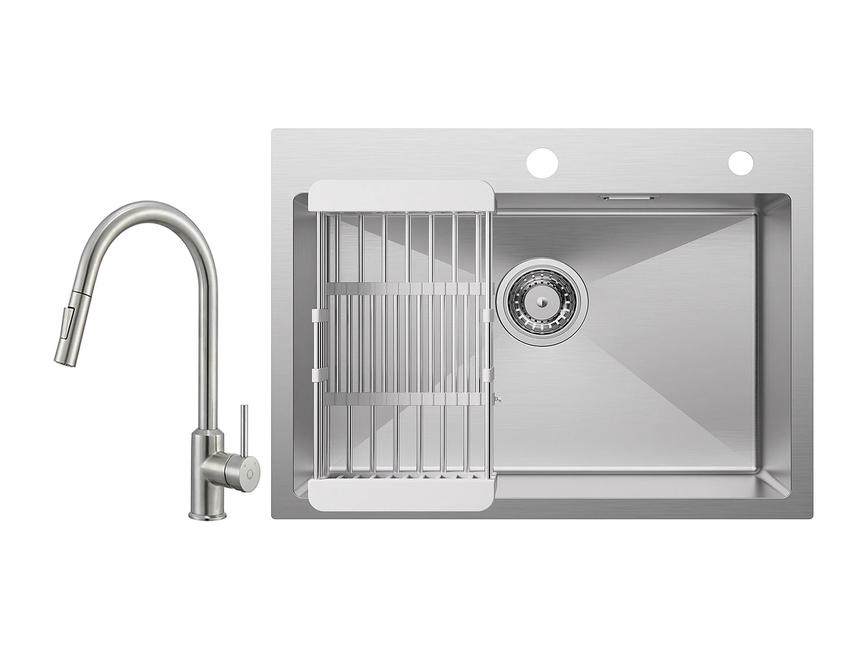 Cecipa max Évier Cuisine 1 Bac 60×45×18CM Évier Inox Brossé avec Panier de Drainage + Mitigeur avec Douchette Extractible - 2 Modes de Sortie D'eau