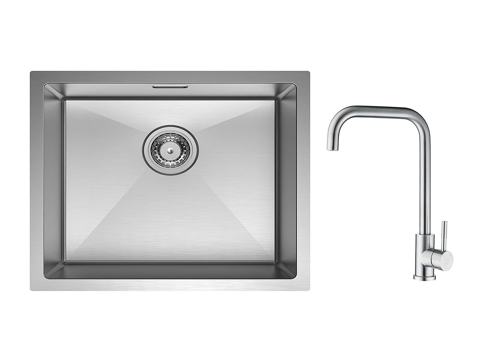CECIPA MAX Évier de Cuisine 1 Bac Brossé Évier Inox 50*44CM + Mitigeur de Cuisine en Inox Brossé avec Bec Haut et Incurvé