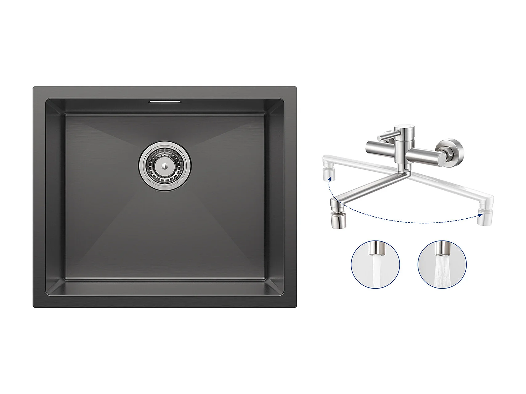 Cecipa max Évier 1 Bac 50*44cm Évier de Cuisine en Inox Noir Anthracite + Mitigeur de Cuisine à Ressort avec 3 Modes de Sortie D'eau, Brossé