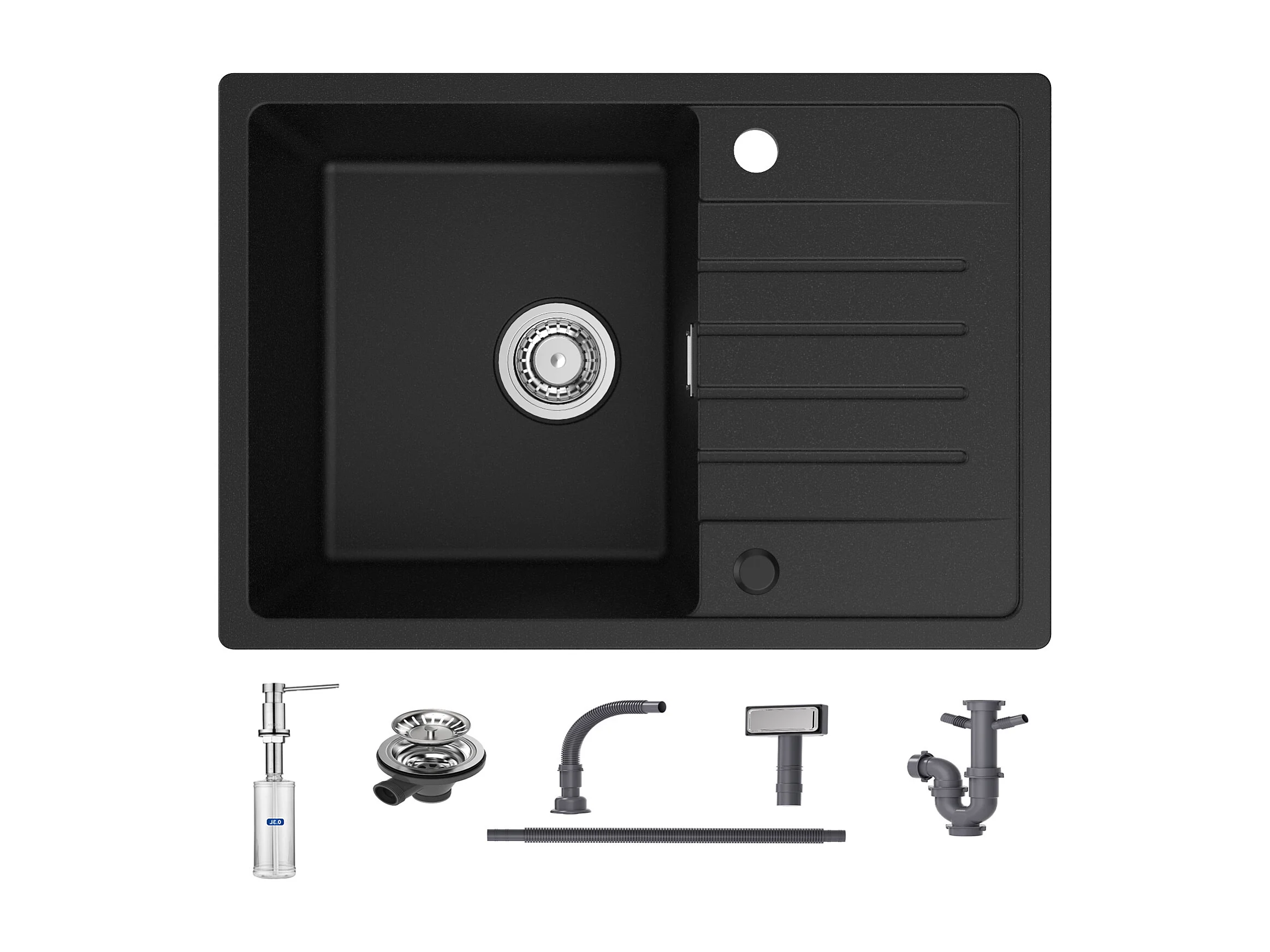 Cecipa max Evier de Cuisine avec égouttoir Noir 65 x 45 cm Evier à encastrer Evier 1 Bac Quartz et résine + 300ML Distributeur de Savon Brossé