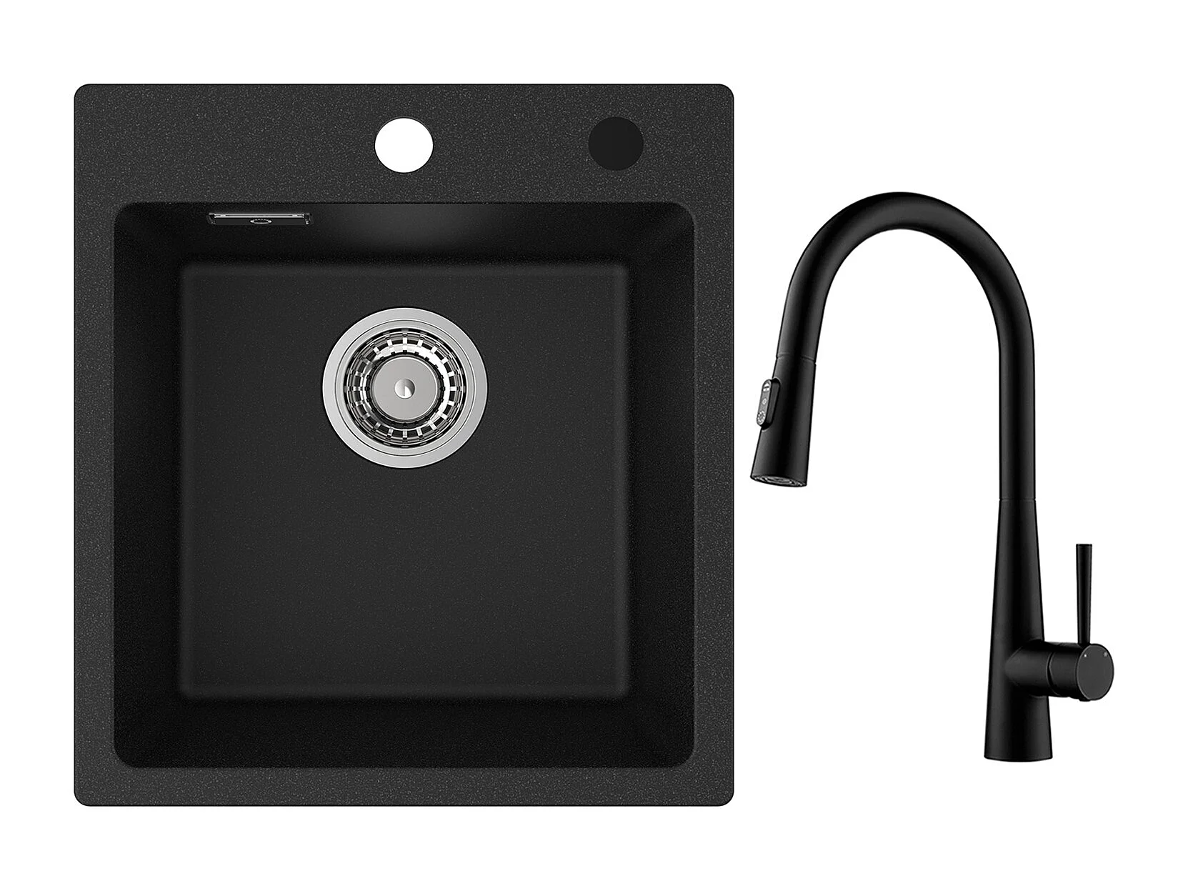 Cecipa max Evier de Cuisine en Quartz et Résine 40x45cm Evier Quartz 1 Bac Noir + Mitigeur avec Douchette Extractible, 3 Modes de Sortie D'eau, Noir