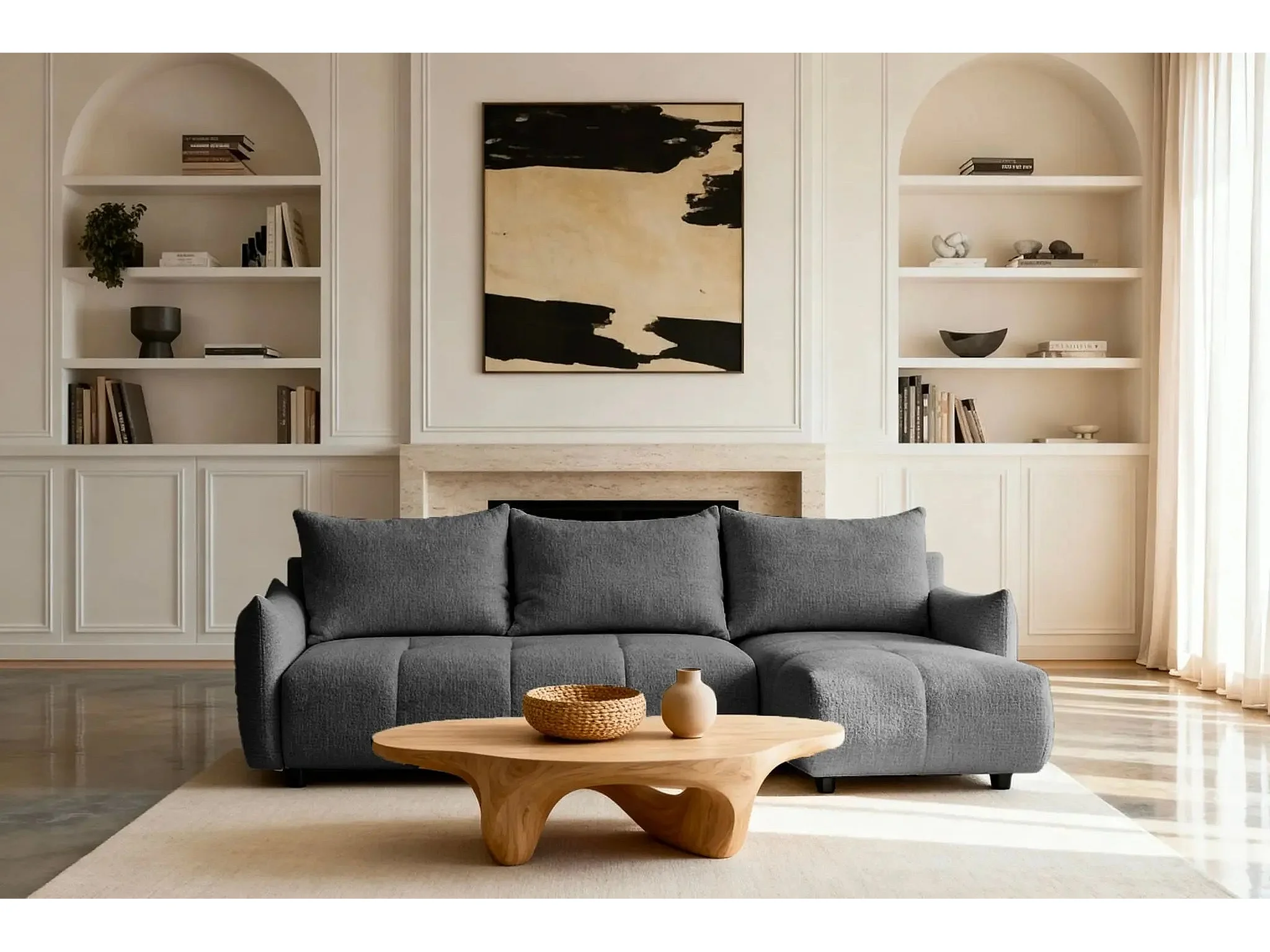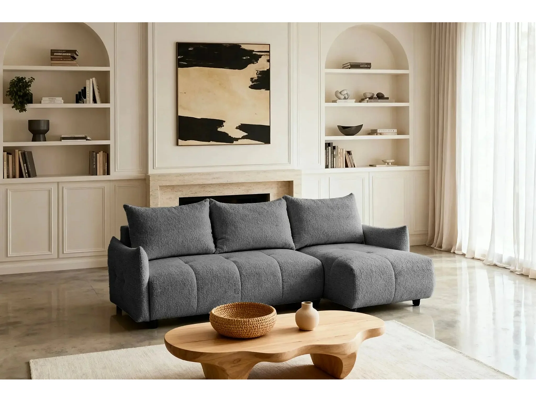 CELINE - Canapé d'angle convertible tissu chenille 4 places - Gris - 128cm