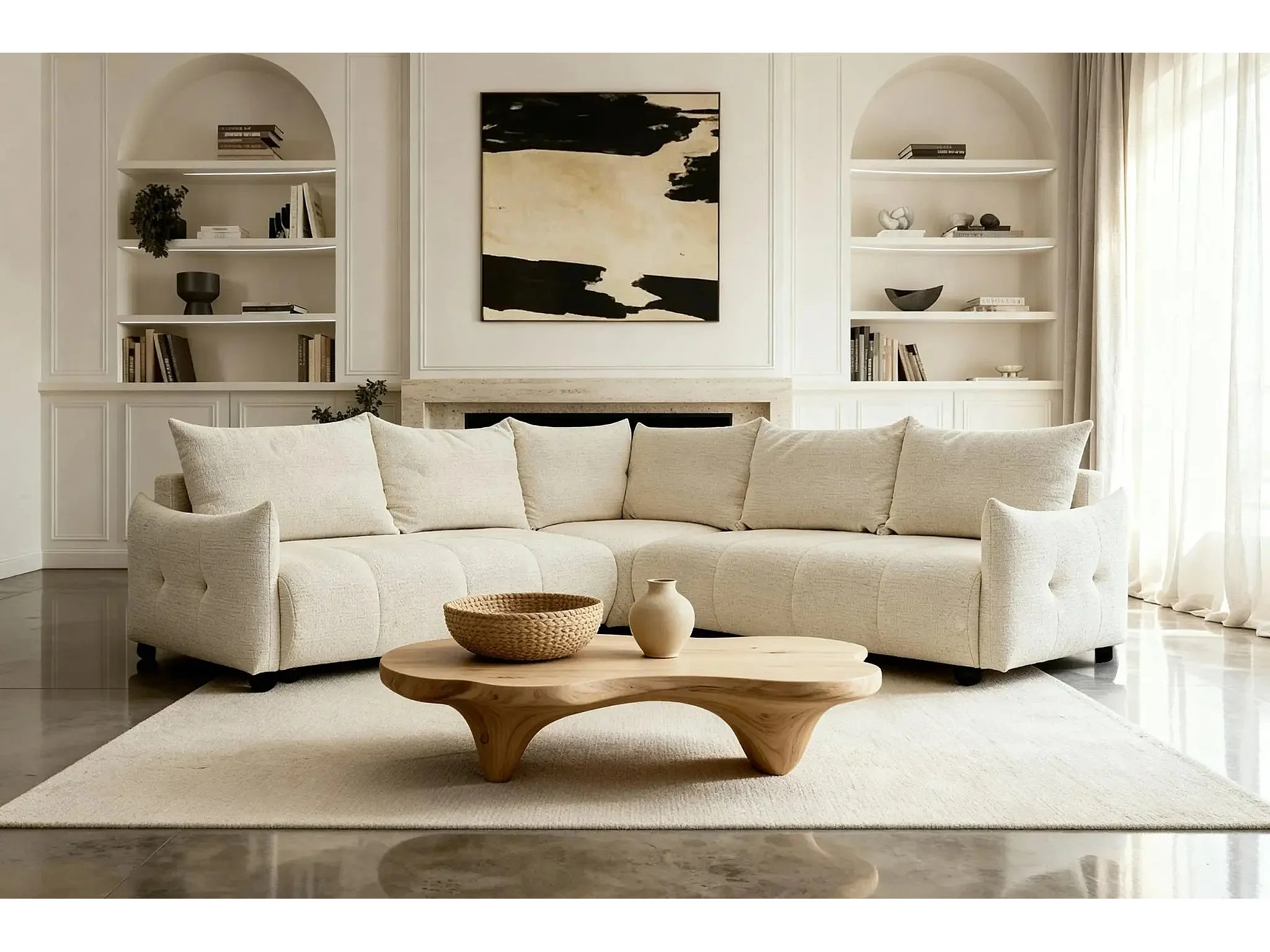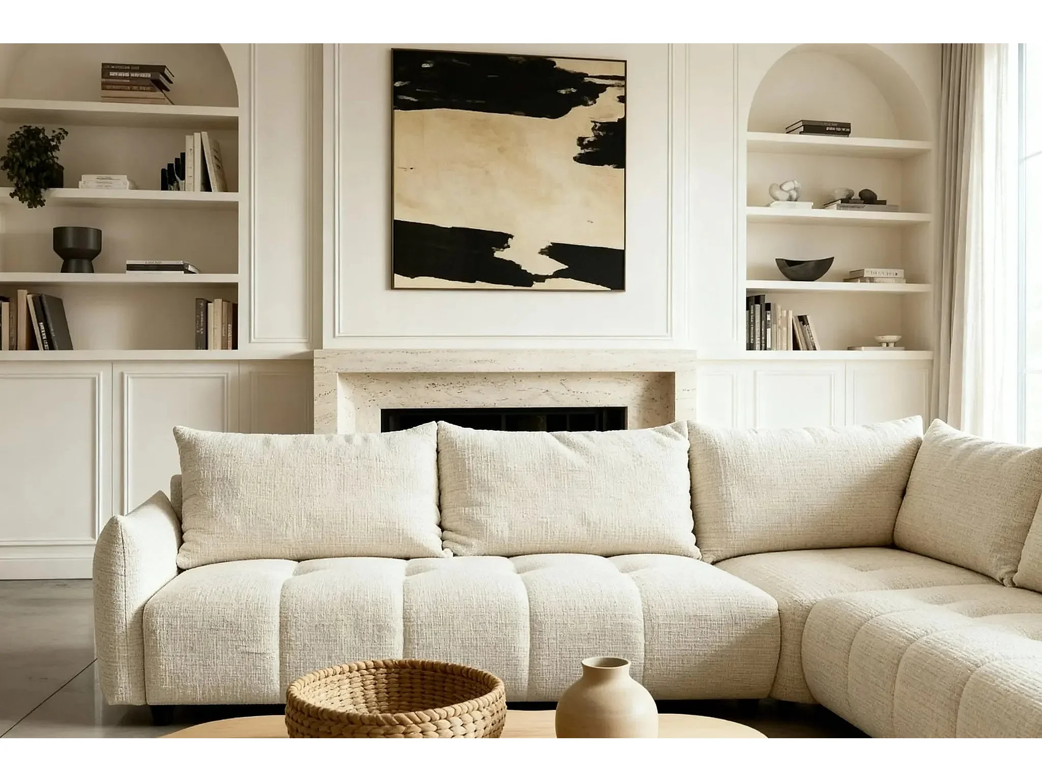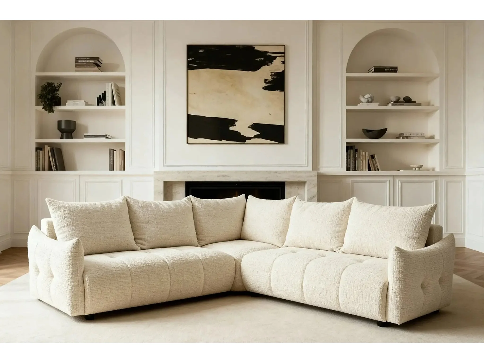 CELINE - Canapé panoramique convertible tissu chenille 5 places - Beige