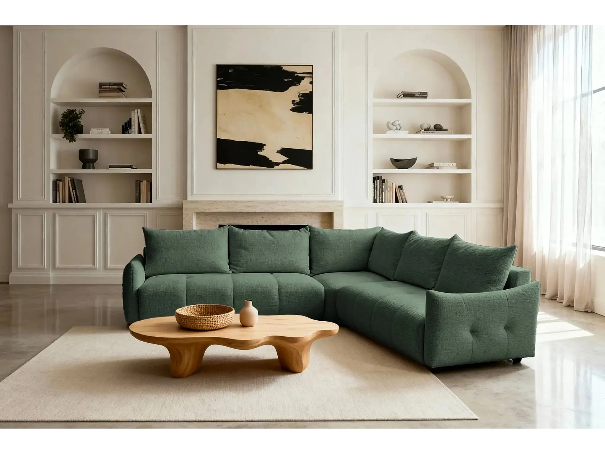 CELINE - Canapé panoramique convertible tissu chenille 5 places - Vert