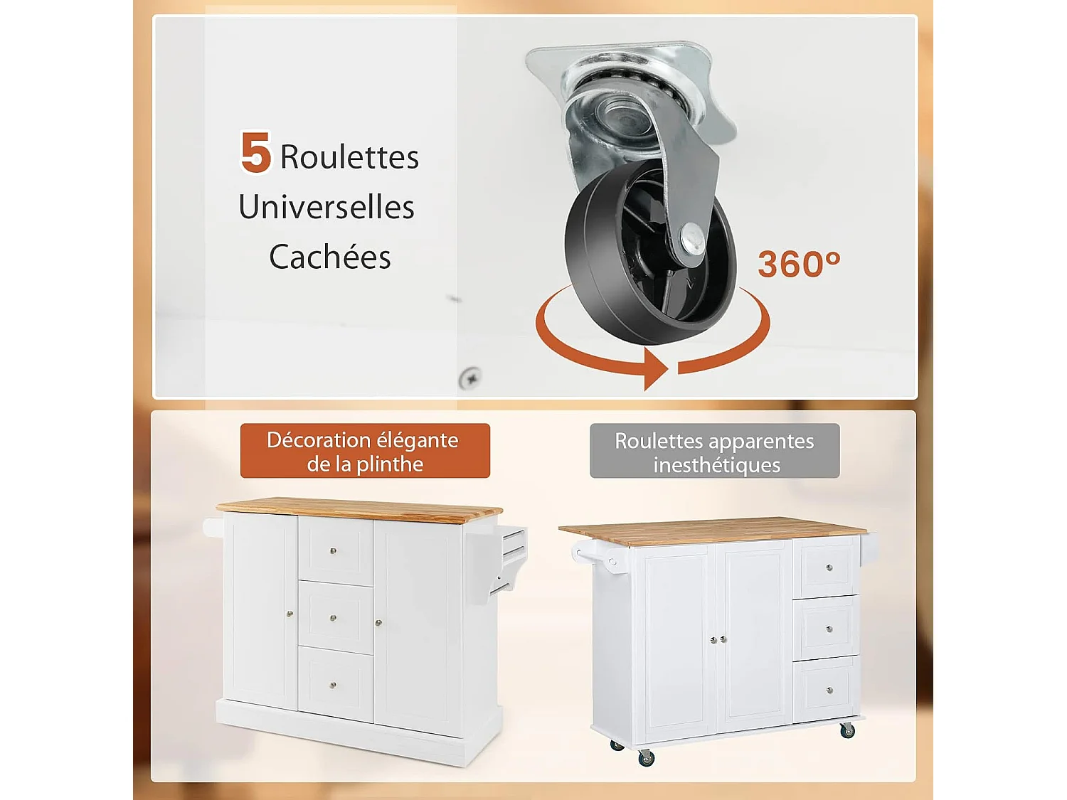 Ilot Central Cuisine Comptoir en Bois d'Hévéa, Desserte de Cuisine - 5 Roues Cachée 127x46x91,5cm