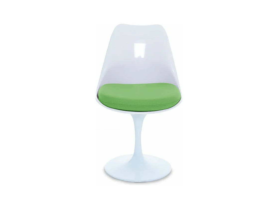 Chaise blanc brillant avec coussin tissu vert pétale de tulipe