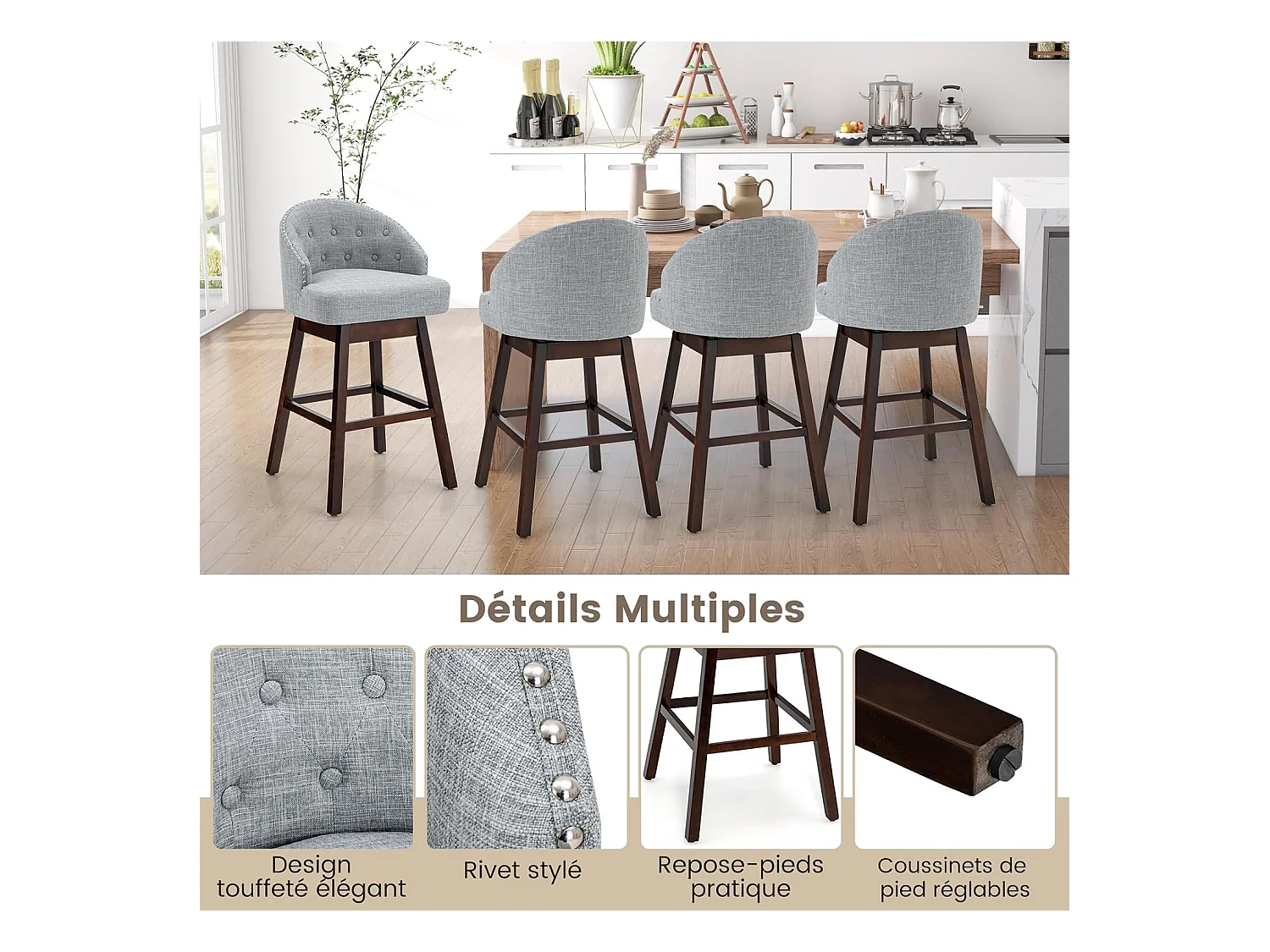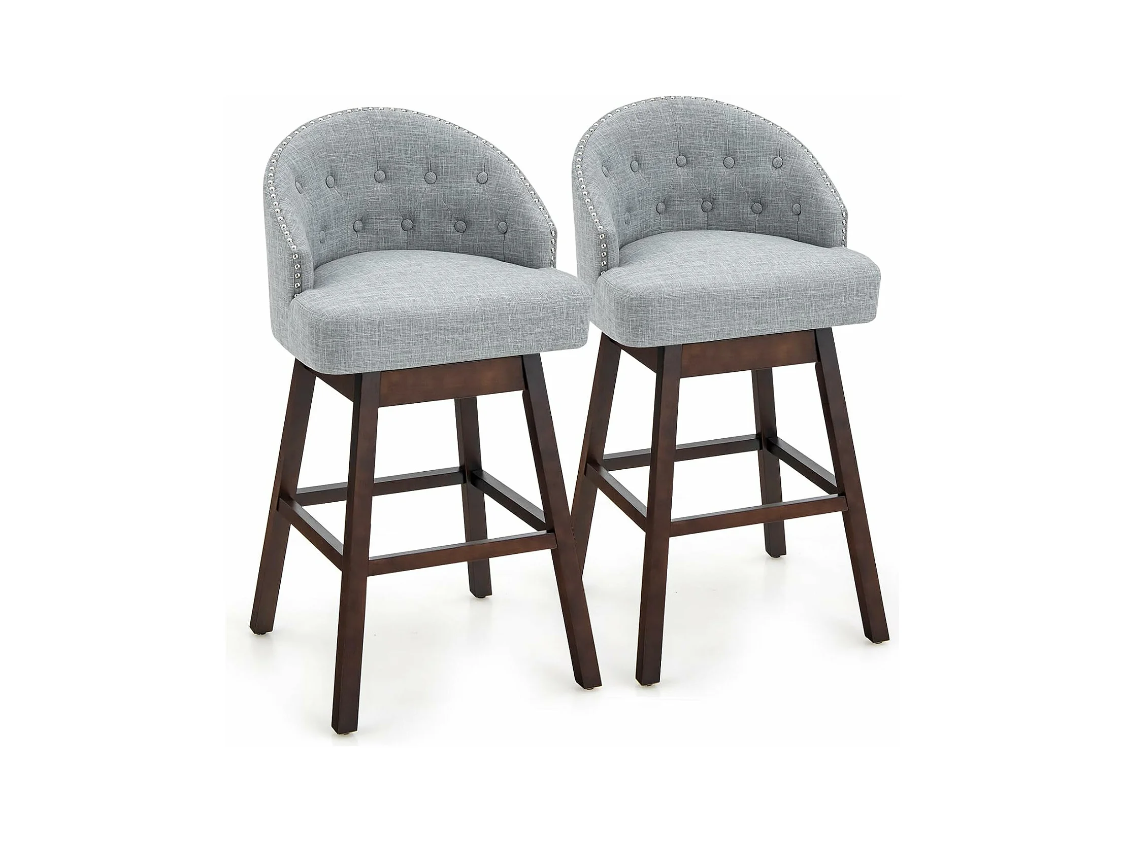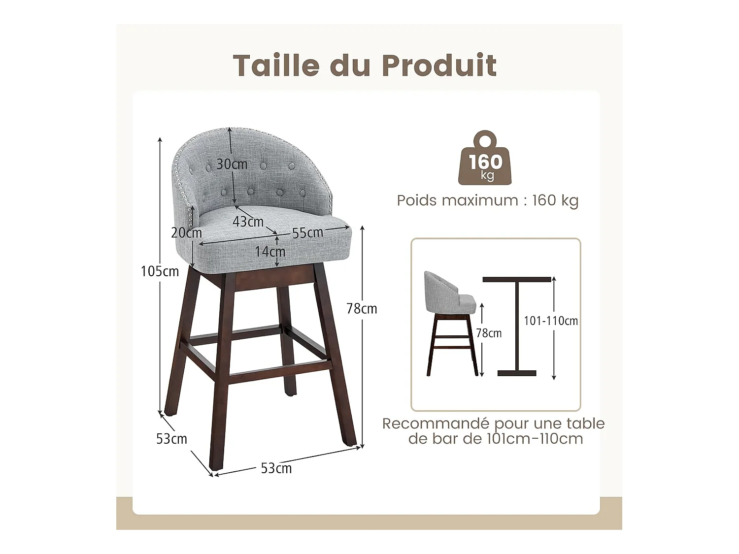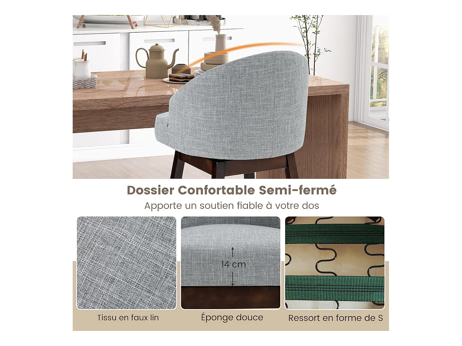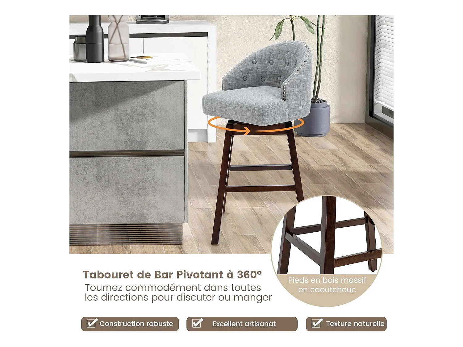 Chaise de bar pivotante Tabouret de bar lot de 2,rembourré en éponge, pieds en bois,repose-pieds gris
