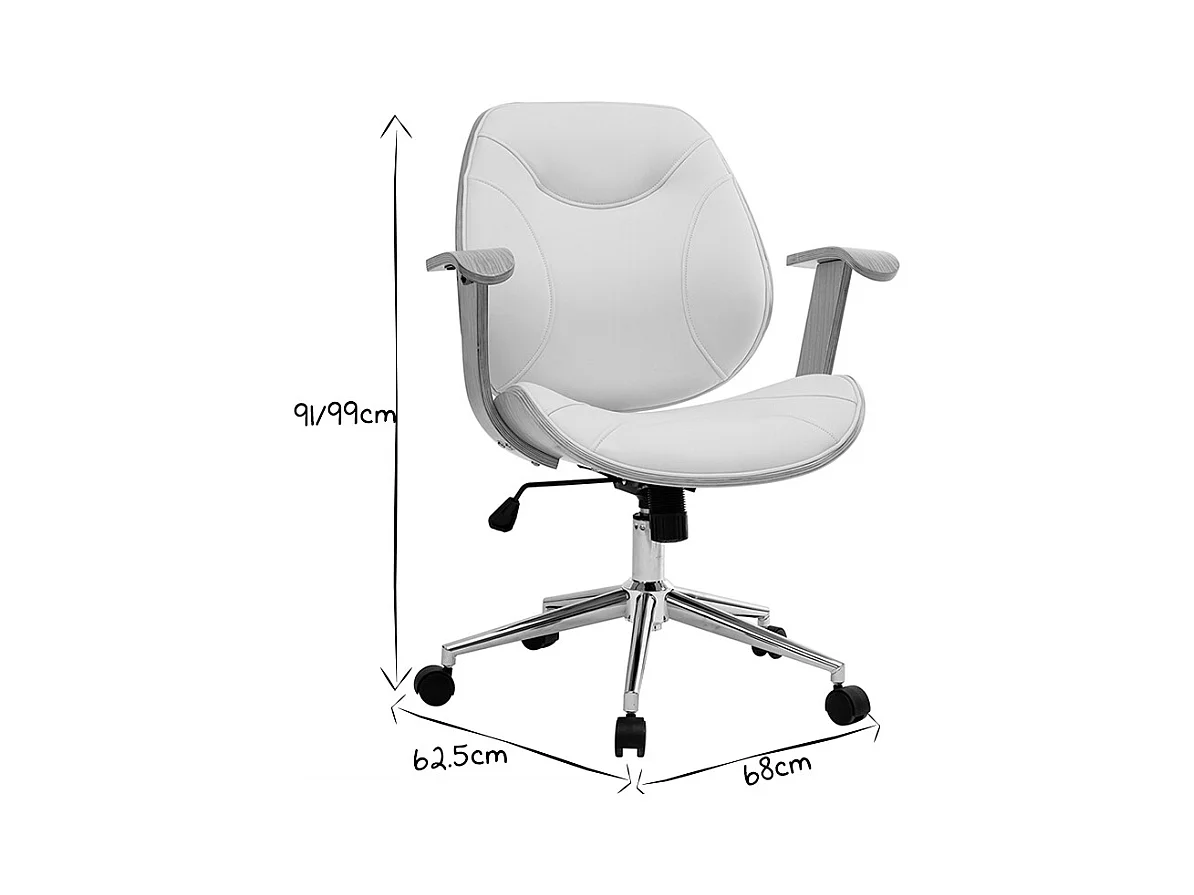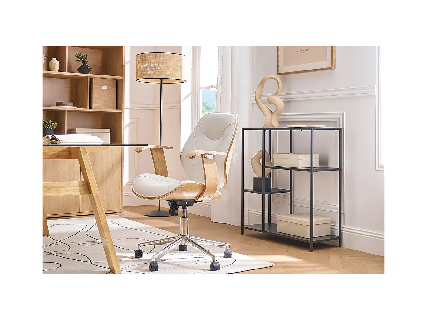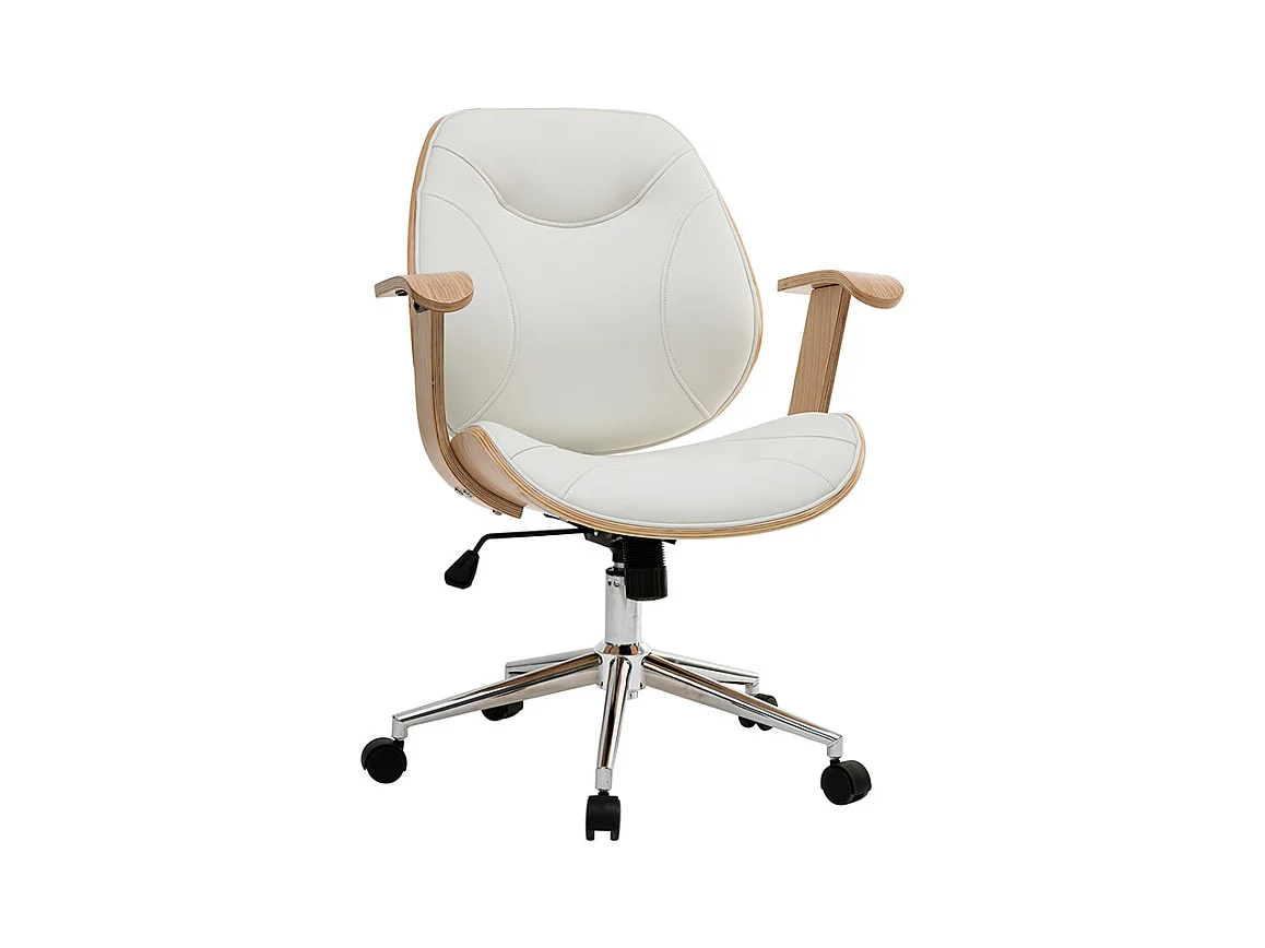 Chaise de bureau à roulettes design blanc, bois clair et acier chromé YORKE