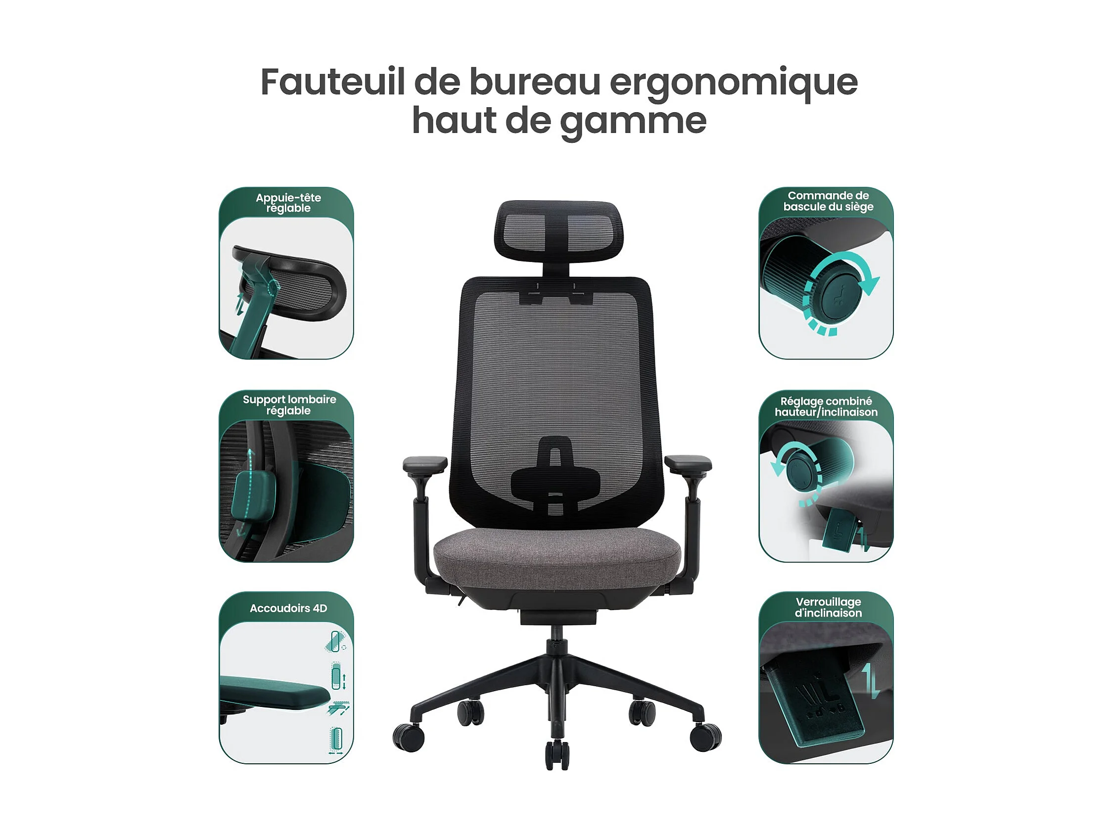 Chaise de bureau avec accoudoirs 4D et siège réglable avant-arrière, confort optimal pour travail intensif - Gris