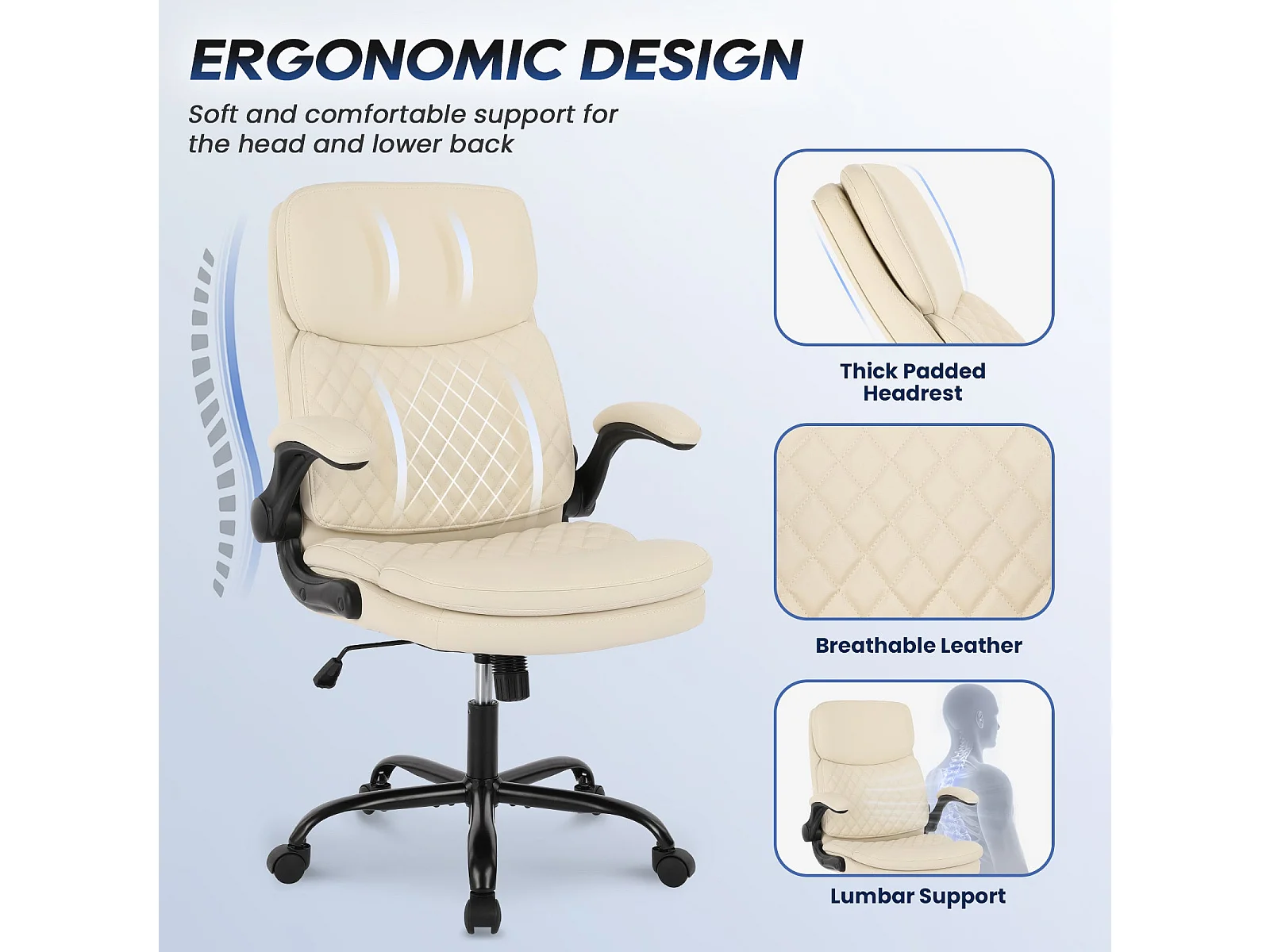 Chaise de bureau - Chaise de Bureau Ergonomique en Cuir – Hauteur Réglable, Dossier Inclinable, Accoudoirs Confortables – Beige