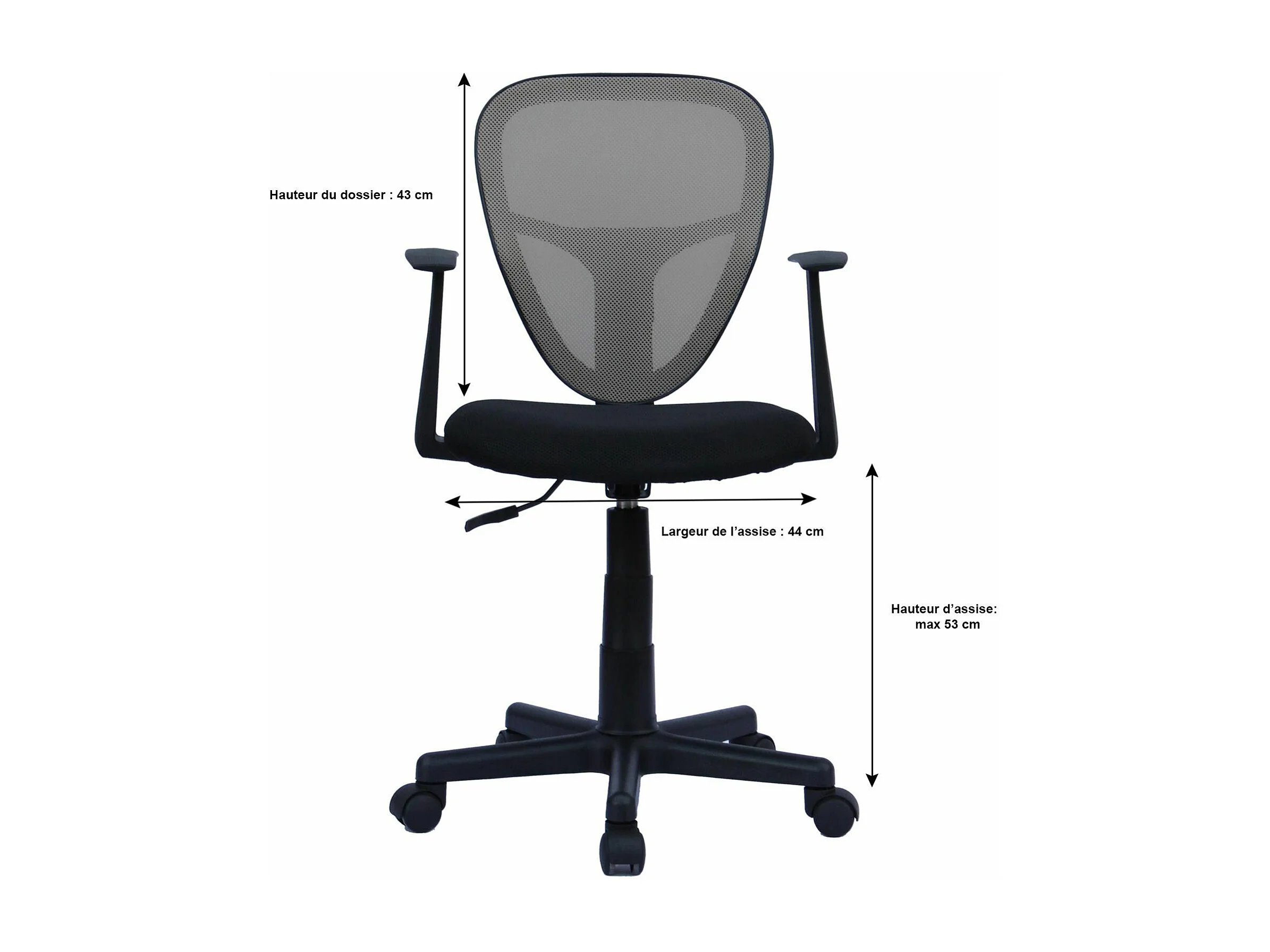 Chaise de bureau enfant STUDIO fauteuil pivotant et ergonomique avec accoudoirs, siège à roulettes hauteur réglable, mesh noir/gris