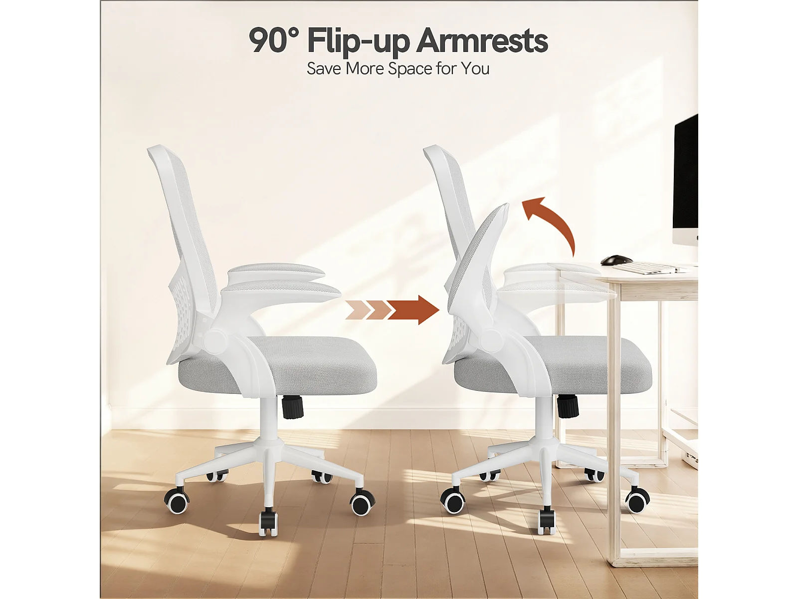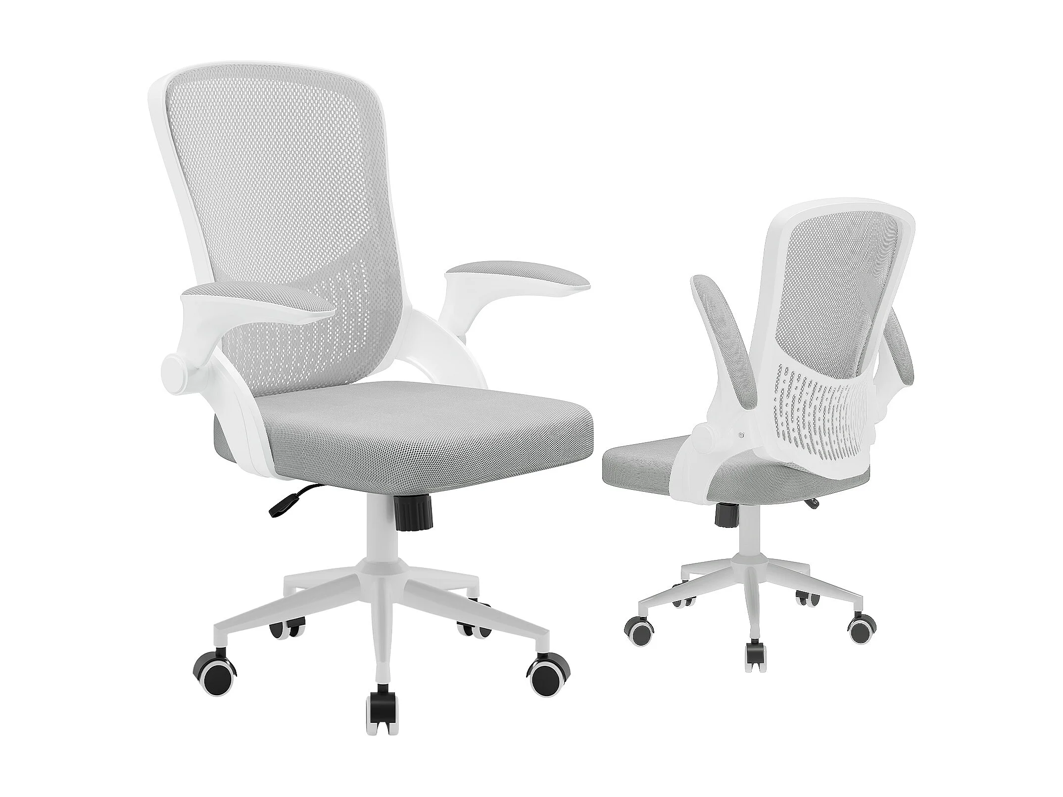 Chaise de bureau ergonomique avec accoudoirs rabattables, dossier moyen en résille avec soutien lombaire, hauteur réglable et rangement intégré au dossier