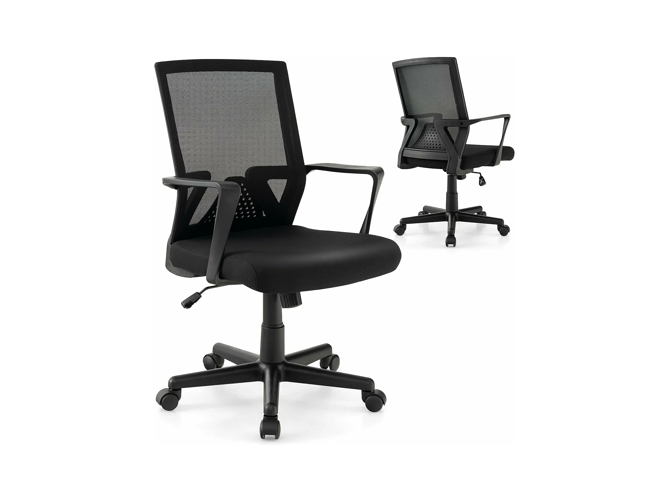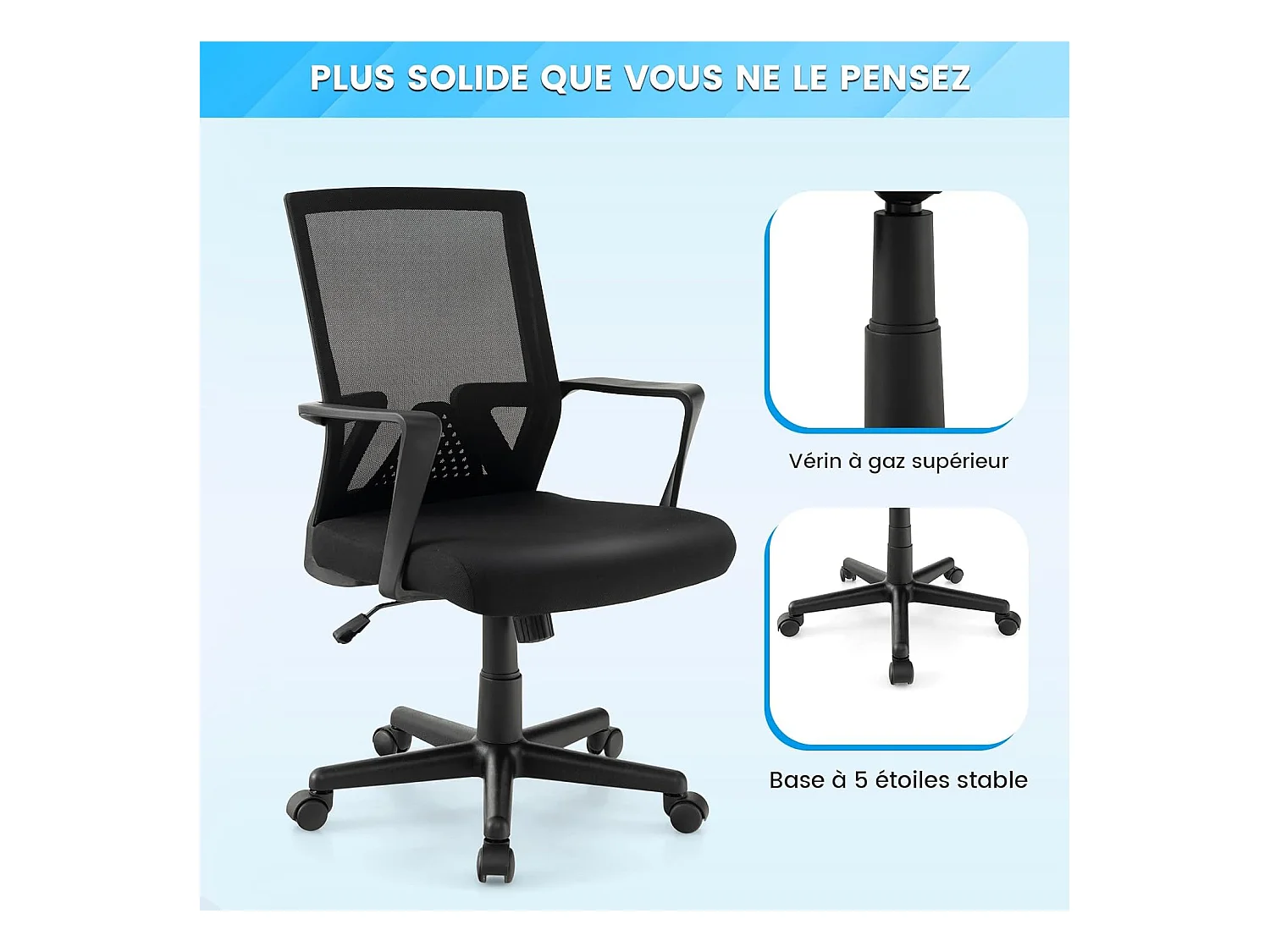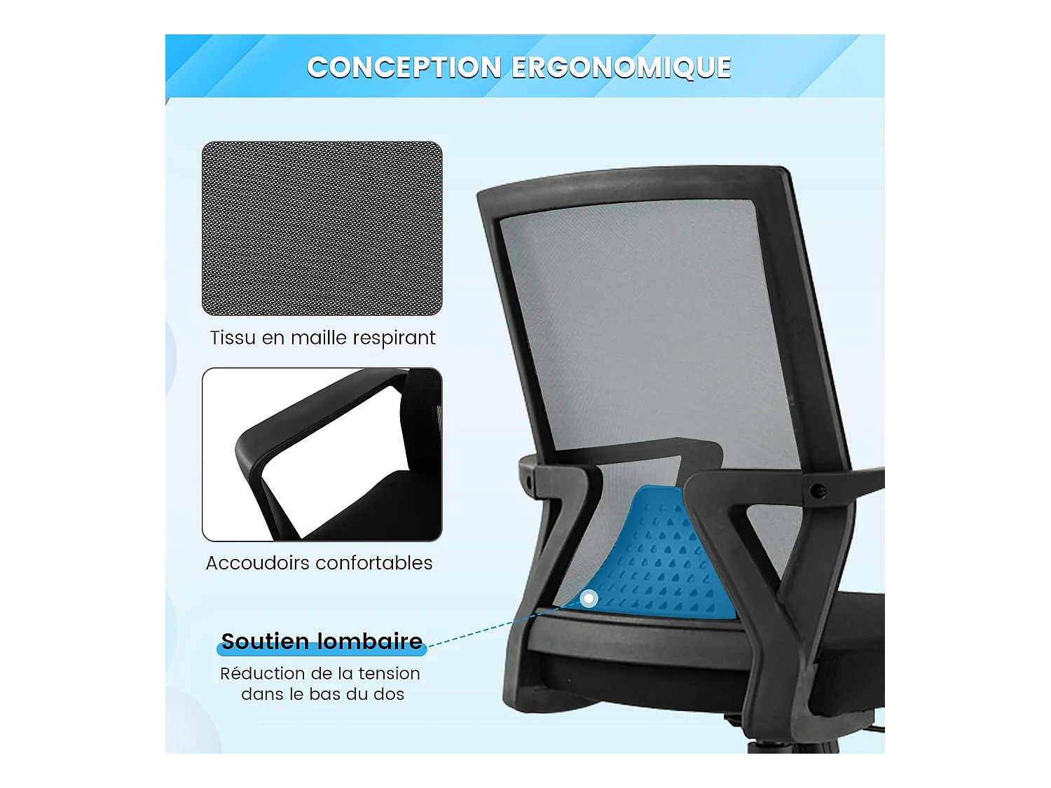 Chaise de Bureau Ergonomique, Chaise de Travail avec Soutien Lombaire et Dossier à Bascule, Pivotante en Maille avec Accoudoirs, pour Chambre, Bureau, Noir