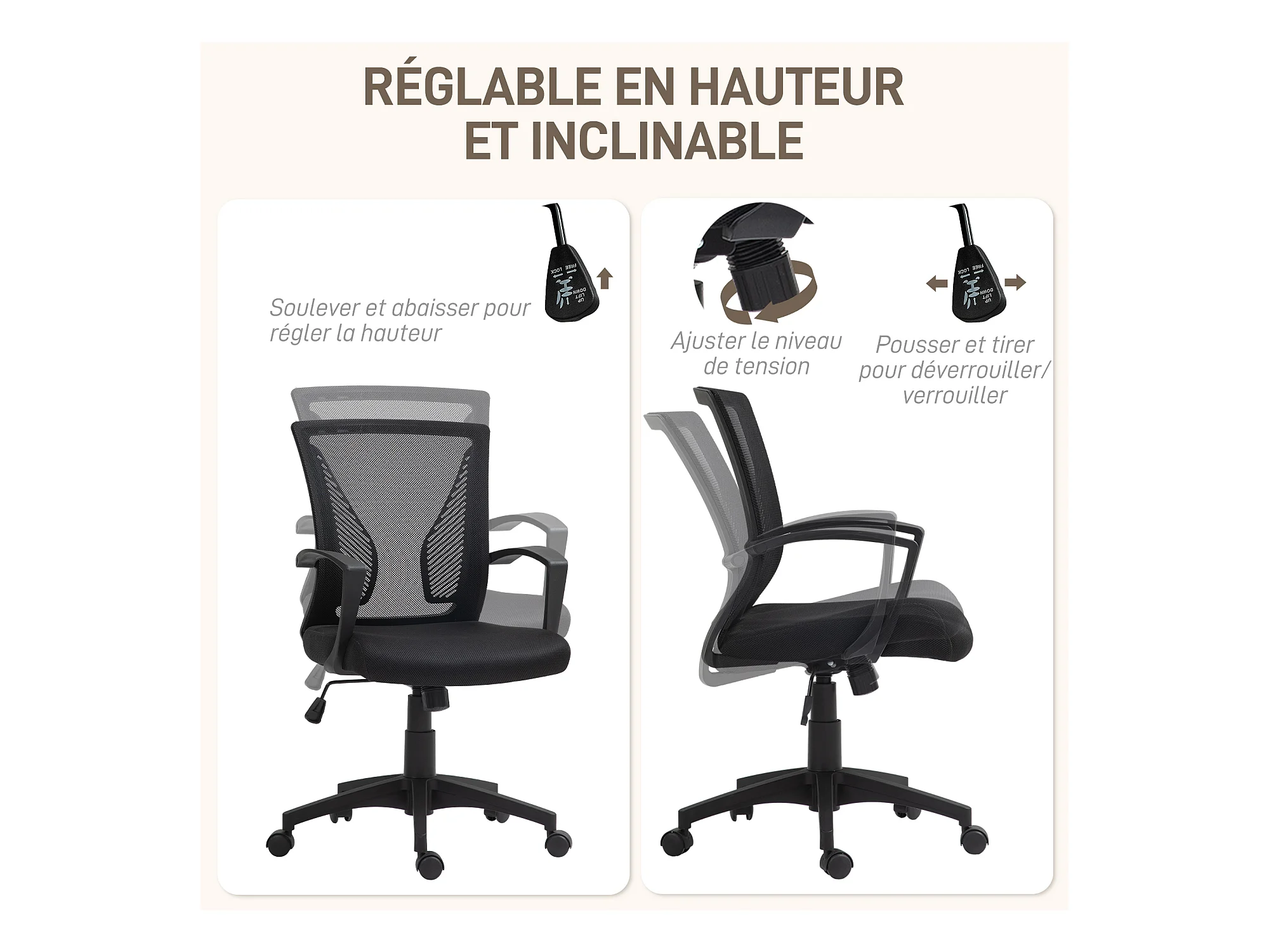 Chaise de bureau ergonomique - soutien lombaire intégré, fonction bascule verrouillable - polyester maille noir