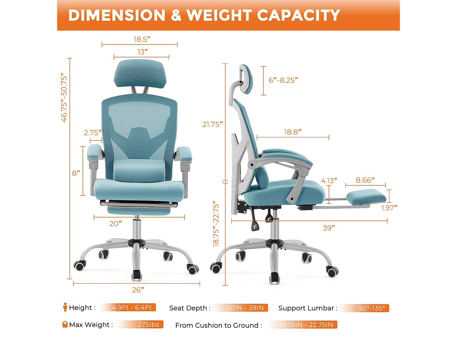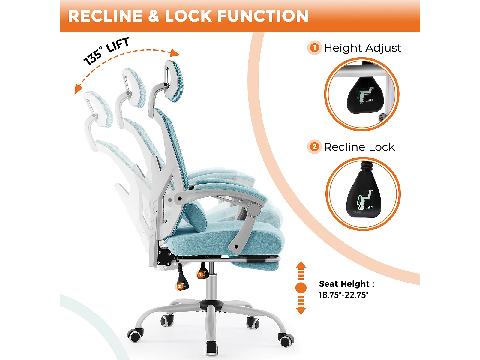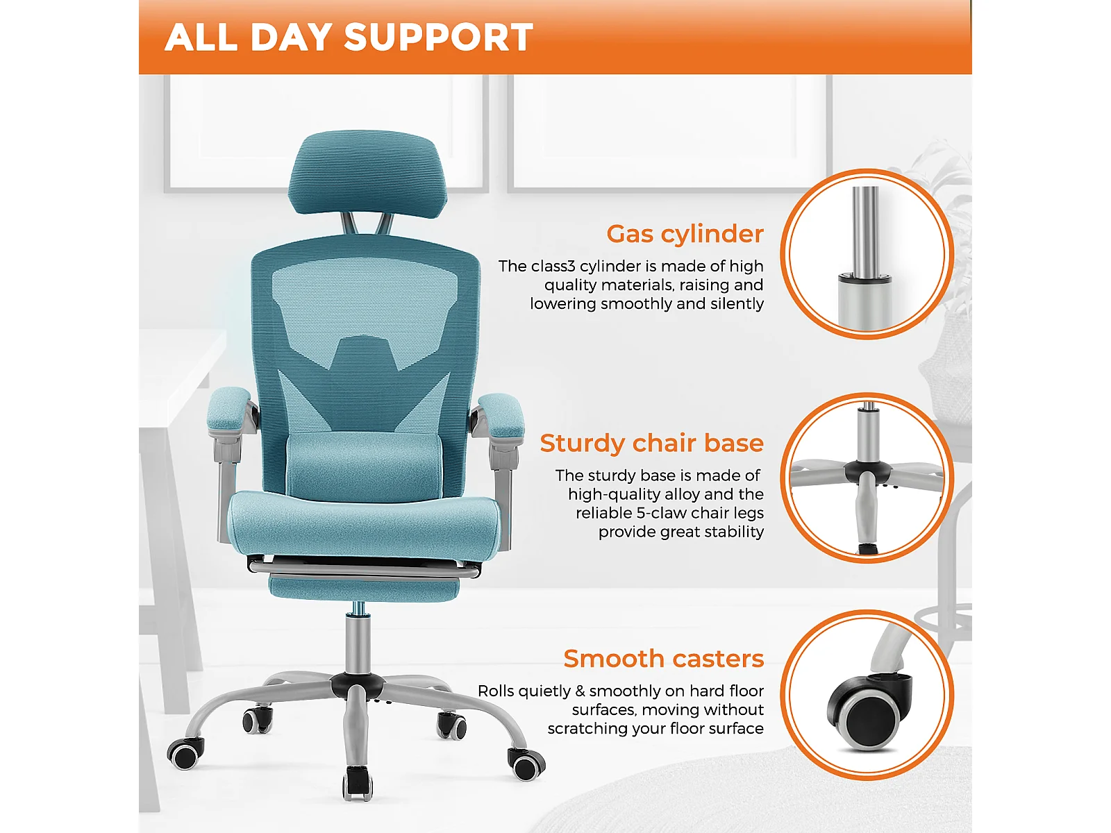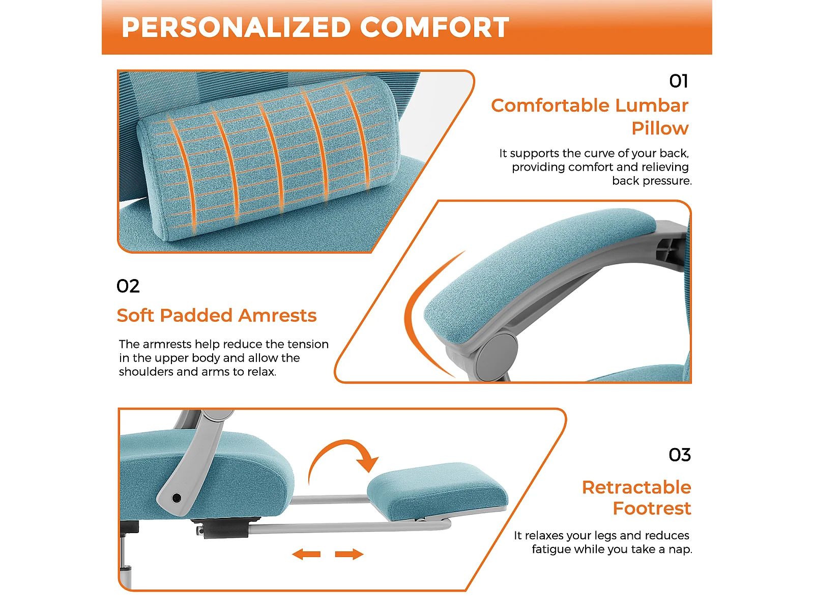 Chaise de bureau pivotante avec coussin de soutien lombaire et accoudoirs rembourrés, repose-pieds rétractable ergonomique, bleu