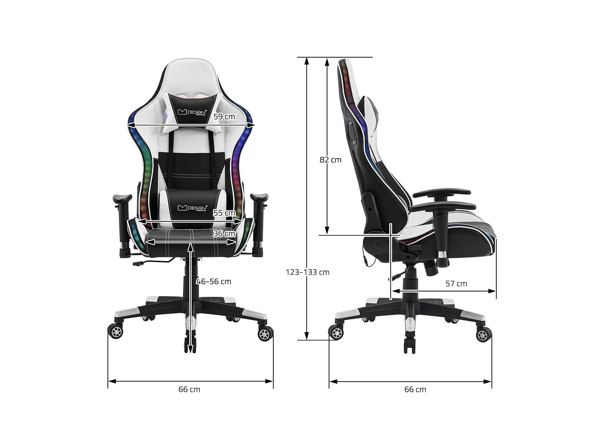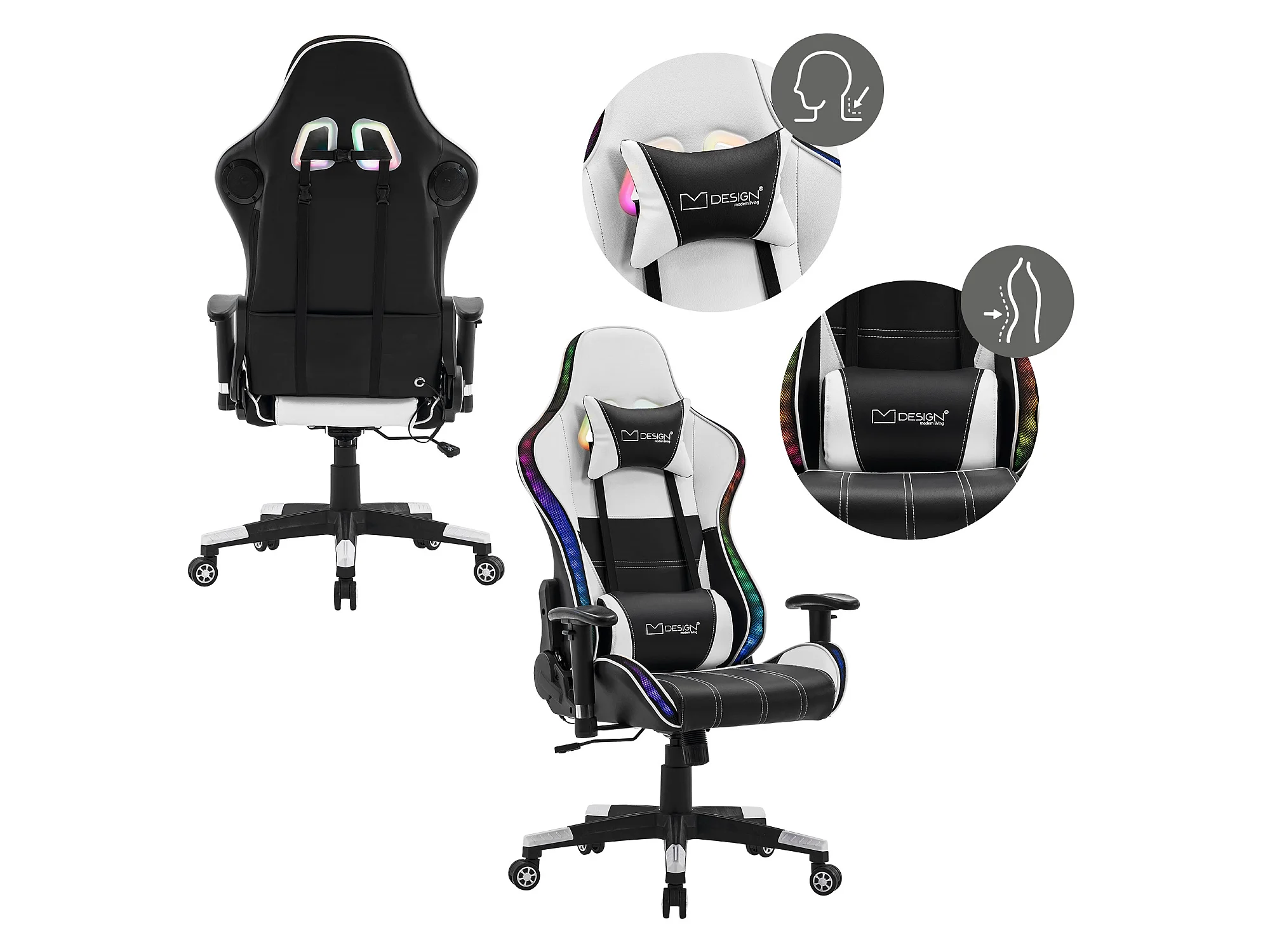Chaise de jeu avec éclairage LED, haut-parleurs Bluetooth, blanc, similicuir, ergonomique ML-Design