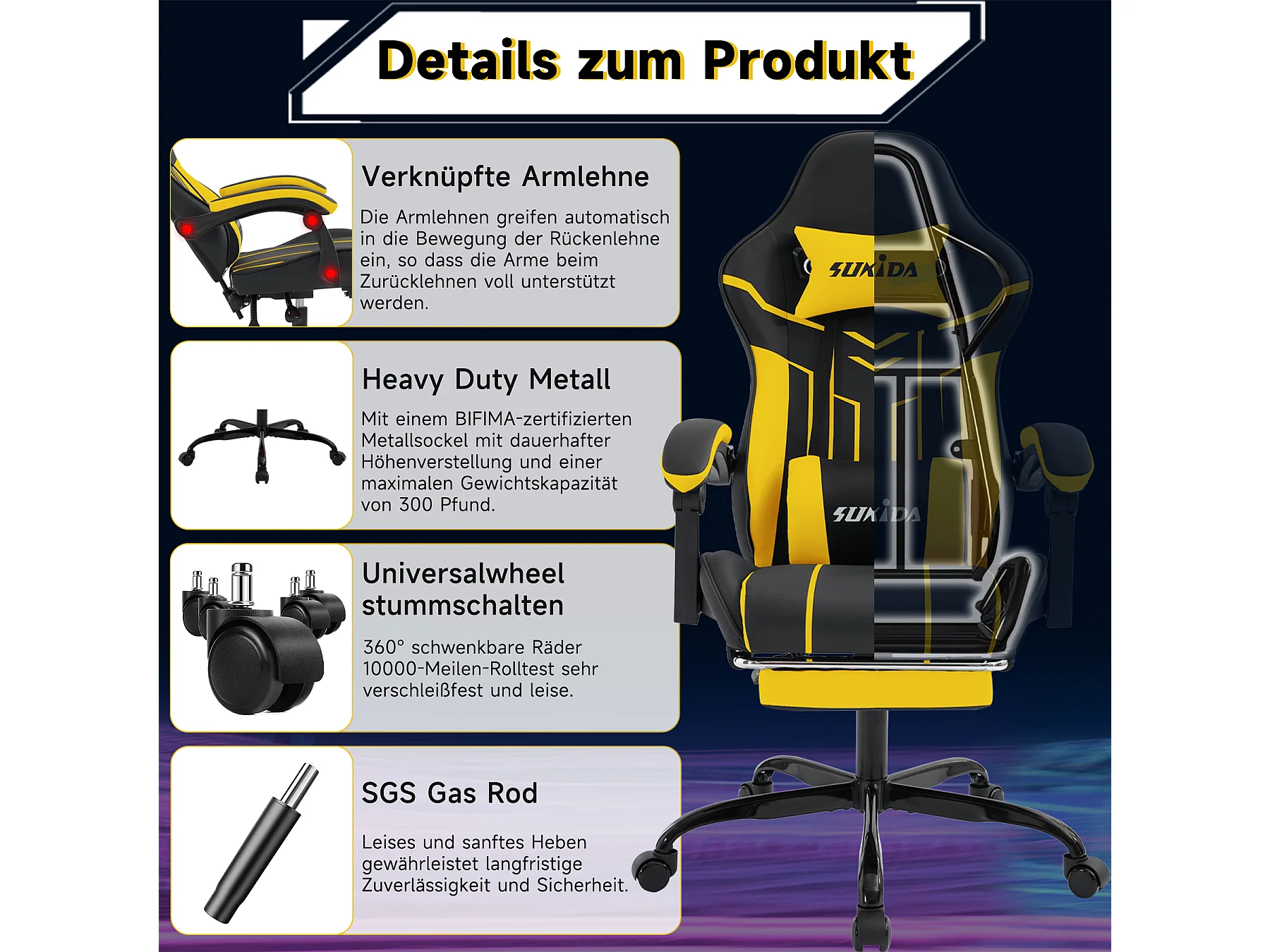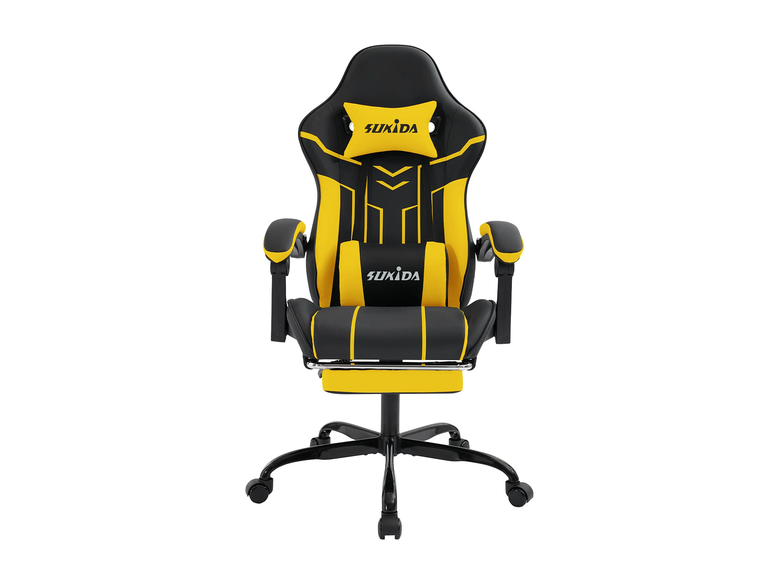 Chaise de jeu ergonomique avec repose-pieds, fauteuil de bureau avec dossier haut et soutien lombaire, noir et jaune (53x48x125 cm)