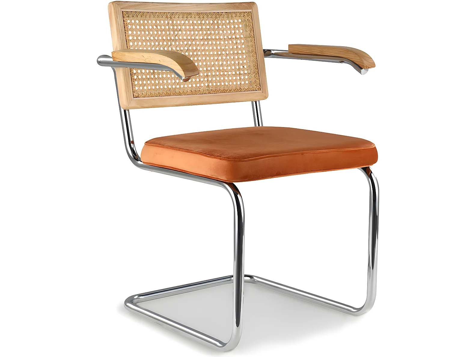 Chaise de salle à manger avec accoudoirs - Tapisserie en velours - Bois et rotin - Martha Orange rougeâtre