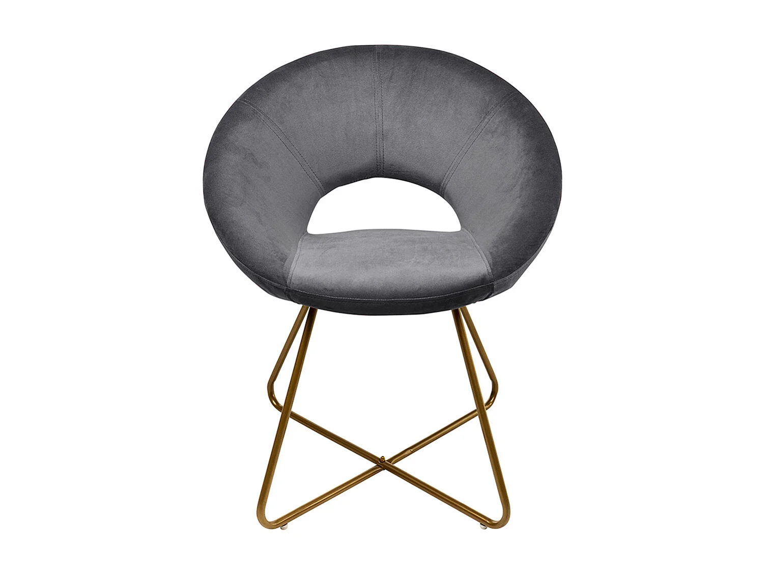 Chaise design SELESA velours gris avec accoudoirs, structure métal doré, confort dossier arrondi, 120 kg