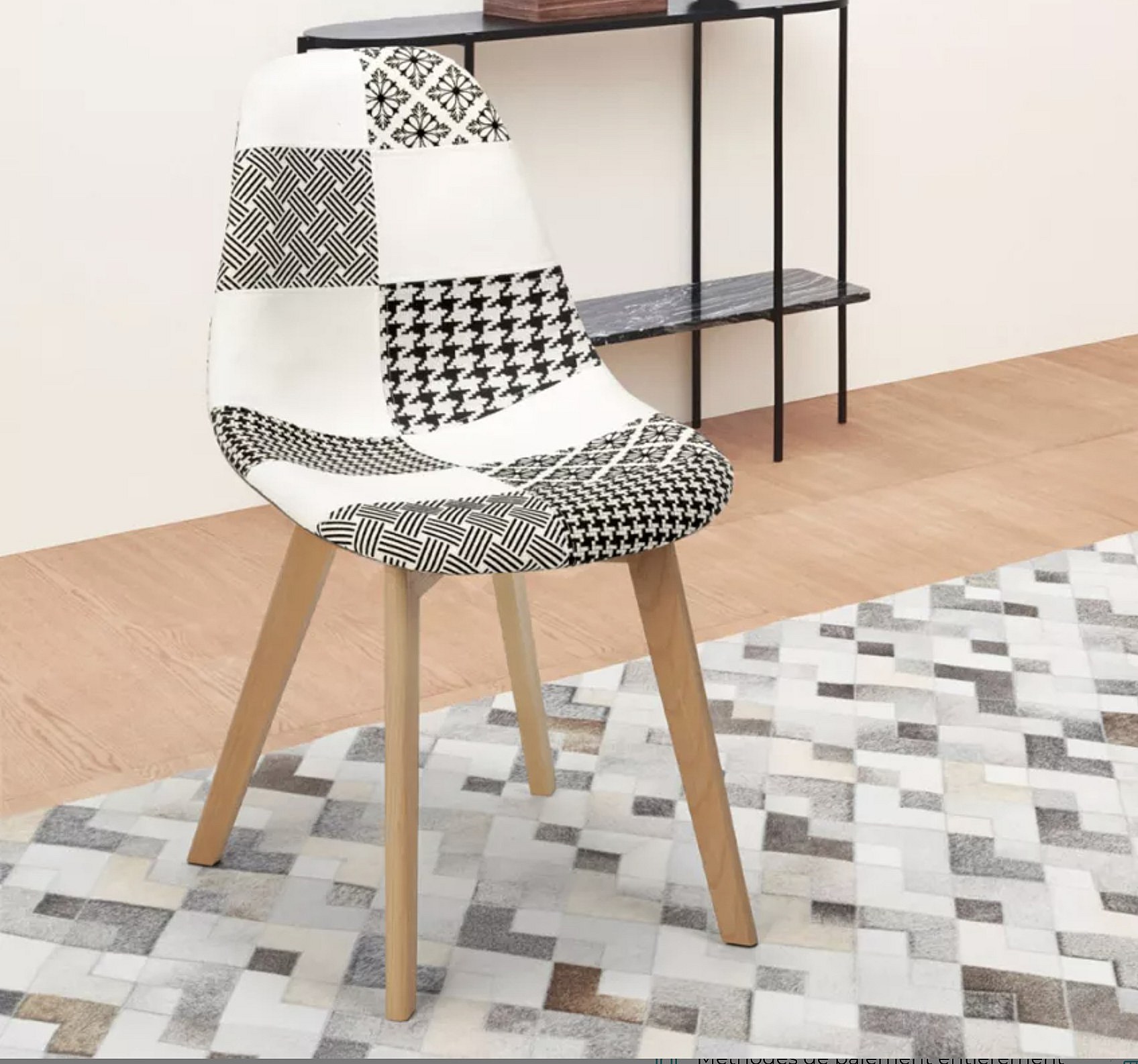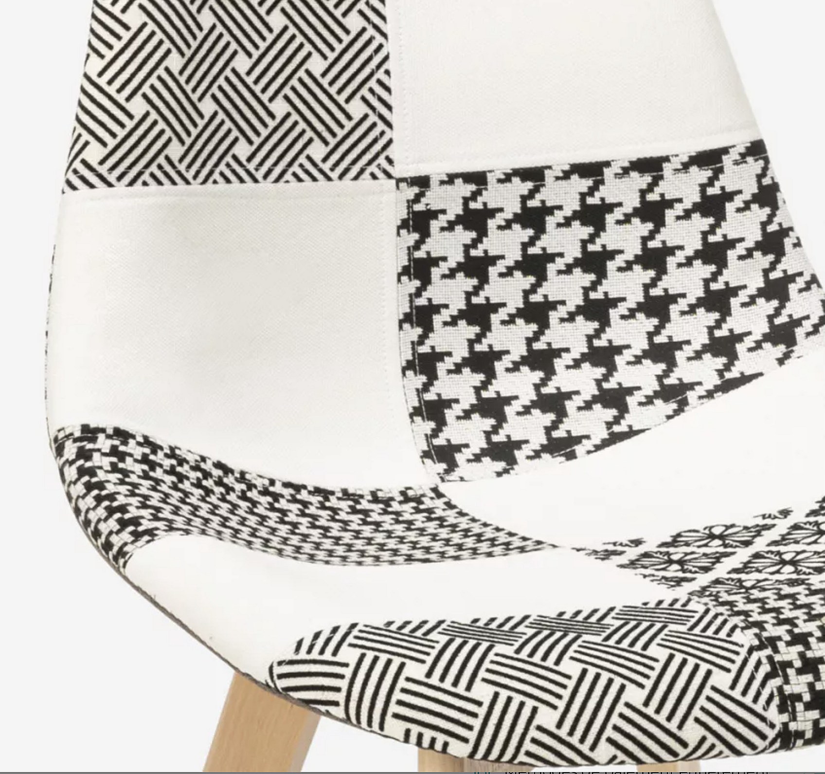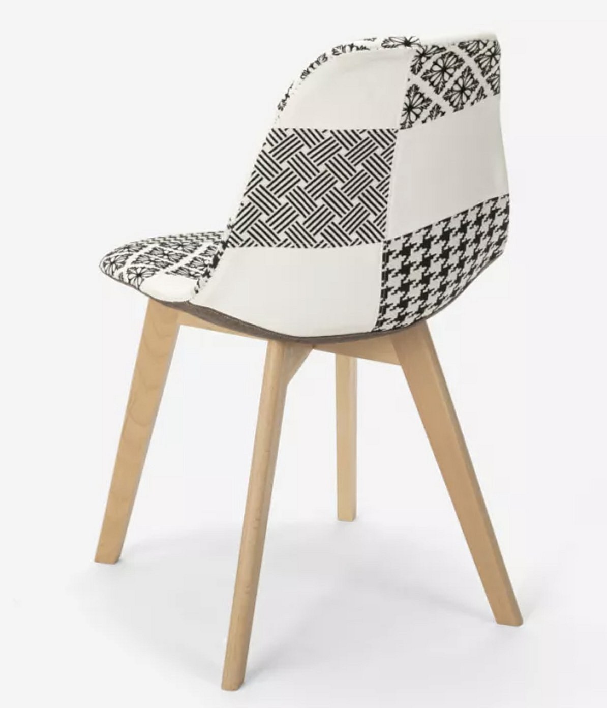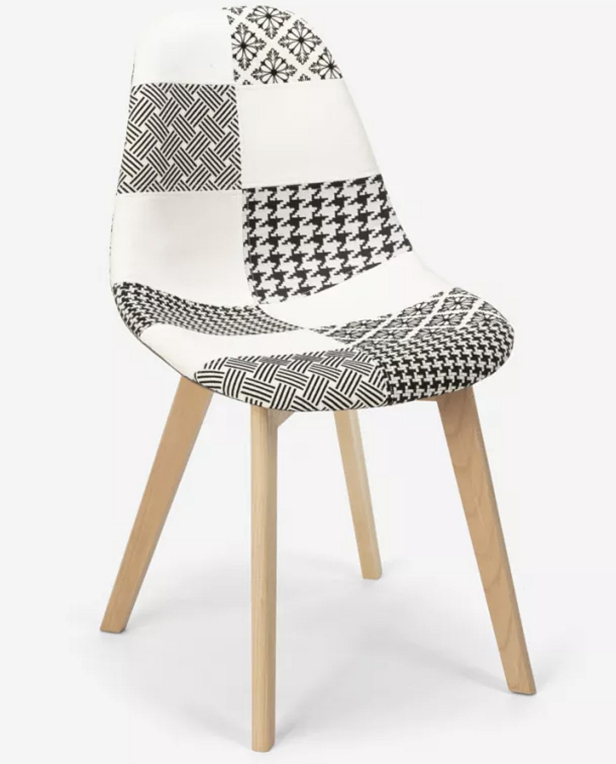 Chaise en tissu patchwork blanc, gris et pieds en bois naturel Vinto