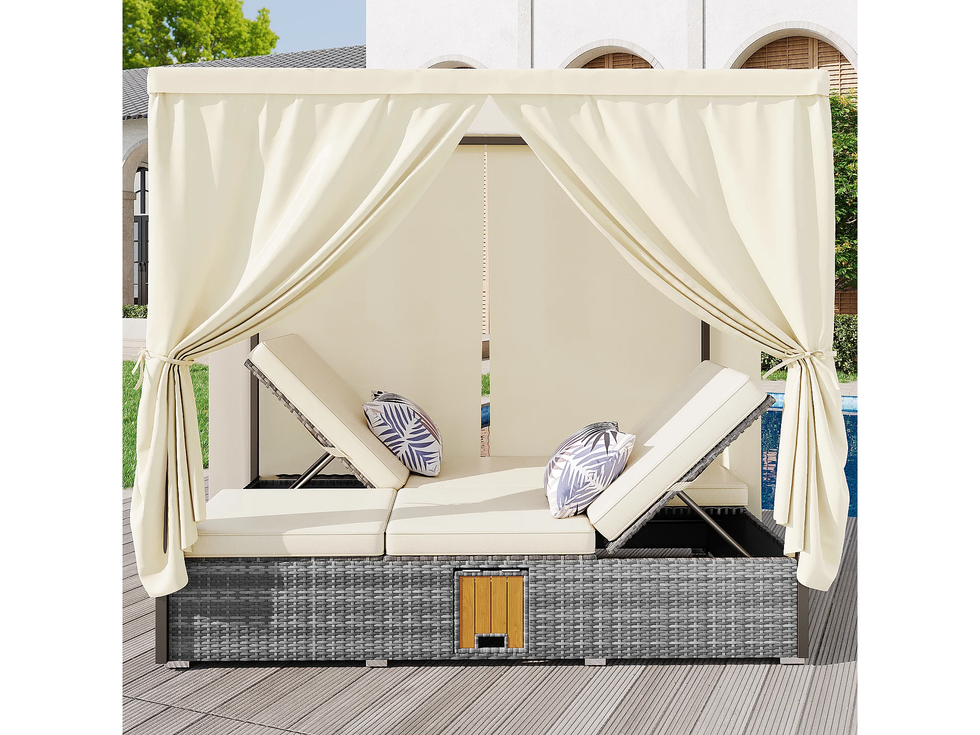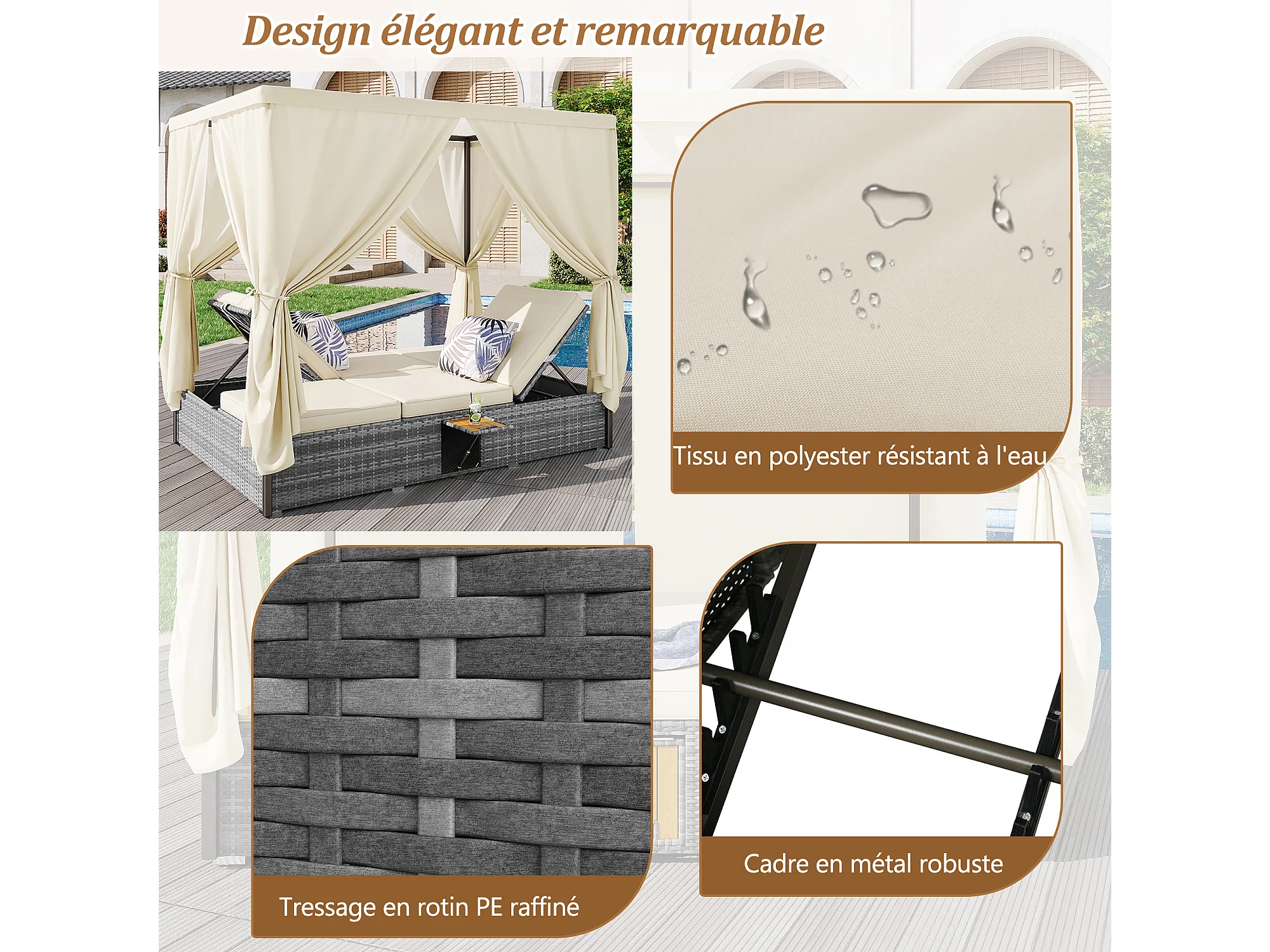 Chaise longue de jardin lit double avec parasol, chaise longue en rotin, coussins et table pliante avec coussins crème