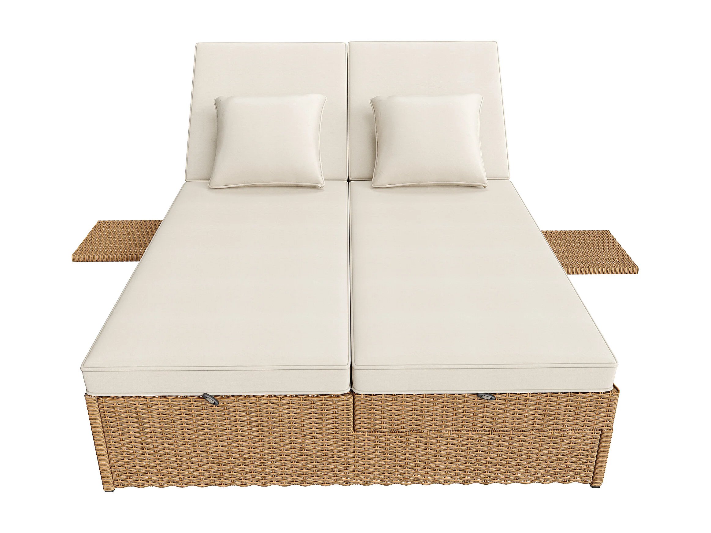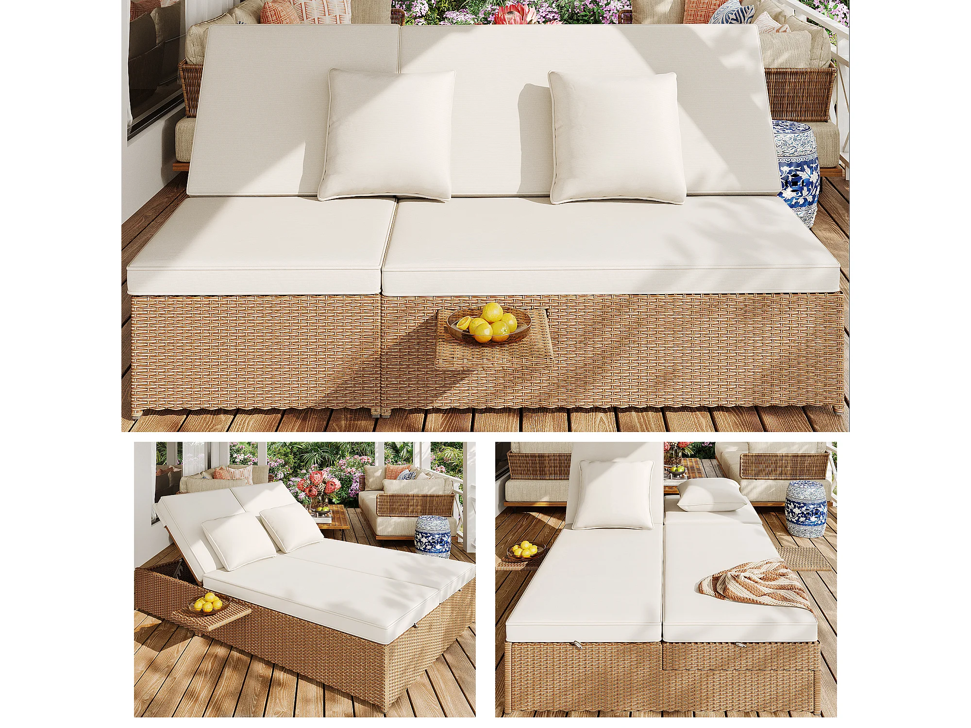 Chaise longue d'extérieur double, résistante aux intempéries, pliable avec coussin, blanche