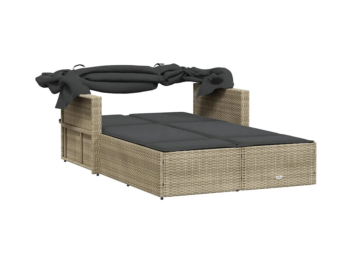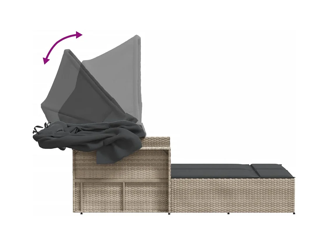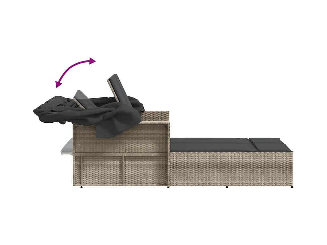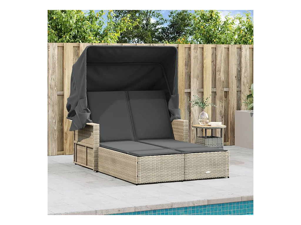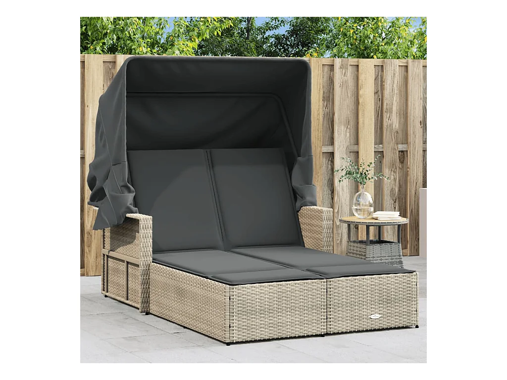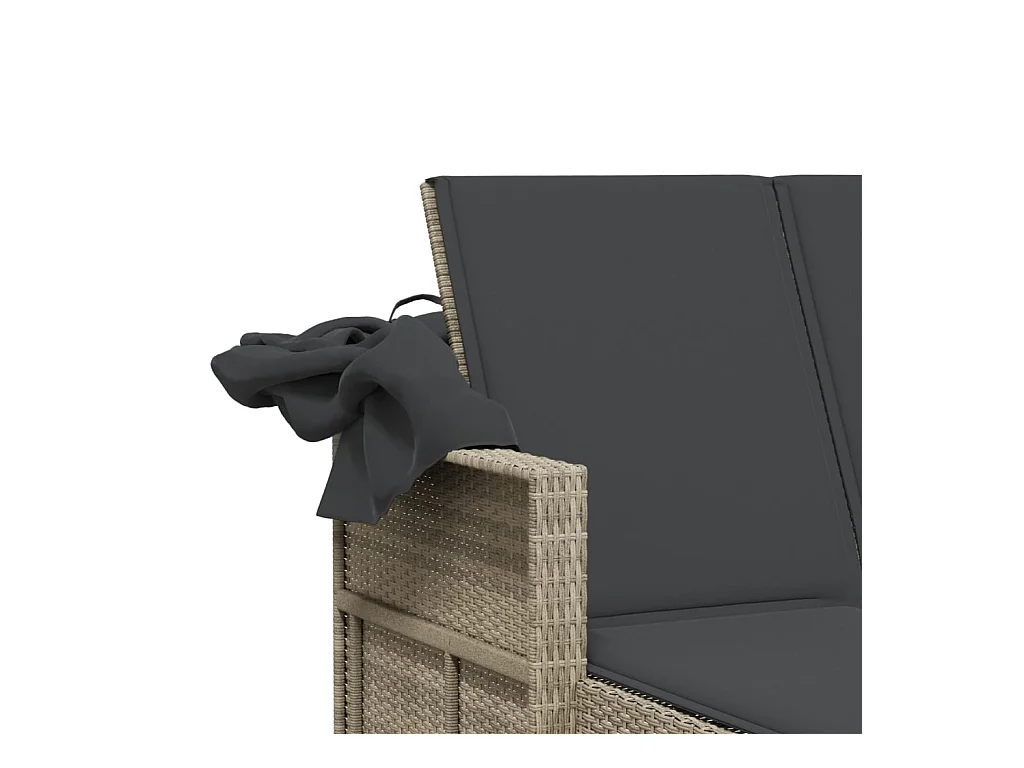 Chaise longue double avec auvent et coussins gris clair rotin